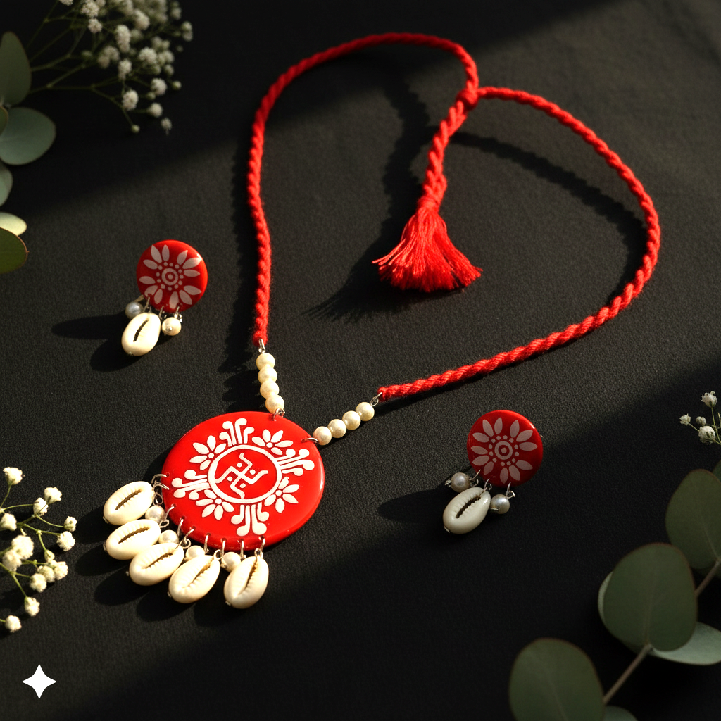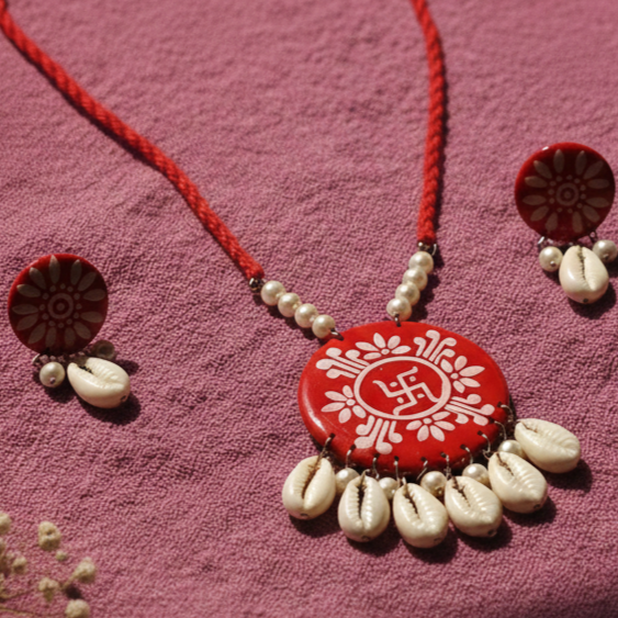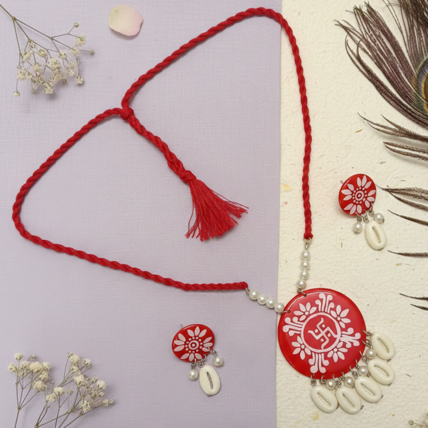 - PRODUCT DETAILS:This handcrafted circular pendant necklace set beautifully blends traditional artistry with modern elegance. The vibrant red pendant is detailed with delicate white hand-painted motifs, symbolizing ethnic charm and cultural richness. A thin red cord adorned with beads enhances the design, while elegant white shell dangles add movement and grace. The matching earrings mirror the circular motif and shell accents, creating a perfectly coordinated look.