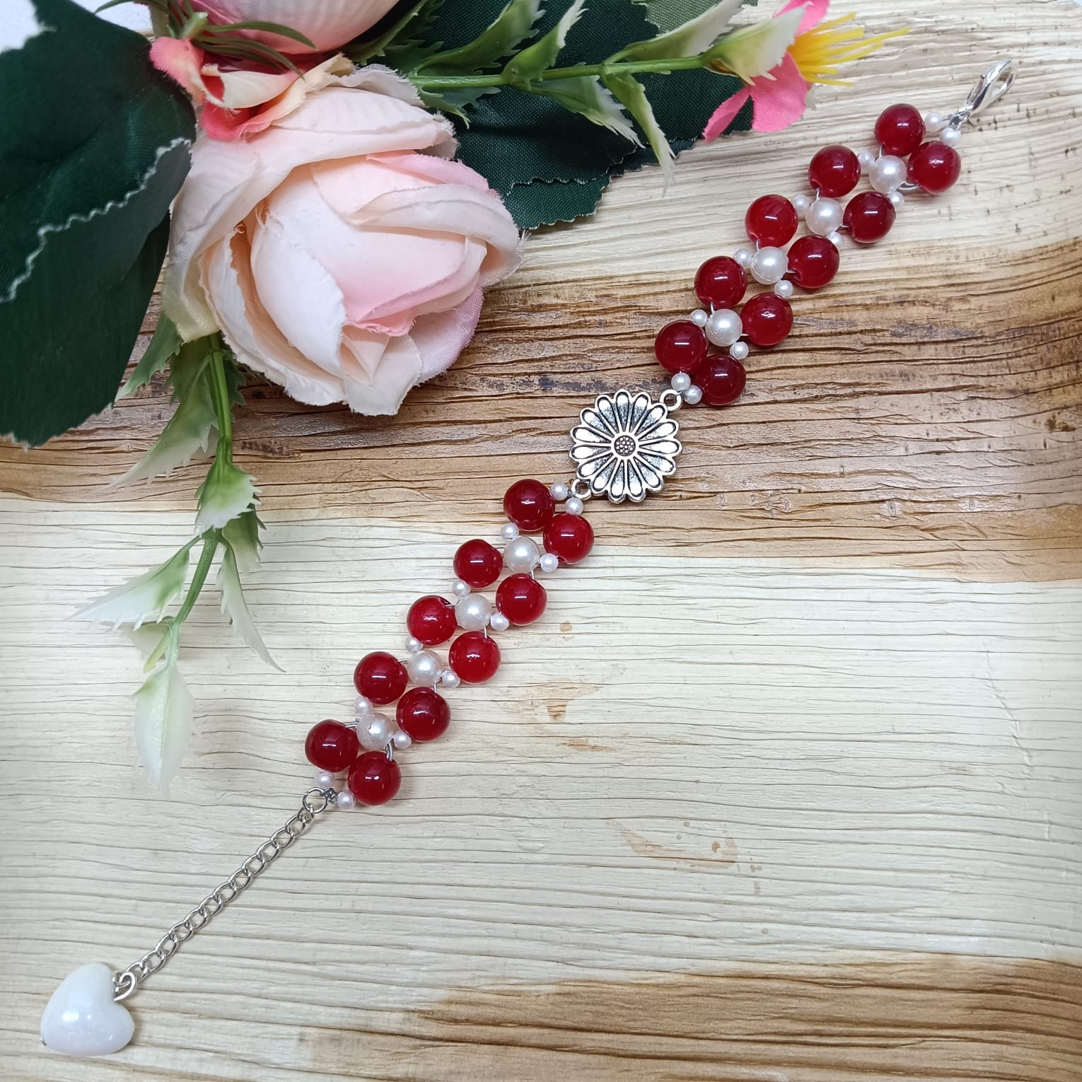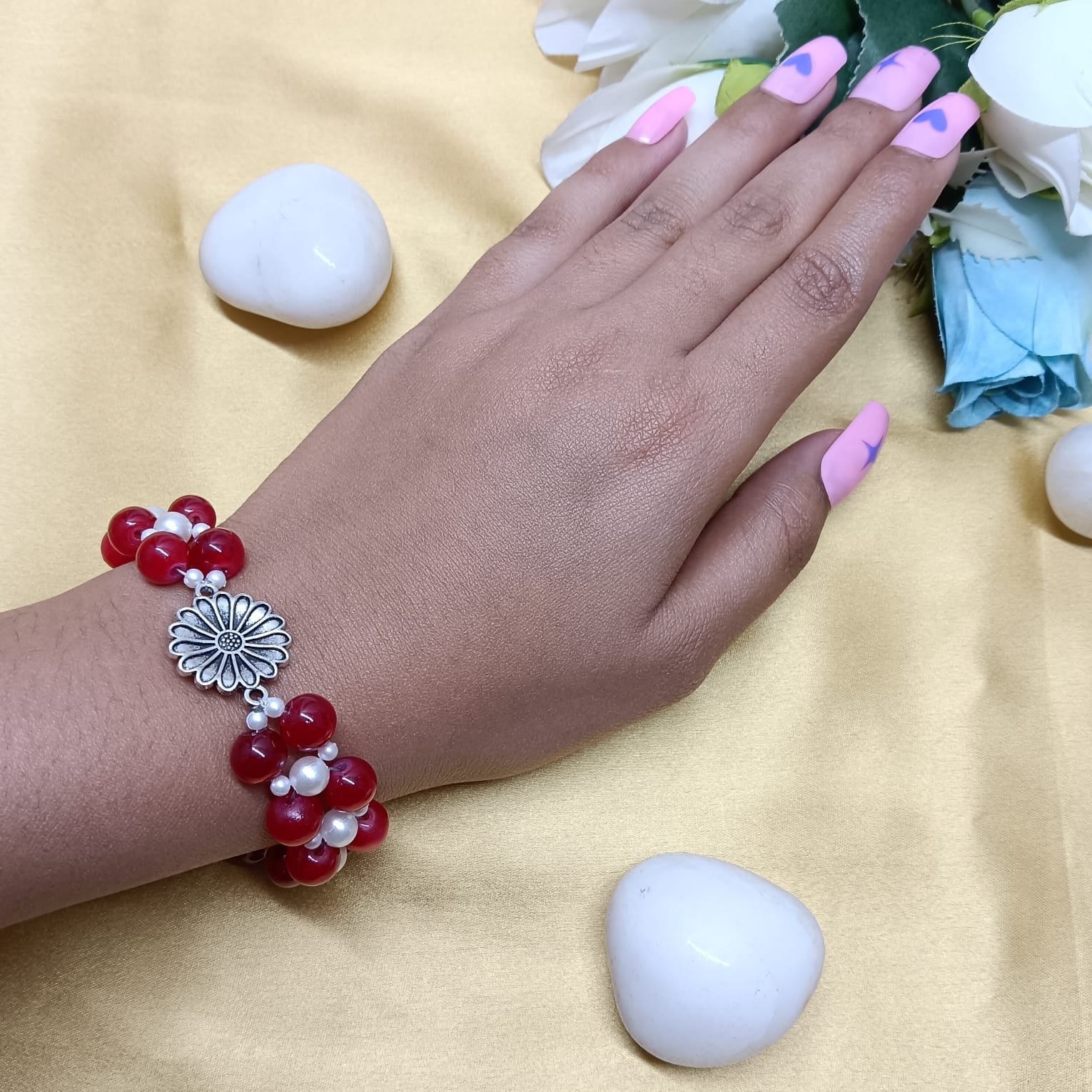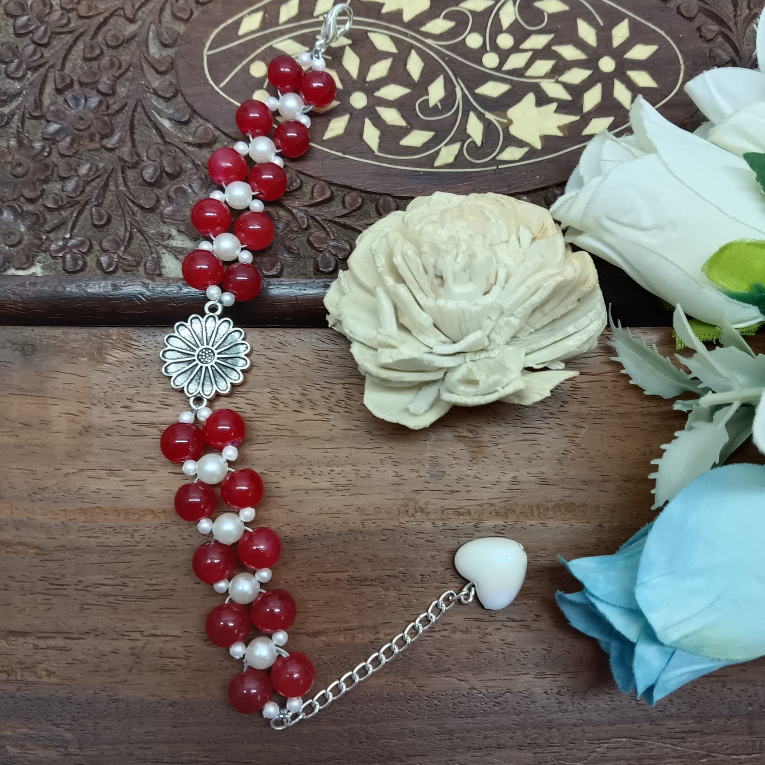 - PRODUCT DETAILS: This beautifully handcrafted bracelet features a graceful circular arrangement of two rows of alternating red and white spherical beads. At its base, a striking silver-toned floral centerpiece, crafted with multi-layered detailing, serves as a captivating focal point while elegantly connecting the strands. The top ends are thoughtfully finished with lobster clasp and link chain for versatile use whether worn or displayed. Expertly made using quality beads and a detailed metallic embellishment, this piece offers both decorative charm and cultural significance. Ideal for personal adornment, ceremonial offerings, or as an elegant addition to your look.