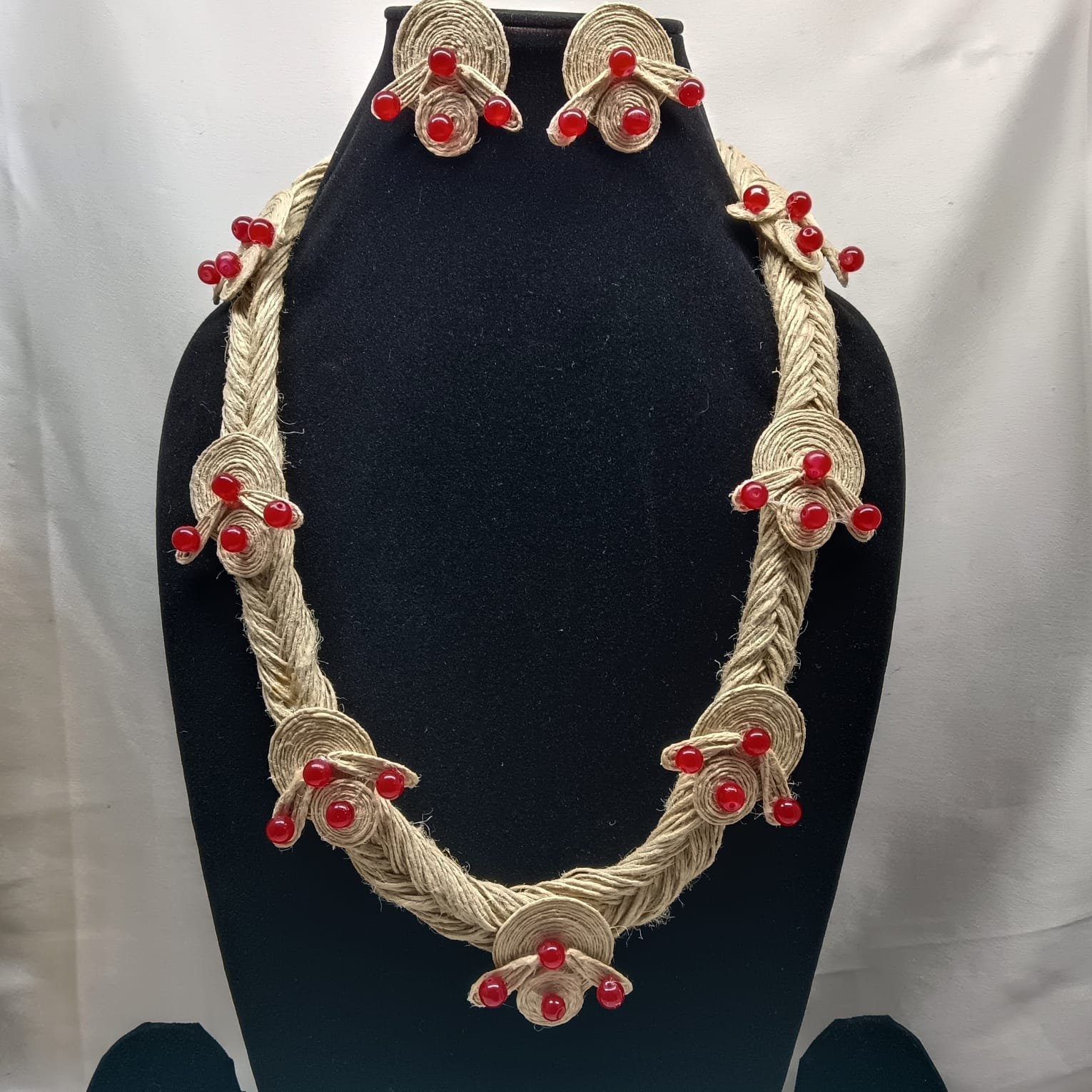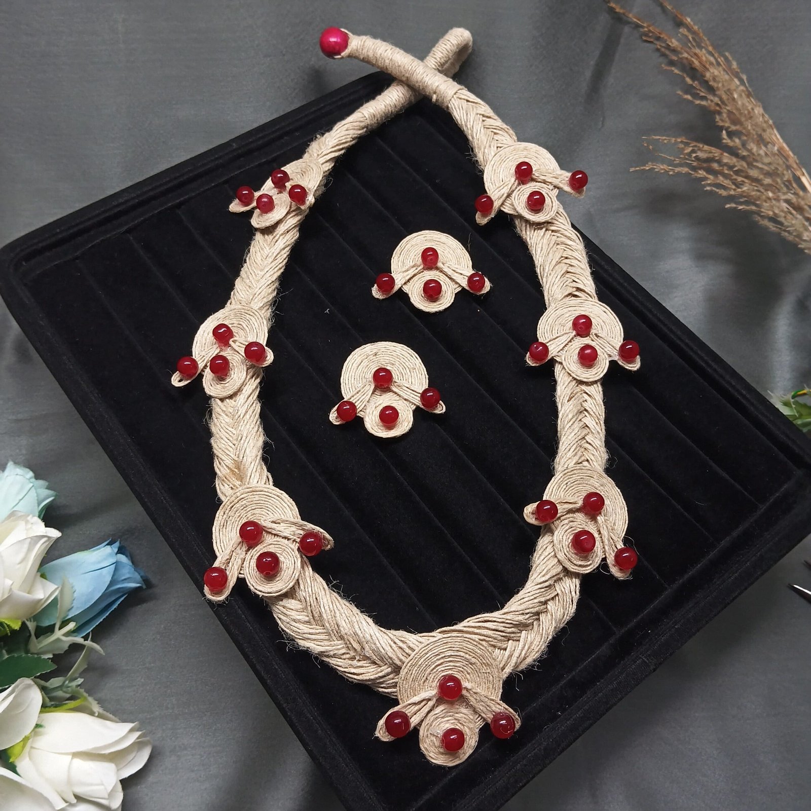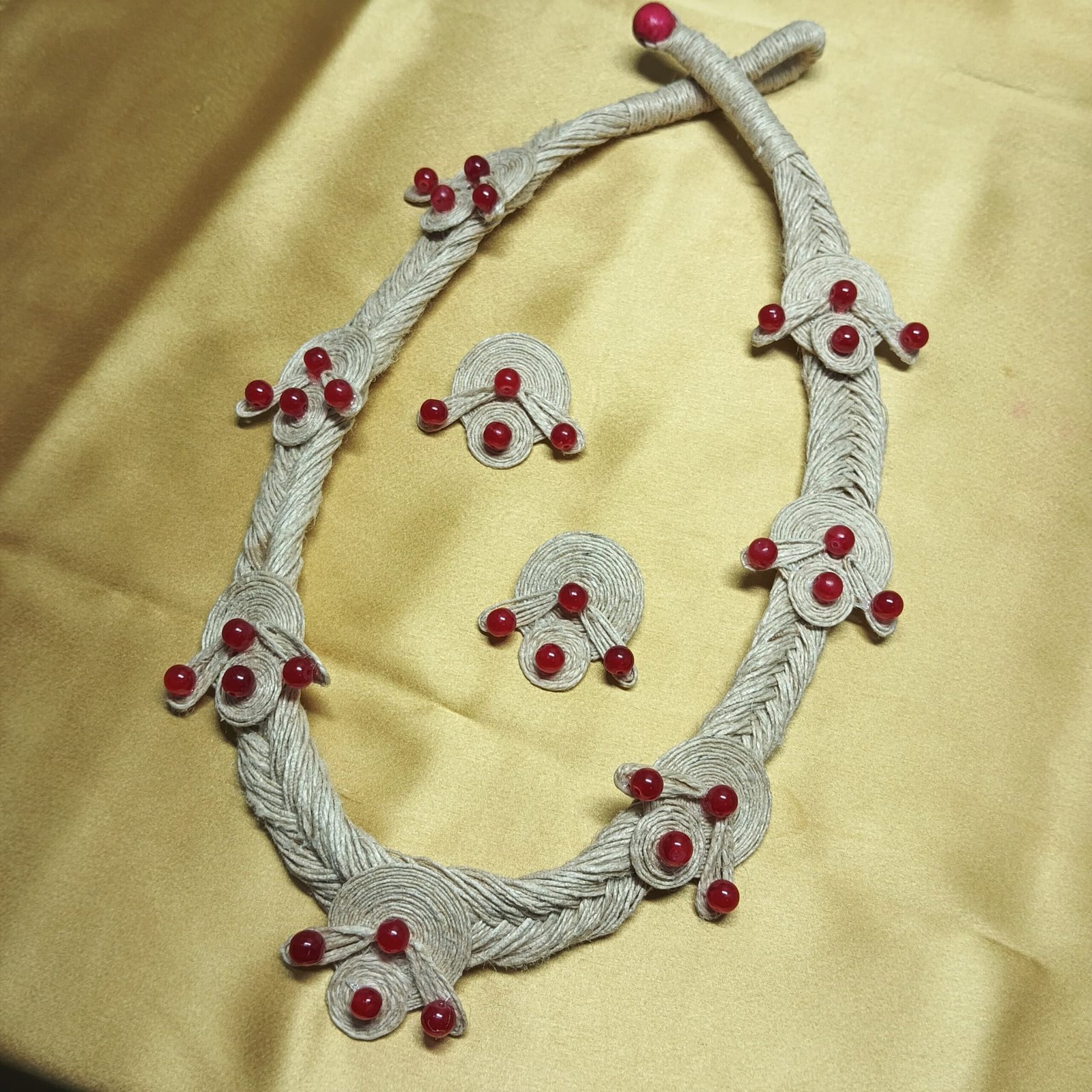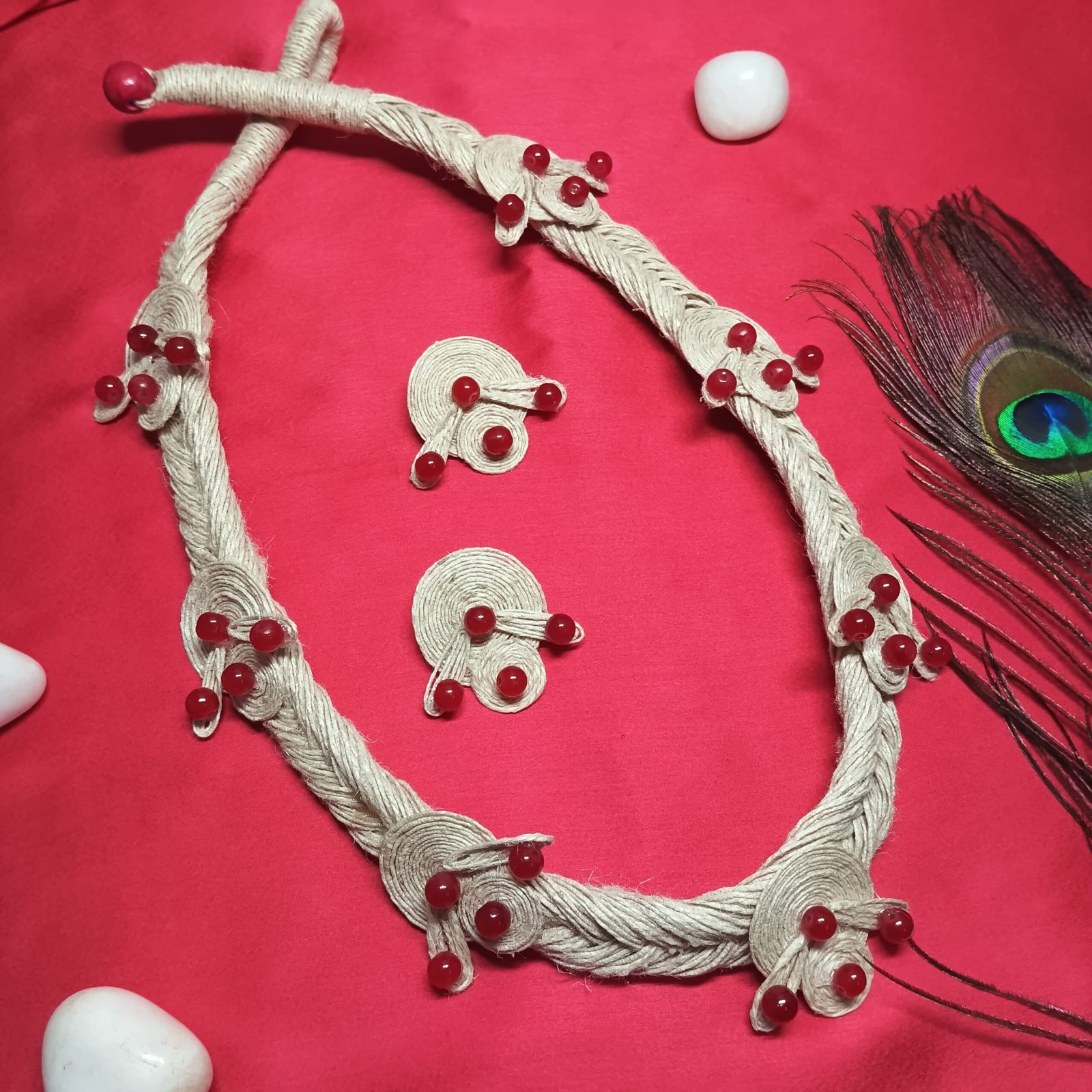 - PRODUCT DETAILS: Discover the perfect blend of rustic charm and contemporary elegance with this artisan-crafted jute jewelry set. Featuring a finely braided jute necklace and matching earrings, each piece is decorated with vibrant red beads for a striking visual touch. Crafted from sustainable, natural jute fiber, this set is lightweight and comfortable—ideal for occasions wear . Whether paired with ethnic attire or modern ensembles, its bold yet harmonious design brings an effortless style to every occasion.