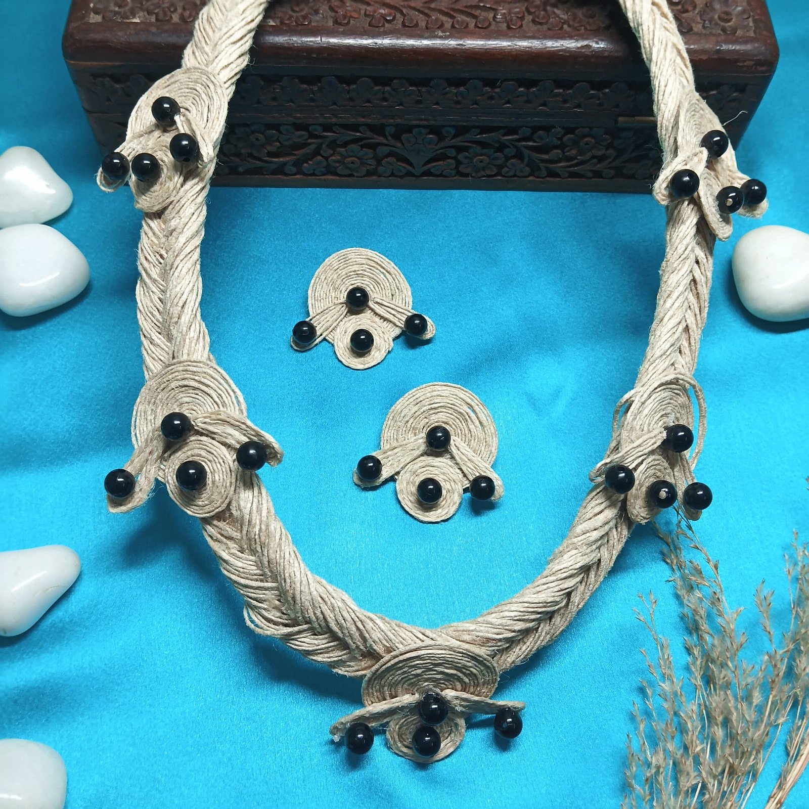 - PRODUCT DETAILS: Elevate your style with this eco‑conscious jewelry set, artisan‑crafted from natural jute fibers and adorned with sleek black beads. Each piece is meticulously handcrafted by skilled artisans, bringing together sustainable materials and timeless elegance. Lightweight yet eye‑catching, this set is perfect for everyday wear or special occasions, enhancing both casual and ethnic ensembles with its earthy charm.