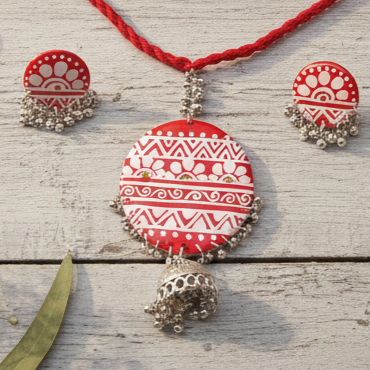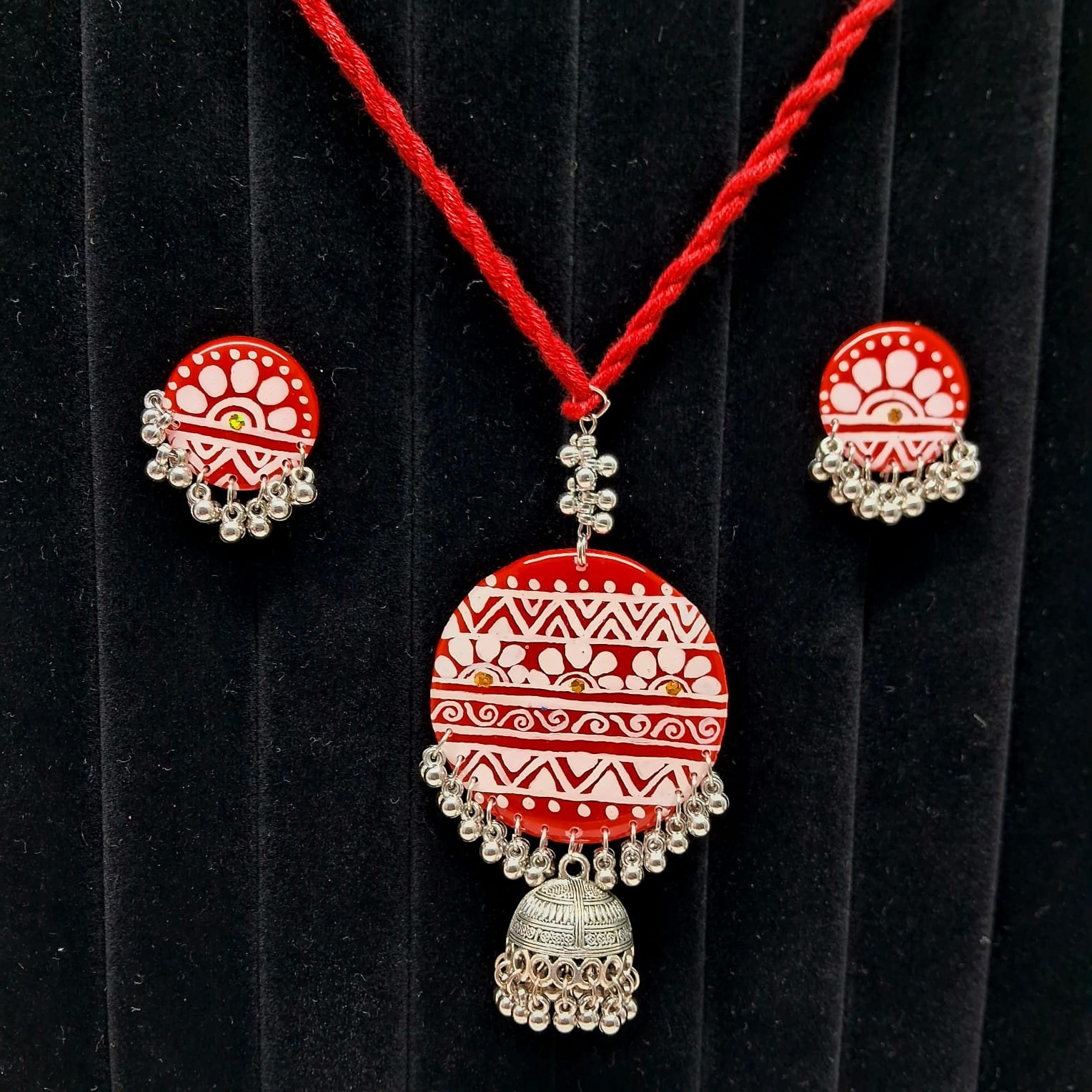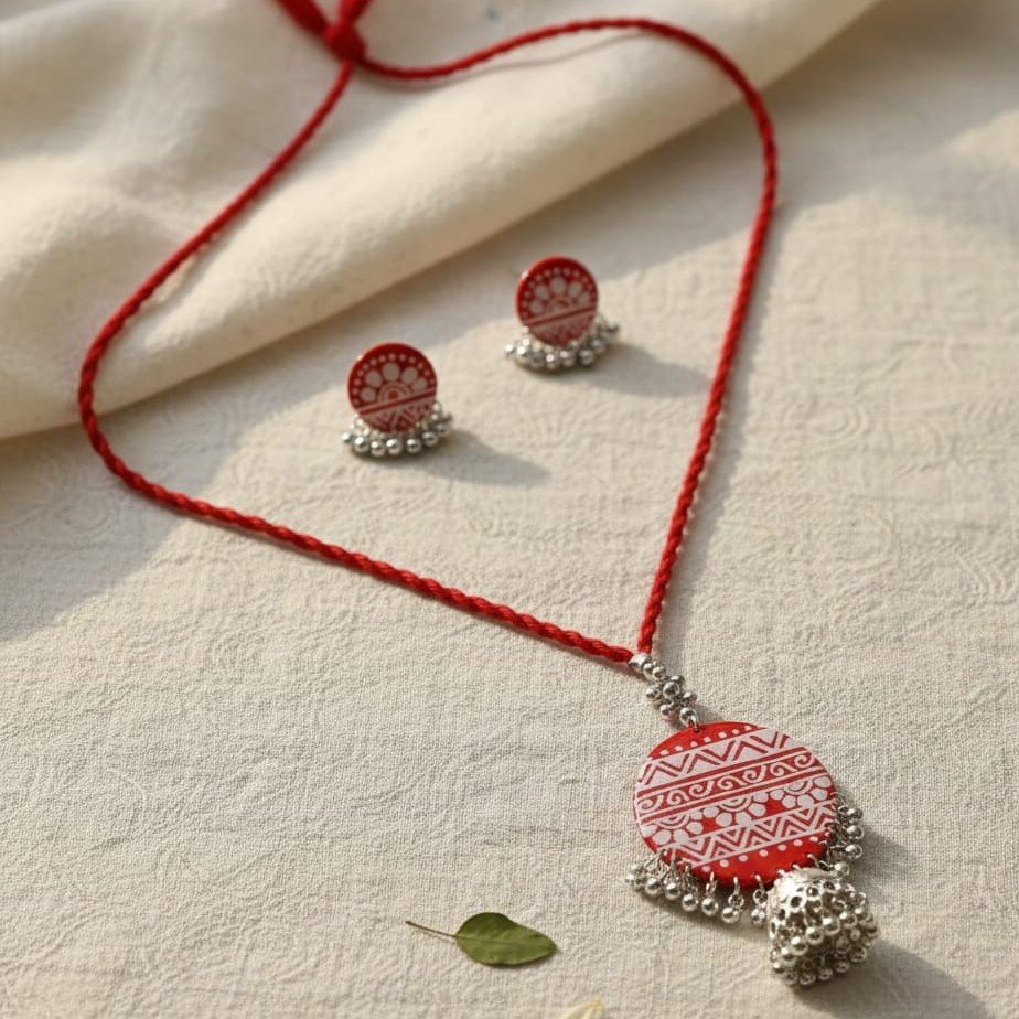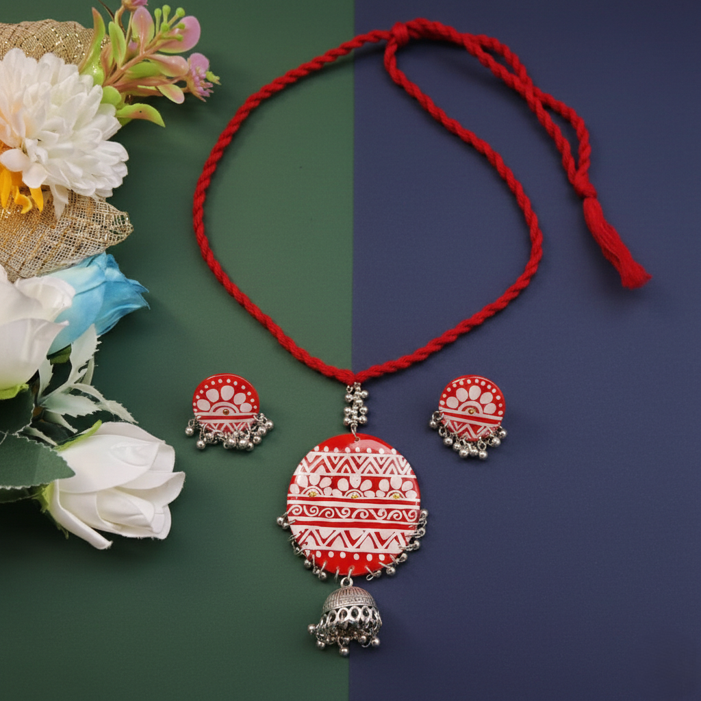 - PRODUCT DETAILS: Celebrate traditional elegance with this handcrafted jewelry set featuring a round pendant and matching earrings. The design highlights intricate hand-painted motifs in red and white, inspired by traditional Indian folk art. The pendant is suspended from a braided red thread, while silver-toned jhumka-style bells and subtle gold-colored accents add ethnic charm. The matching earrings echo the same artistry with coordinated motifs and jhumka embellishments, making this set perfect for festive occasions, casual ethnic wear, or as a standout statement accessory.