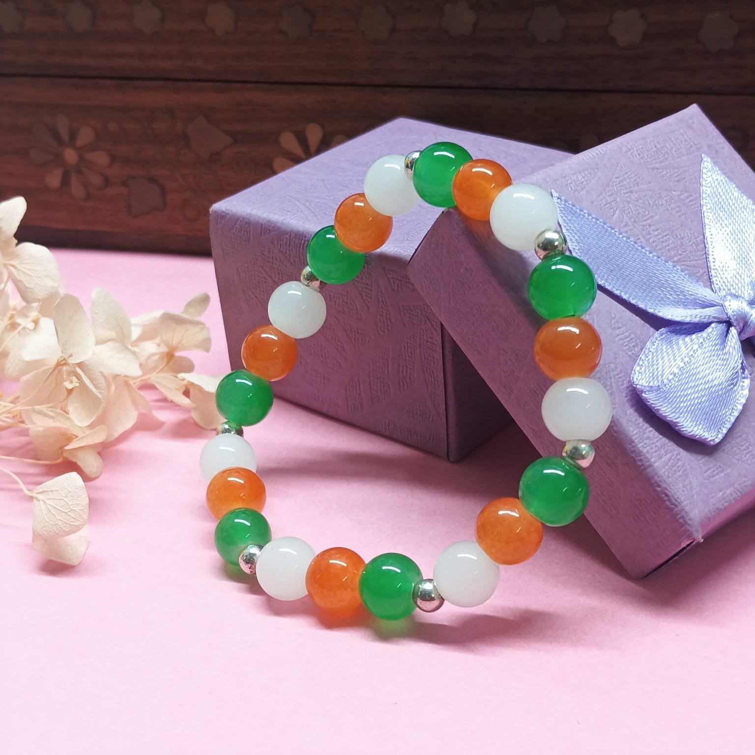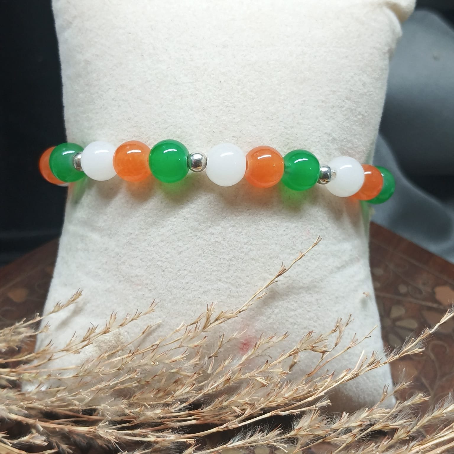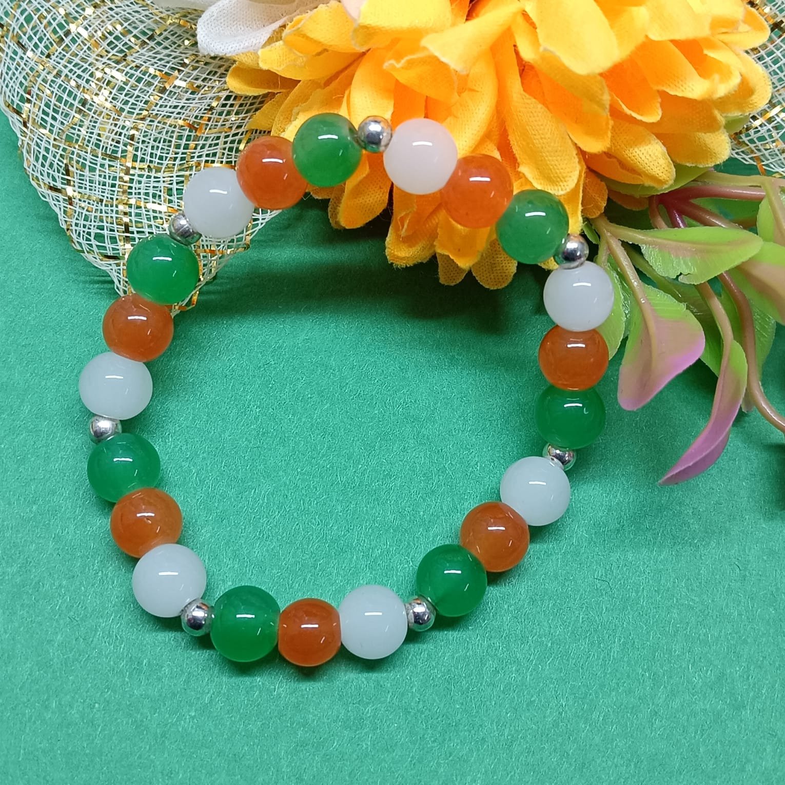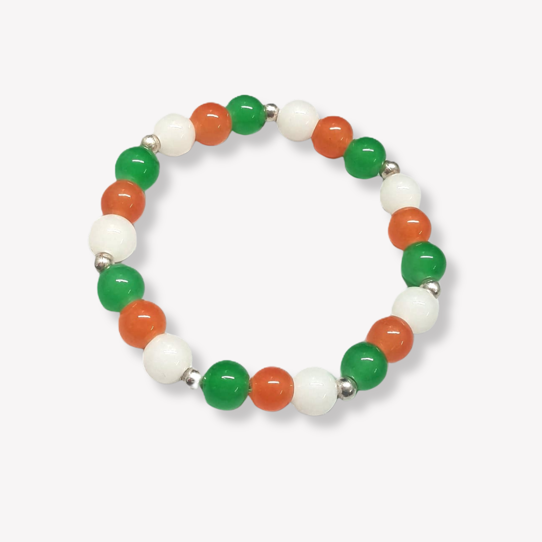 - PRODUCT DETAILS: This handcrafted beaded bracelet features a bold and balanced combination of green, white, and orange beads, designed with a smooth, polished finish for a refined and stylish appearance. The beads are strung on a durable, stretchable cord, offering a comfortable and adjustable fit for most wrist sizes. The distinctive color arrangement may hold cultural or personal significance, particularly in representing national flag of India, Suitable for both casual and formal occasions, this bracelet combines simplicity with meaningful design.