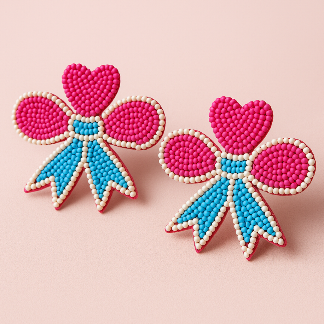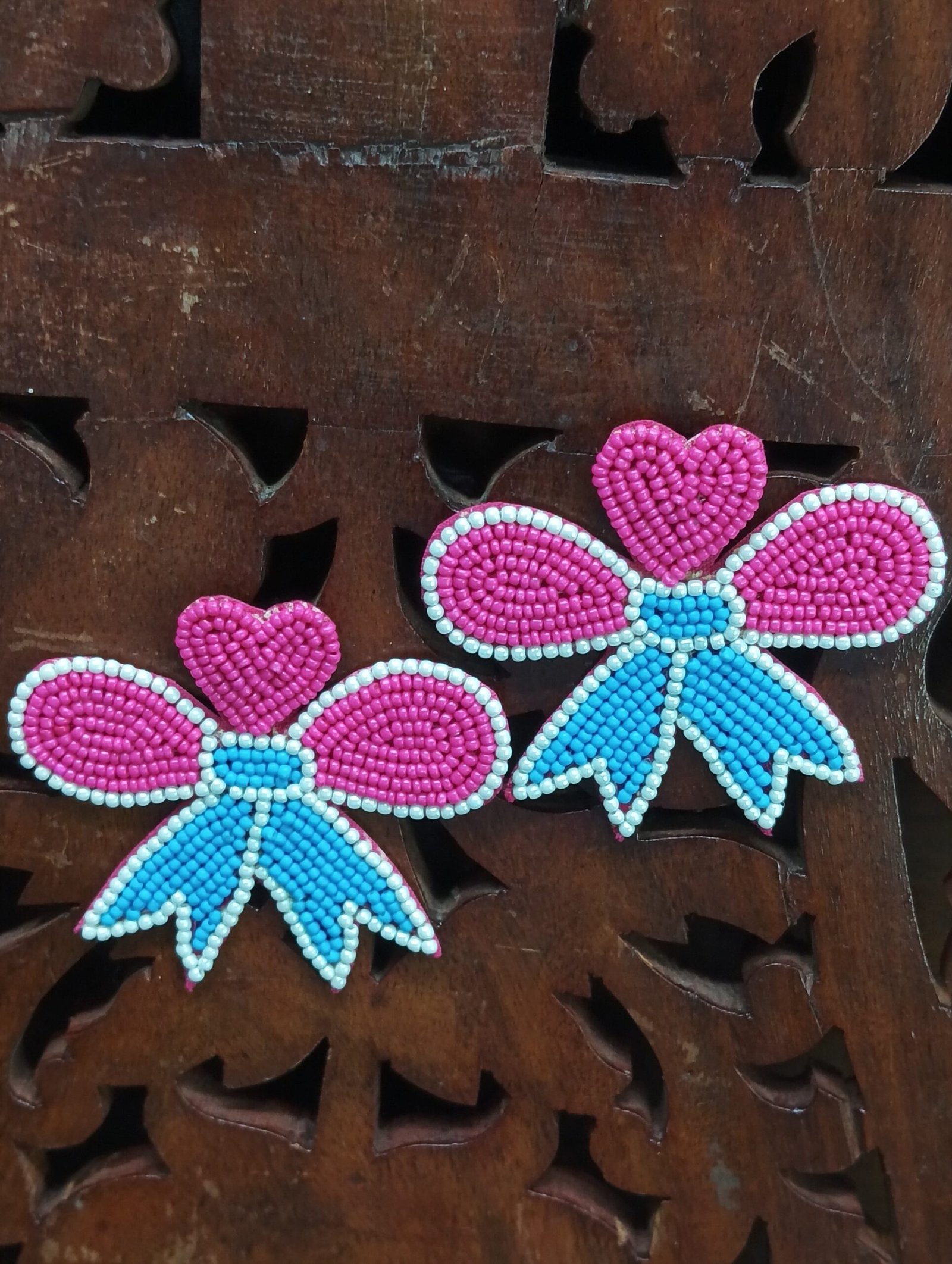 - PRODUCT DETAILS: These handmade earrings showcase a charming floral design, featuring a pink beaded heart-shaped center surrounded by three light blue petals outlined in white beads. Crafted with intricate embroidery, they offer a vibrant and elegant look. Lightweight and comfortable, these earrings are perfect for casual outings, festive celebrations, and party wear. Their artistic craftsmanship and eye-catching colors make them a thoughtful gift choice for someone special.