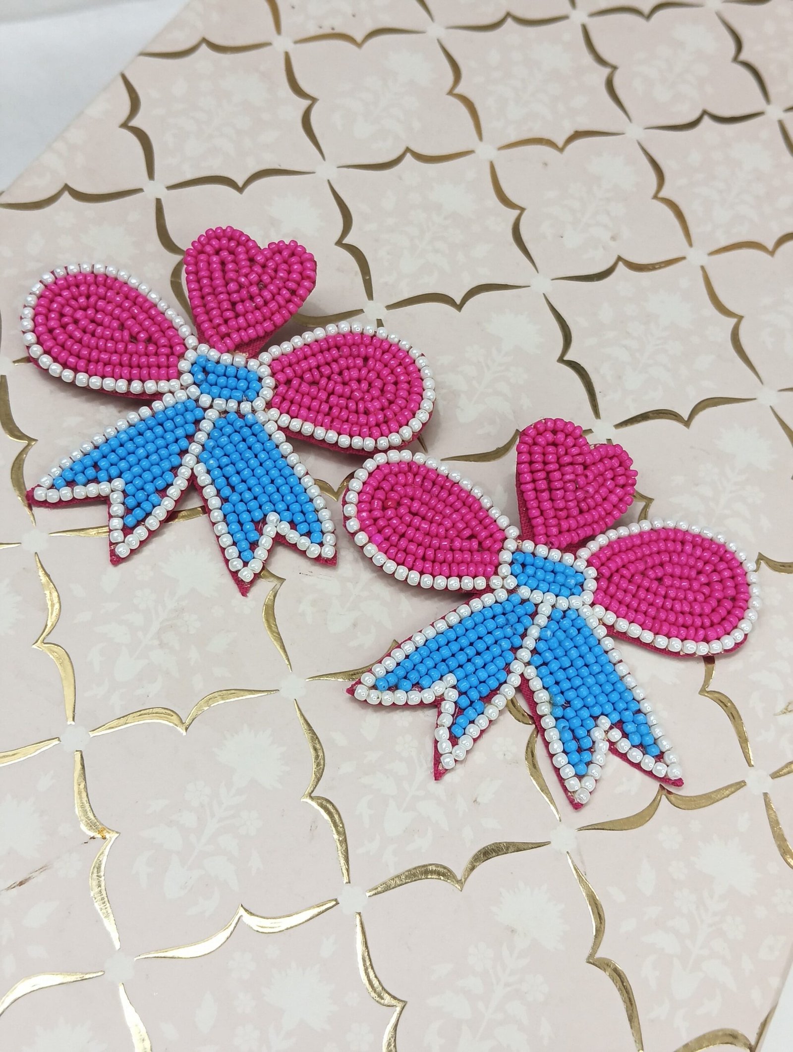 Pink Beaded Heart & Light Blue Petals | Lightweight Boho Jewelry with Intricate Embroidery | Elegant Gift for Casual & Party Wear