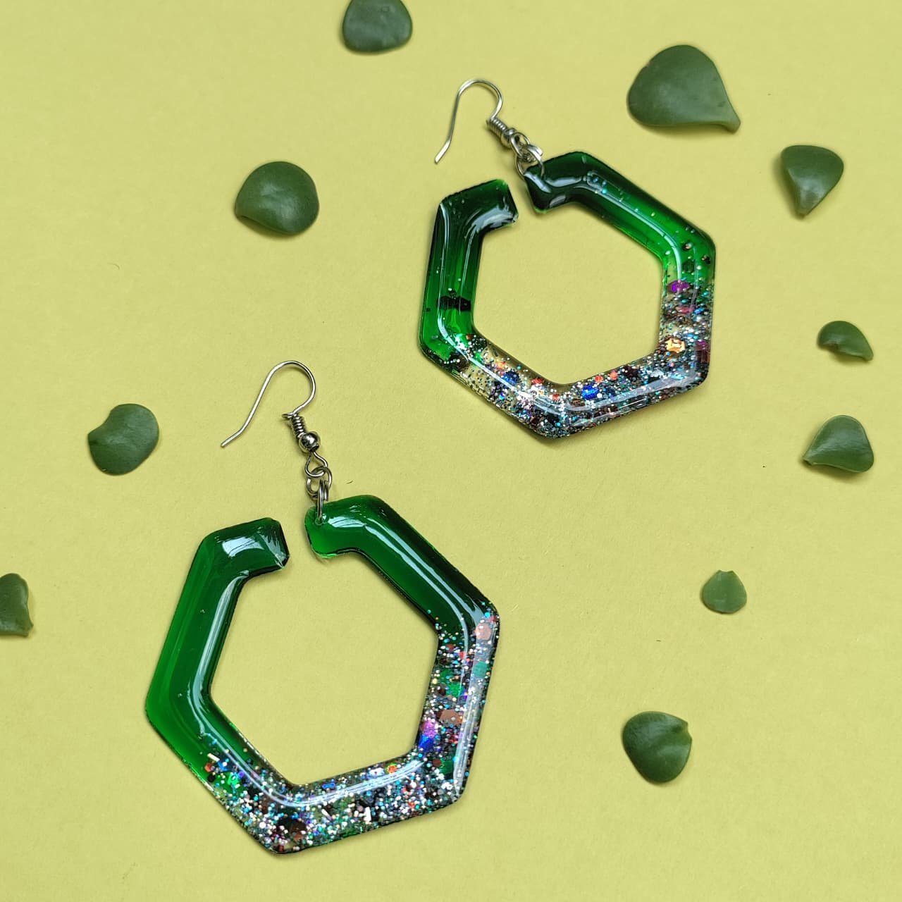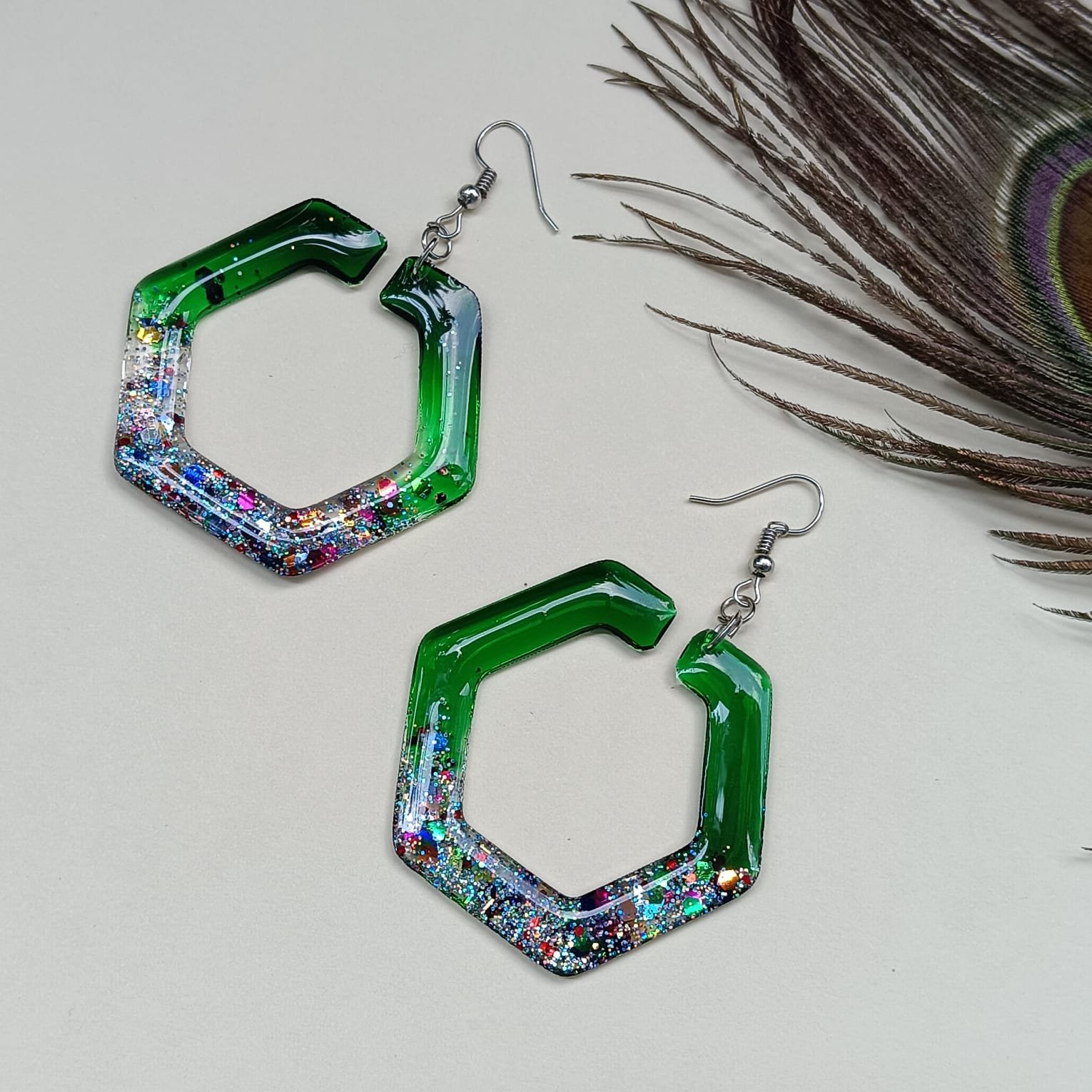 - PRODUCT DETAILS: Make a bold style statement with these hexagon-shaped resin dangle earrings, designed in a vibrant green hue with sparkling glitter accents. The unique geometric design adds a modern twist, while the glitter detailing catches the light beautifully, making these earrings perfect for both day and night looks. Crafted from lightweight resin, they are comfortable for all-day wear and secured with fishhook closures for easy use. Ideal for casual outings, parties, festivals, or gifting, these earrings effortlessly combine trendy fashion with playful elegance.