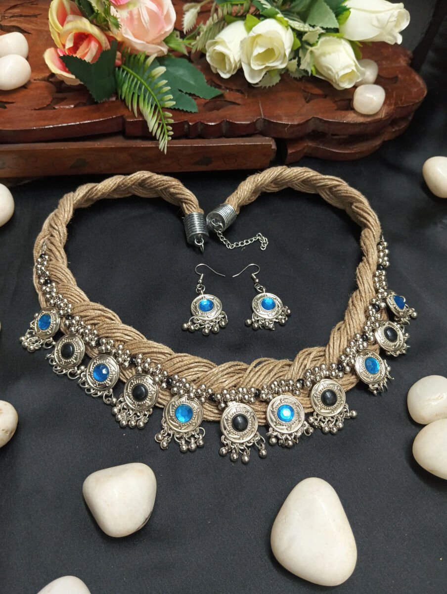 - PRODUCT DETAILS: This handcrafted jute necklace set blends traditional charm with modern elegance. The necklace features a thick, braided jute cord as its base, adorned with silver-toned metal settings, each holding a striking blue or black bead for a vibrant contrast. Delicate ghungroo bells dangle gracefully from the metal accents, adding a soft, musical touch with every movement. The set is paired with matching German silver earrings, designed with blue beads and intricate metalwork that complements the necklace beautifully. Lightweight, adjustable, and eco-friendly, this jewelry set ensures comfort while making a bold style statement. Perfect for festive occasions, casual outings, boho-chic looks, and ethnic wear, this elegant jute necklace set pairs effortlessly with both Indian and Western outfits for a unique, artisanal touch.