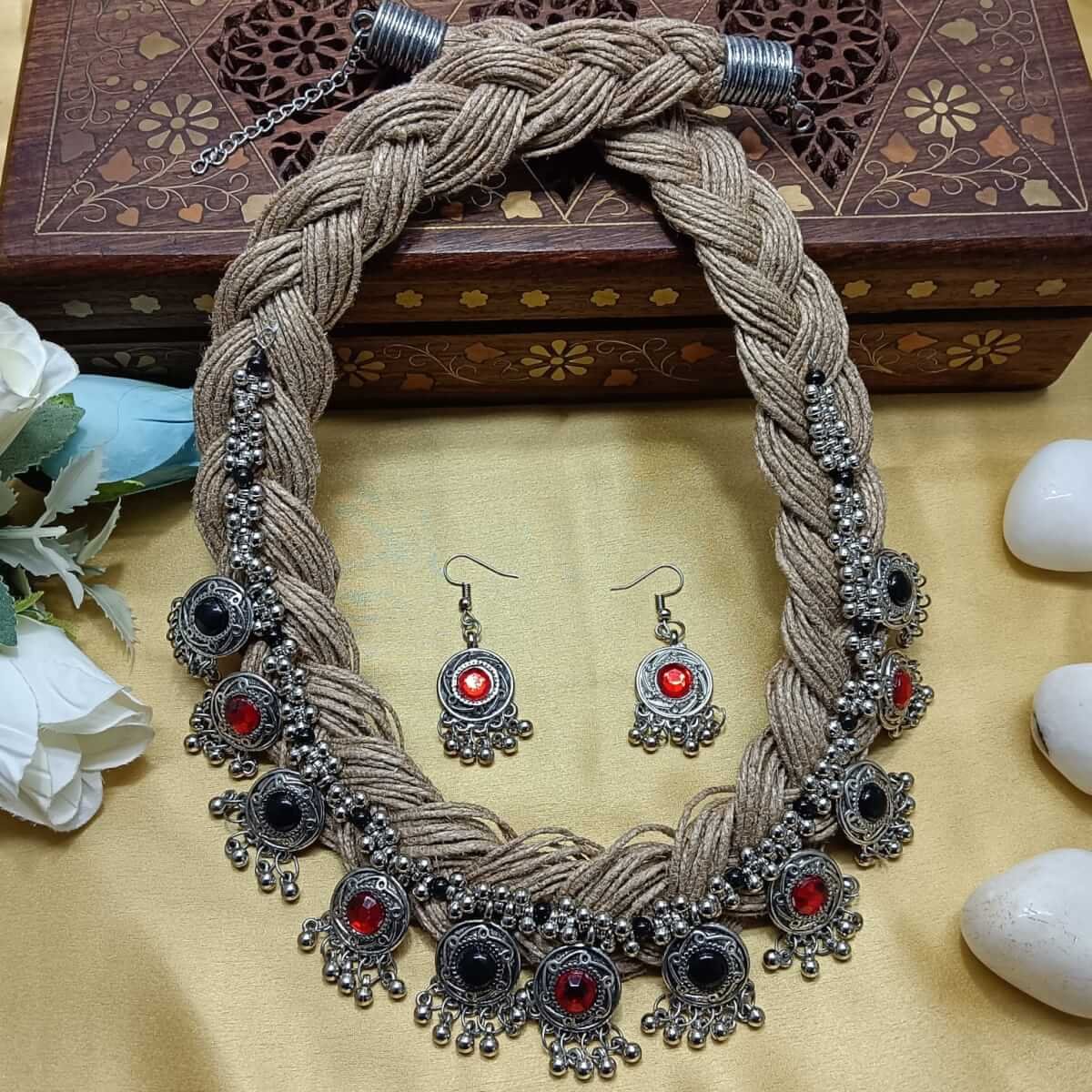 - PRODUCT DETAILS: This handcrafted jute necklace set blends traditional charm with modern elegance. The necklace features a thick, braided jute cord as its base, adorned with silver-toned metal settings, each holding a striking blue or black bead for a vibrant contrast. Delicate ghungroo bells dangle gracefully from the metal accents, adding a soft, musical touch with every movement. The set is paired with matching German silver earrings, designed with blue beads and intricate metalwork that complements the necklace beautifully. Lightweight, adjustable, and eco-friendly, this jewelry set ensures comfort while making a bold style statement. Perfect for festive occasions, casual outings, boho-chic looks, and ethnic wear, this elegant jute necklace set pairs effortlessly with both Indian and Western outfits for a unique, artisanal touch.