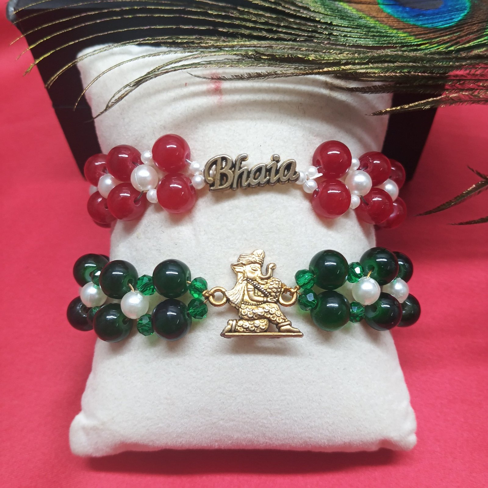 Set of 2 Designer Rakhis for Brother with Roli Chawal for Traditional Celebration | Handmade Rakhis with Bhaiya & Ganesha Charms Green & Red Beaded Pearl
