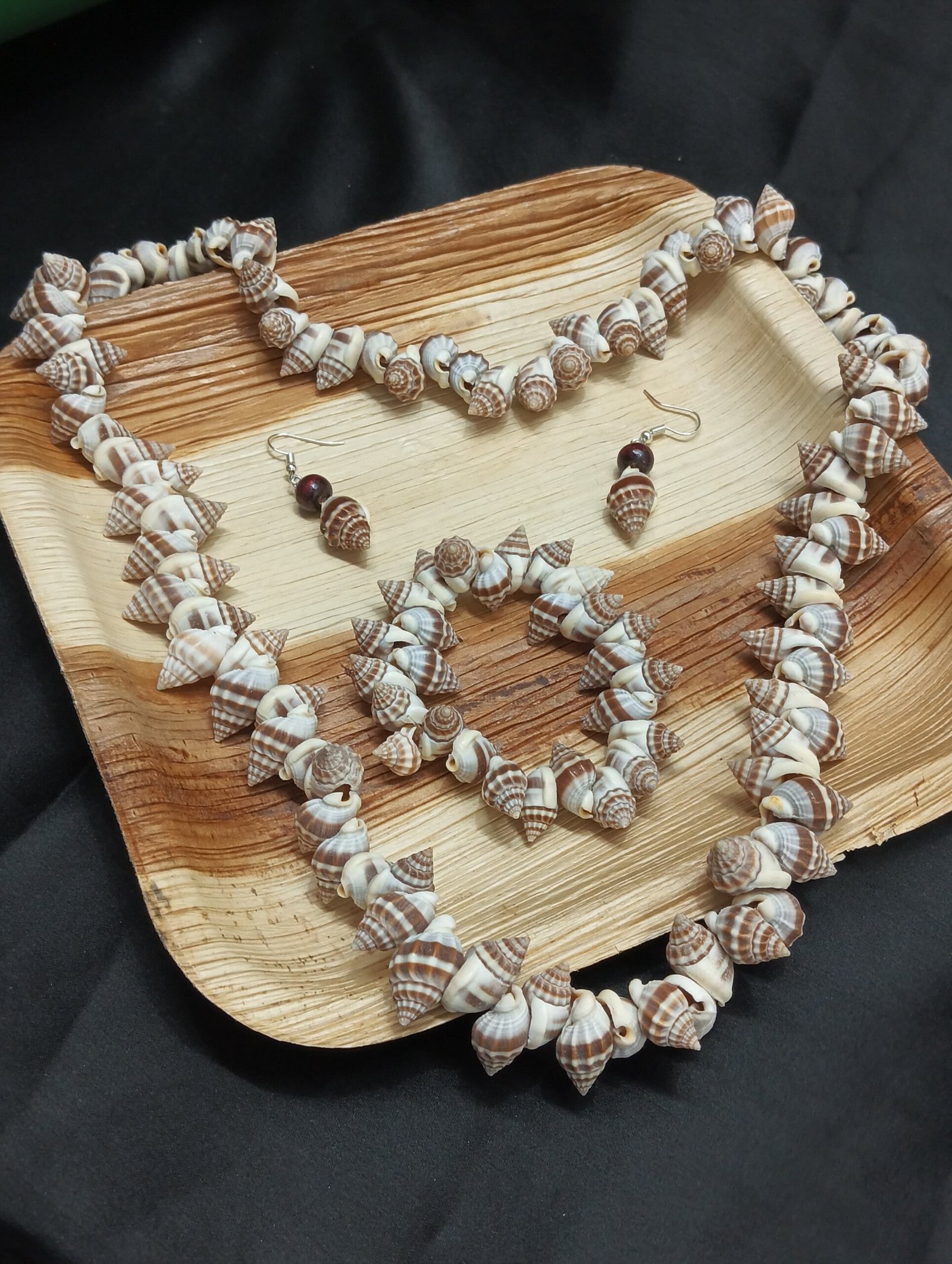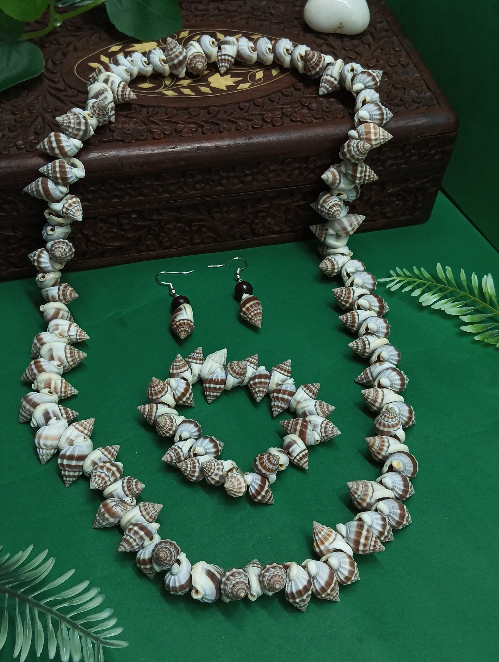 Handmade Spiral Shell Necklace Jewelry Set with Earrings and Beacelet for Women| White & Brown Shell Necklace for Boho and Beach occasion