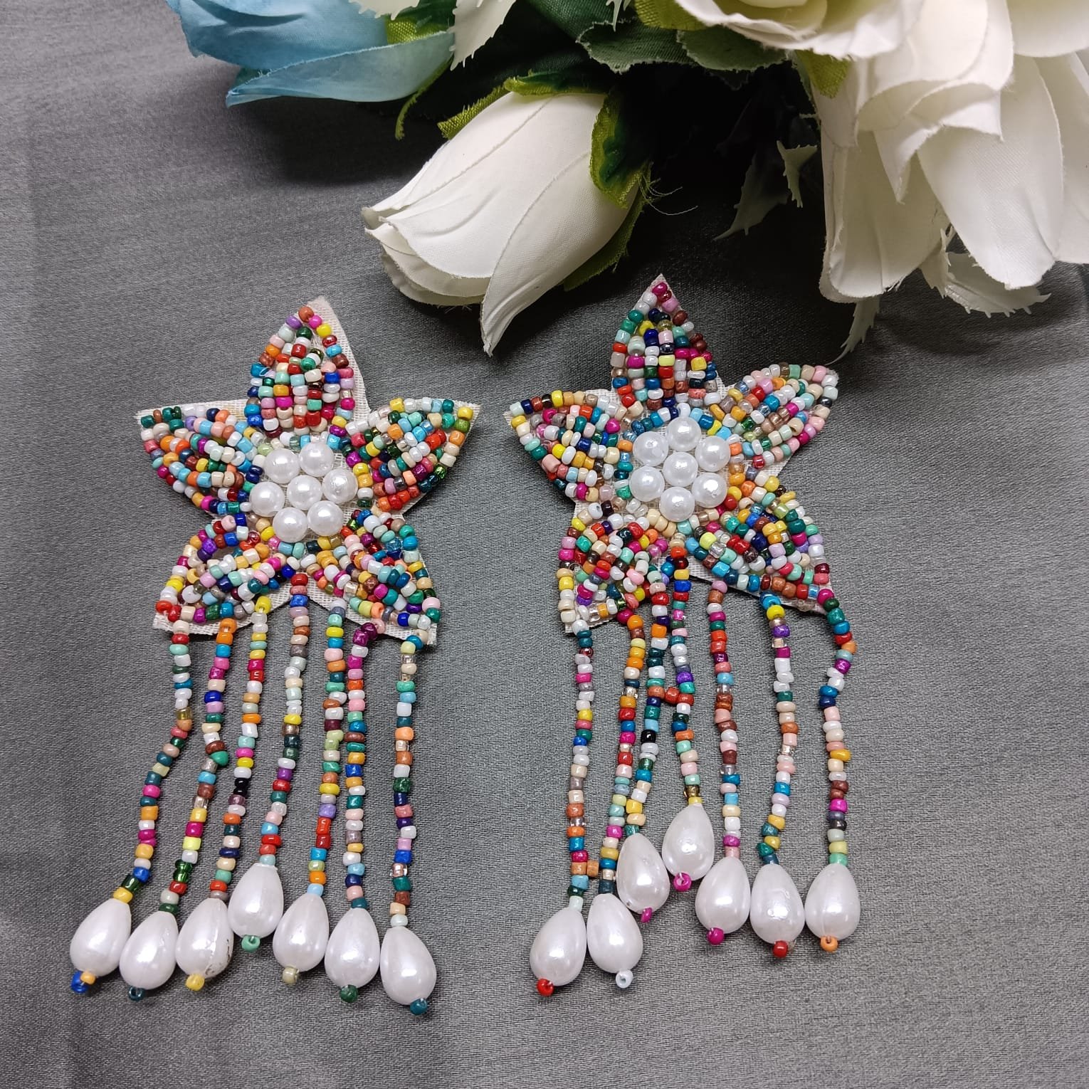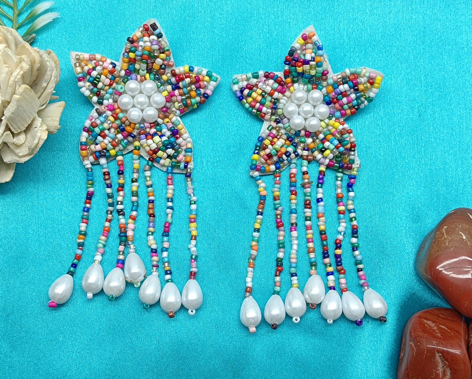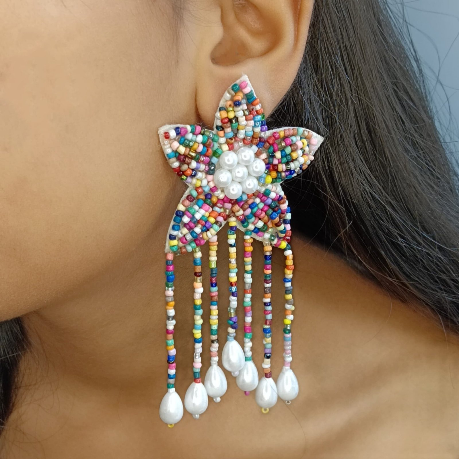 - PRODUCT DETAILS: Add a splash of color and charm to your style with these eye-catching, handmade, star-shaped earrings. Crafted with a vibrant mix of colorful seed beads, the playful star design is elevated by a cluster of small white pearls at the center, bringing a refined touch of elegance. From the base of each star, fringes of beaded strands cascade down, ending in teardrop-shaped white beads that sway gracefully with every movement. Lightweight yet bold, these earrings bring a bohemian flair to casual looks and festival-ready outfits alike.