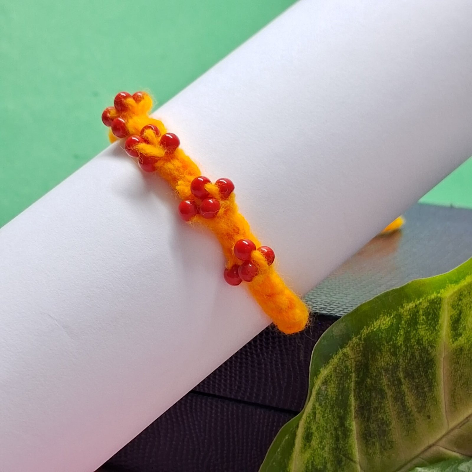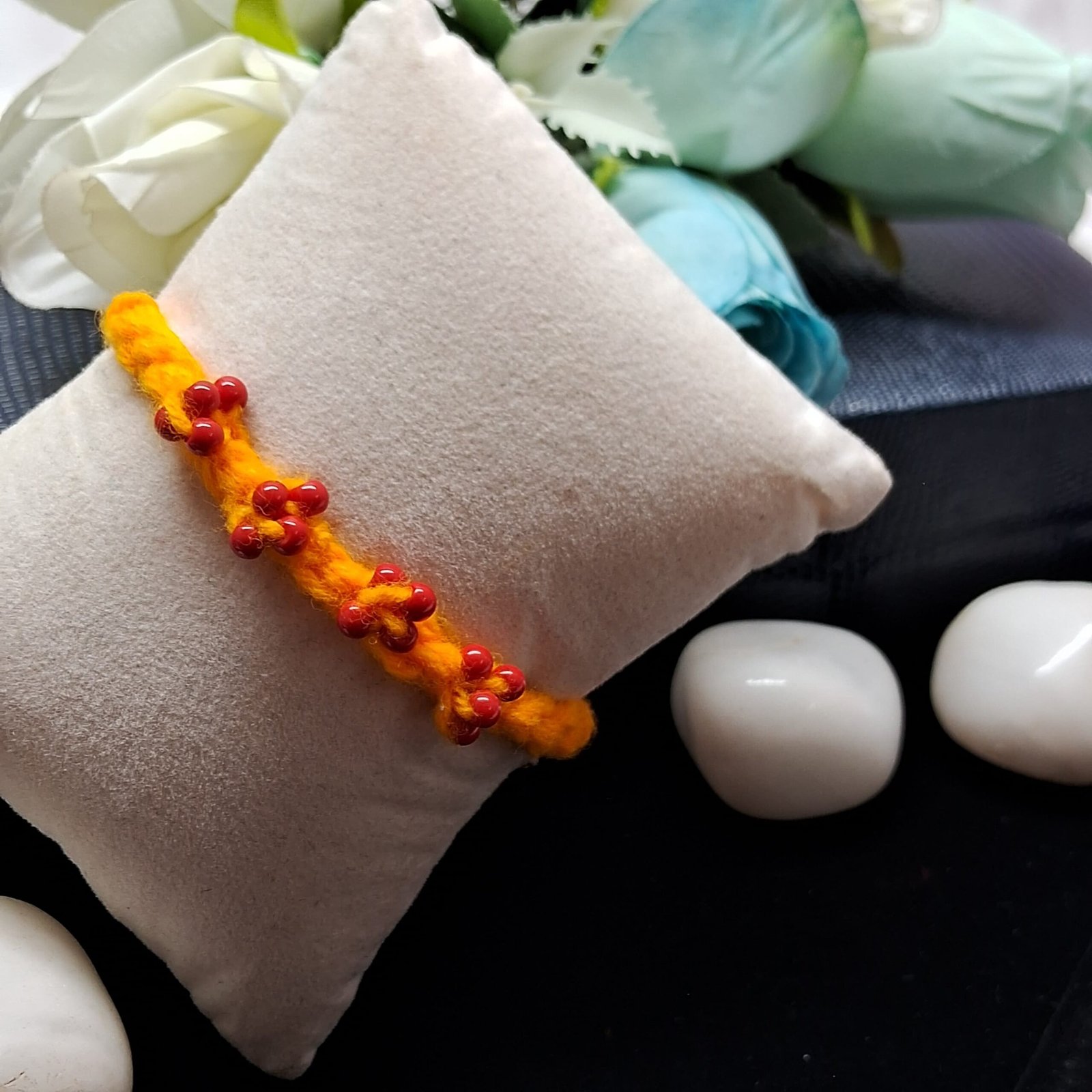- PRODUCT DETAILS: This handmade woolen rakhi is a heartfelt symbol of sibling love, blending simplicity with traditional charm. Made from soft yellow wool and adorned with delicate red beads, it’s perfect for brothers who appreciate a more understated and classic design. Lightweight and comfortable, it’s ideal for all-day wear during Raksha Bandhan. The set also includes roli and chawal, honoring every part of the sacred ritual. Whether you’re tying it on your younger brother or elder one, this rakhi adds a warm personal touch to your celebration. Celebrate Raksha Bandhan with a rakhi that’s lovingly made and deeply meaningful.