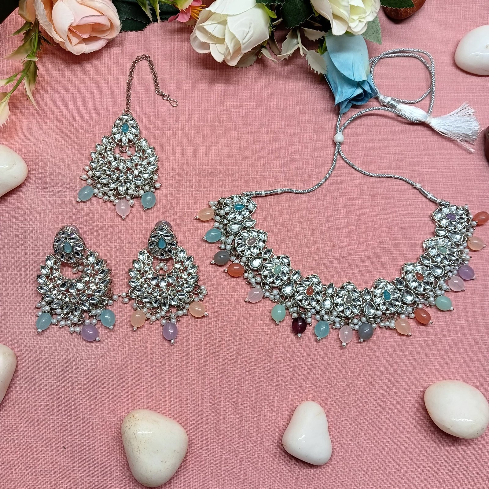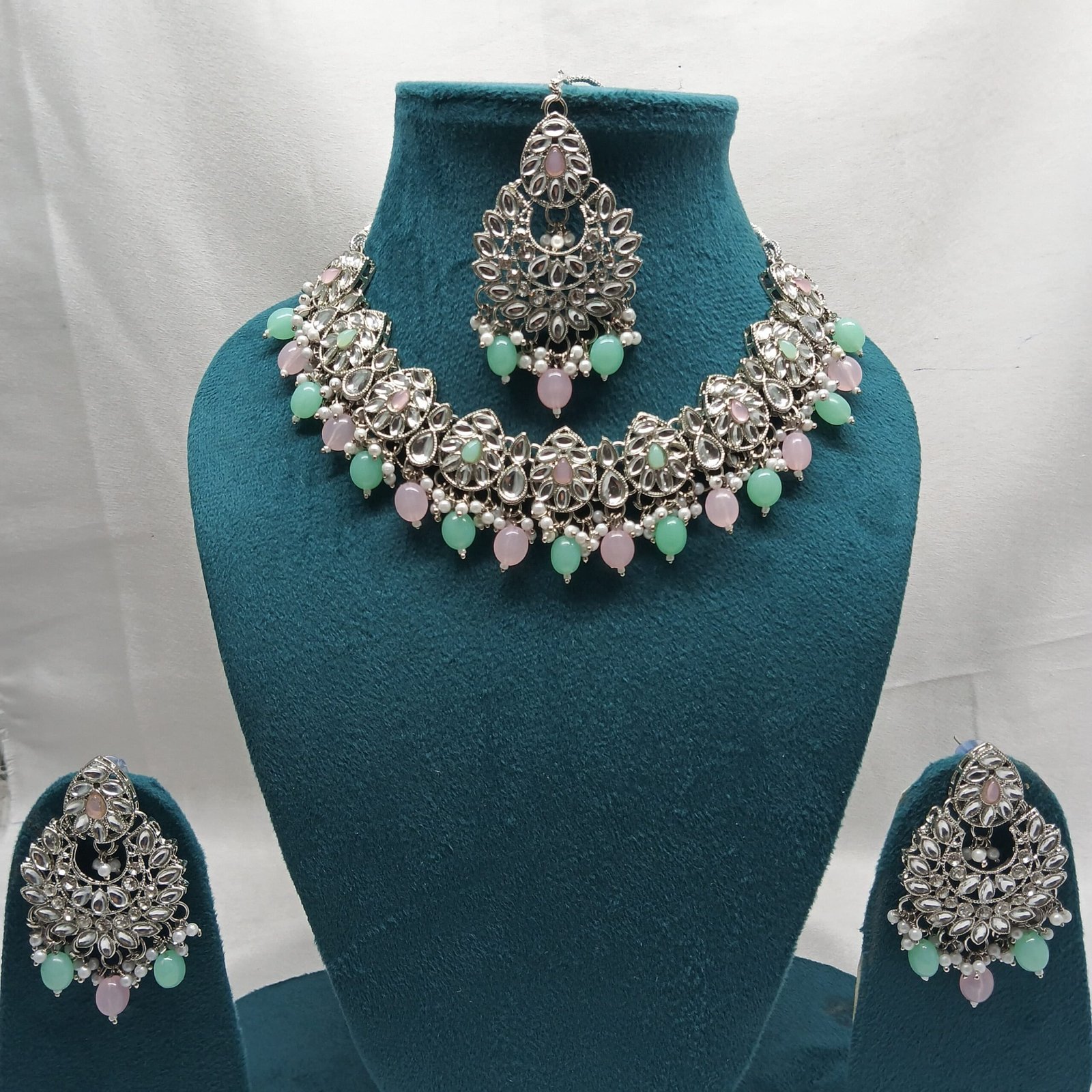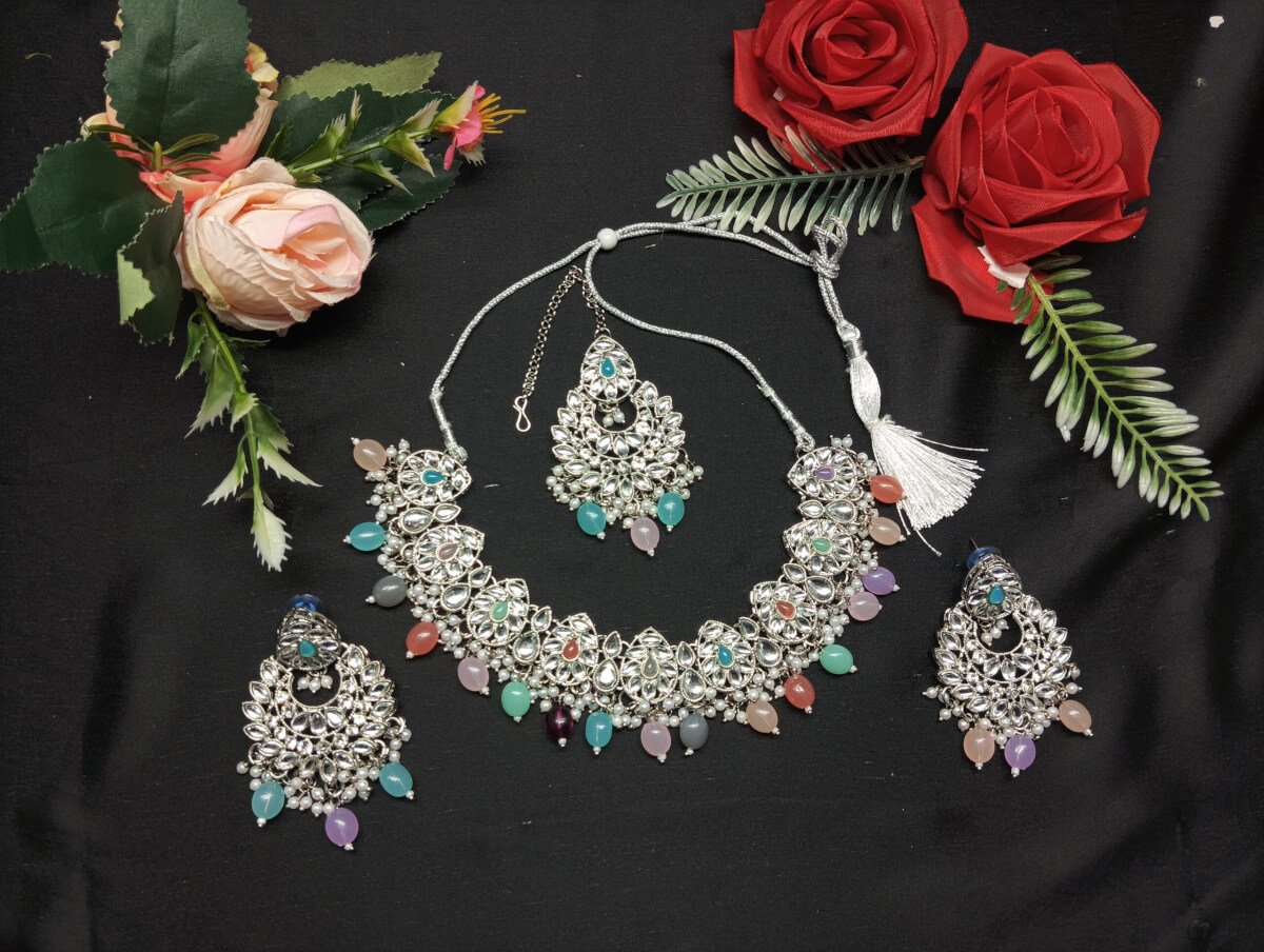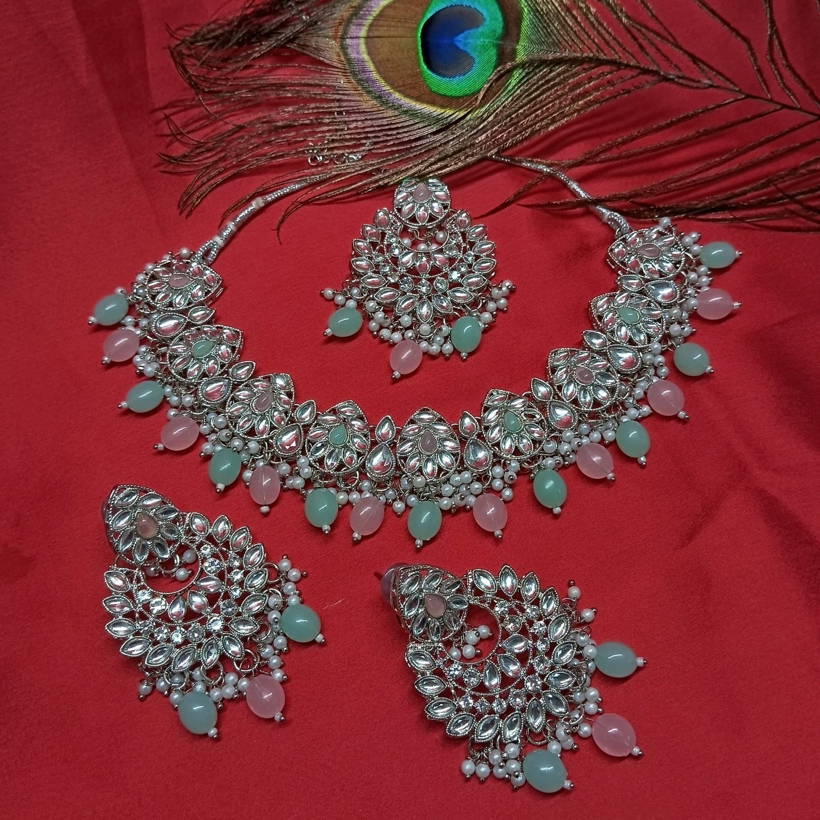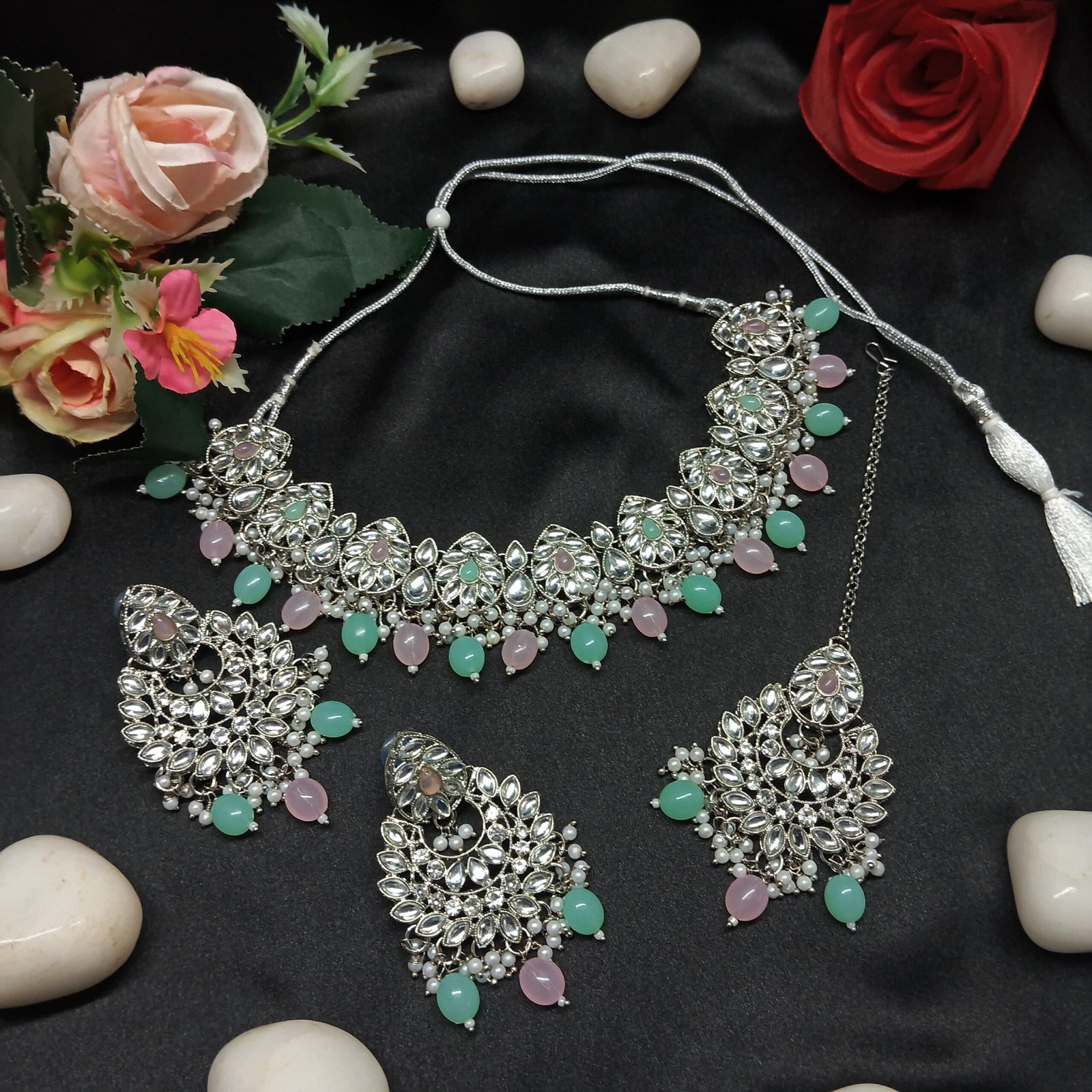 - PRODUCT DETAILS: Embrace timeless tradition with this exquisite Kundan-style and pearl-inspired necklace set, designed to bring graceful charm and sophistication to your look. This complete ensemble includes a statement necklace with a detailed center pendant, matching earrings, and a coordinating tikka (headpiece). Each piece is embellished with Kundan-inspired stones and pearl-like accents, showcasing elegant design and classic Indian heritage. Perfect for weddings, festivals, and celebrations, this set effortlessly blends cultural beauty with coordinated glamour.