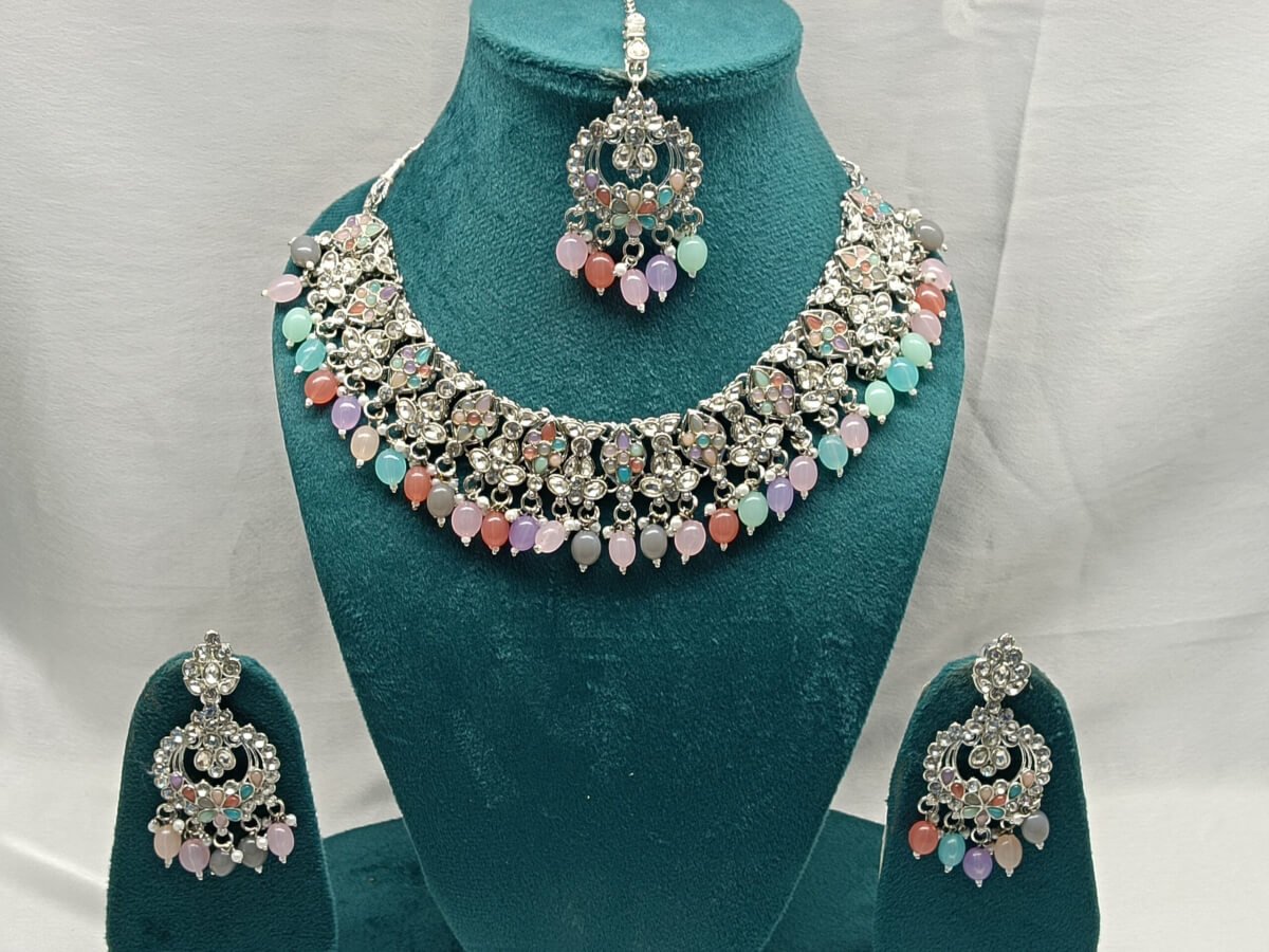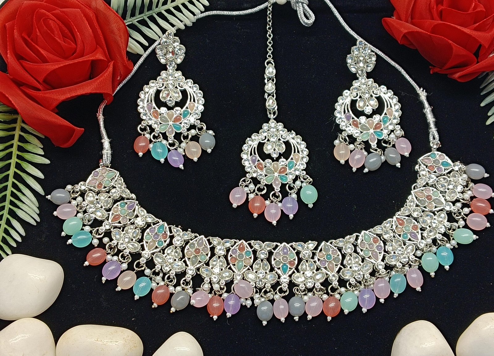 - PRODUCT DETAILS: Some jewelry is more than just beautiful—it brings tradition, color, and joy into every moment. This intricately crafted set includes a necklace, matching earrings, and a maang tikka, blending classic Kundan-style detailing with a fresh, contemporary touch. Adorned with colorful stones and beads, each piece is finished in silver plating for a soft, refined shine. Available in a range of gorgeous colors—pink, mint green, and multicolor—this set is designed to stand out and complement both traditional and modern outfits alike. Whether you’re attending a wedding, engagement, festive gathering, or simply want to feel extra special, this jewelry set brings a timeless charm that works with everything from sarees and lehengas to fusion wear. Beautifully made with high-quality materials, it’s a statement piece that feels just as lasting as the memories you’ll make while wearing it.