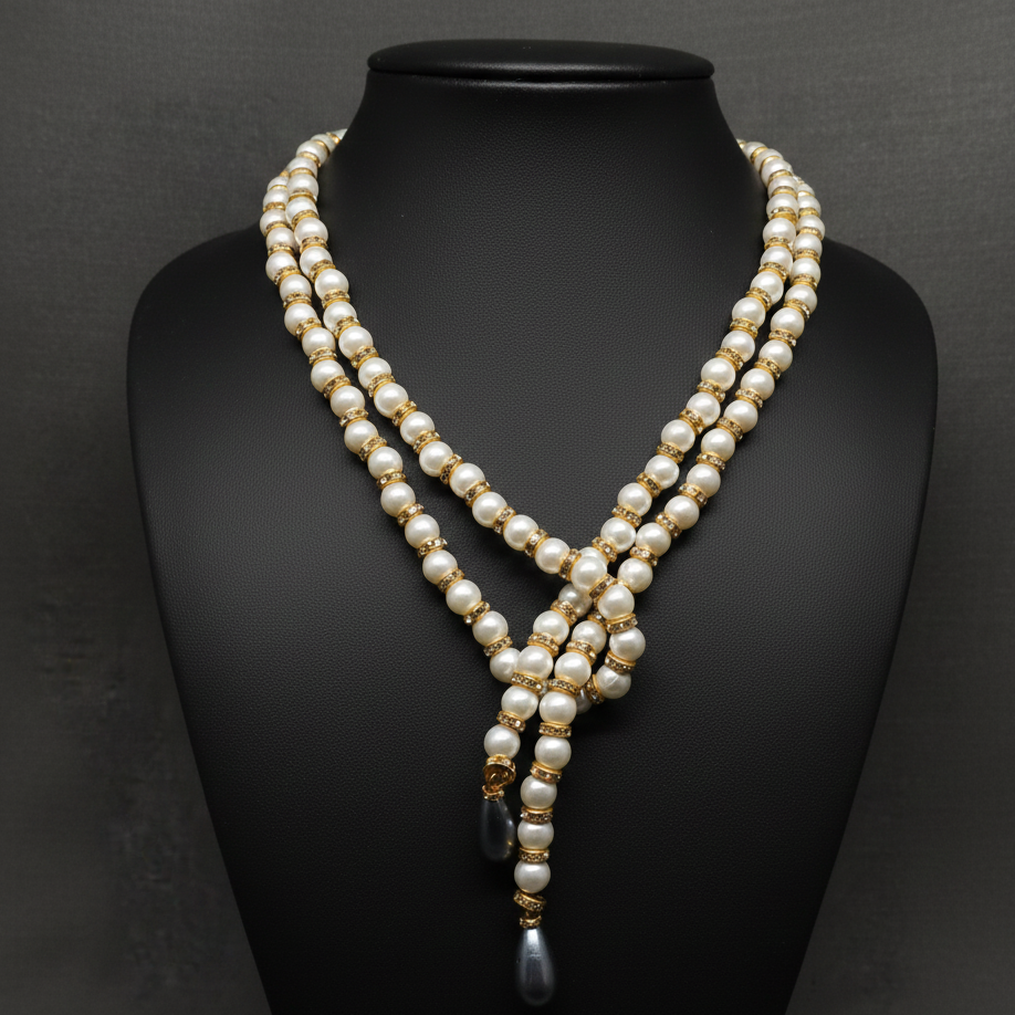- PRODUCT DETAILS : Elevate your look with this exquisitely designed layered pearl necklace, featuring two strands of lustrous white pearls beautifully accented with golden spacers. The standout loop-through design allows one strand to pass through an enclosed section on the other, creating a sophisticated crossover at the neckline. This unique formation flows into elegant drop bead finishes, adding a touch of charm and movement. Versatile and stylish, it pairs effortlessly with sarees, lehengas, dresses, or evening wear, making it the perfect choice for weddings, festive events, or statement everyday style.