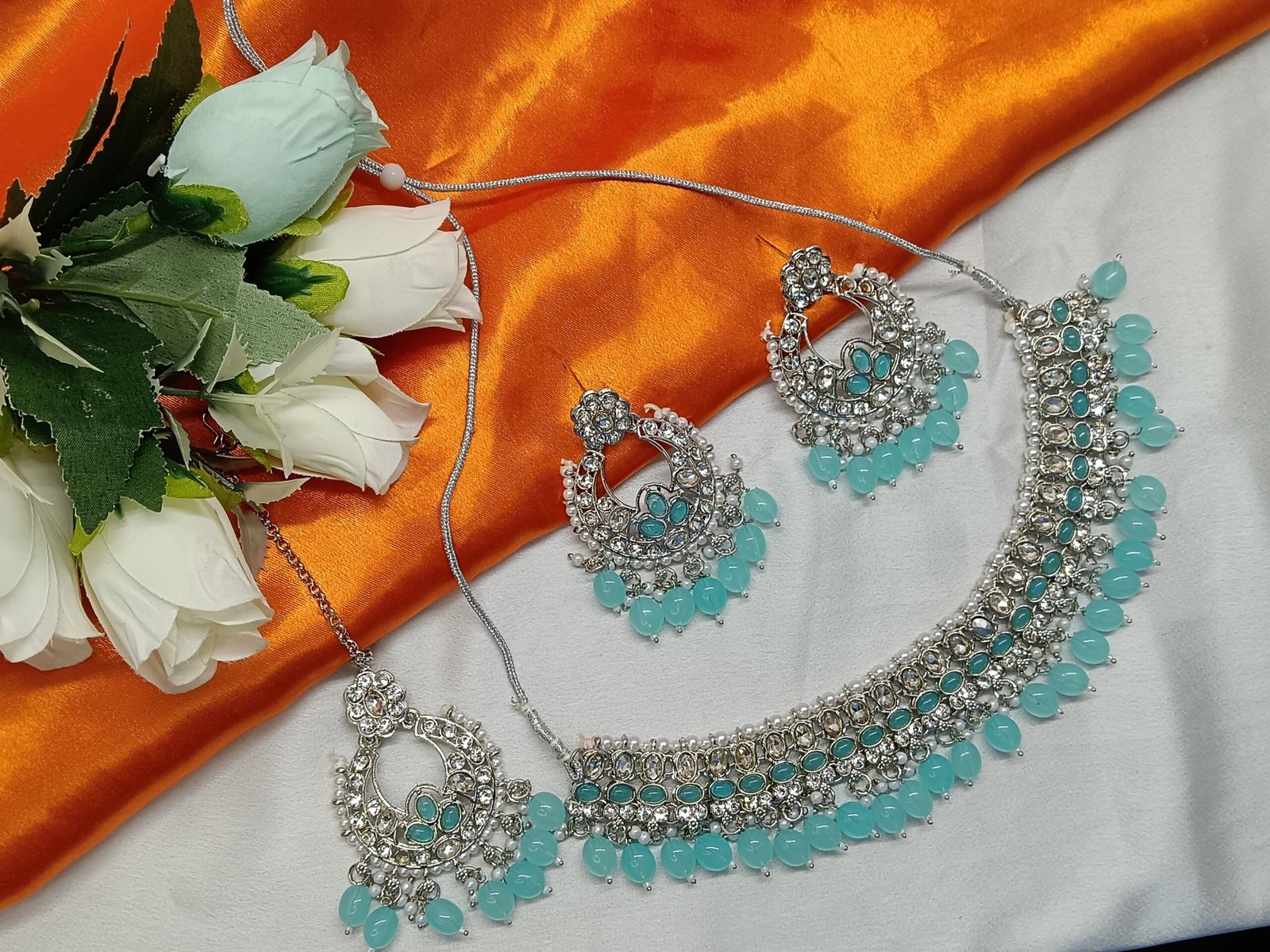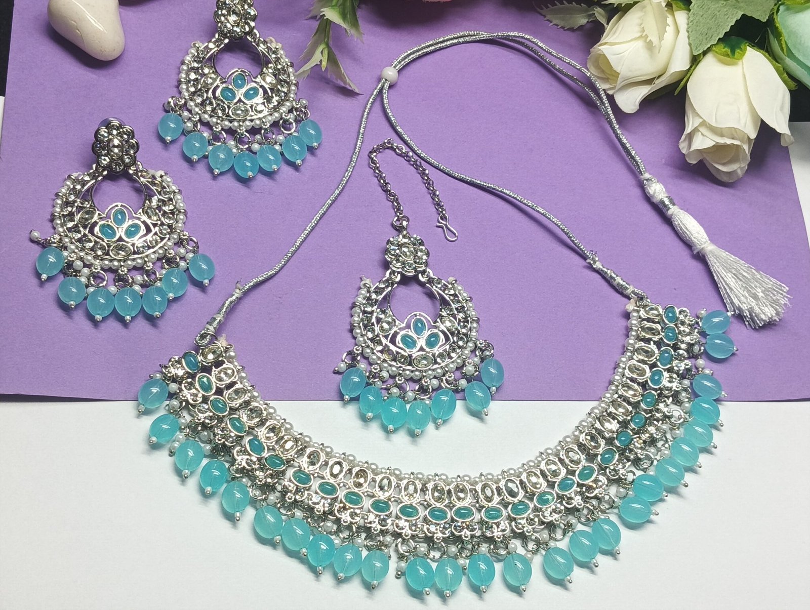 - PRODUCT DETAILS: Add timeless elegance to your ensemble with this beautifully crafted silver-toned choker jewelry set. The set includes a necklace, a pair of matching earrings, and a maang tikka, all featuring intricate metalwork adorned with soft, round light blue stones. Each piece is designed with care, incorporating delicate stone settings and dangling accents that add movement and sophistication. The coordinated design of the earrings and maang tikka mirrors the necklace, creating a cohesive and graceful look. Ideal for formal events, festive gatherings, or bridal occasions, this set effortlessly enhances both ethnic and contemporary outfits.