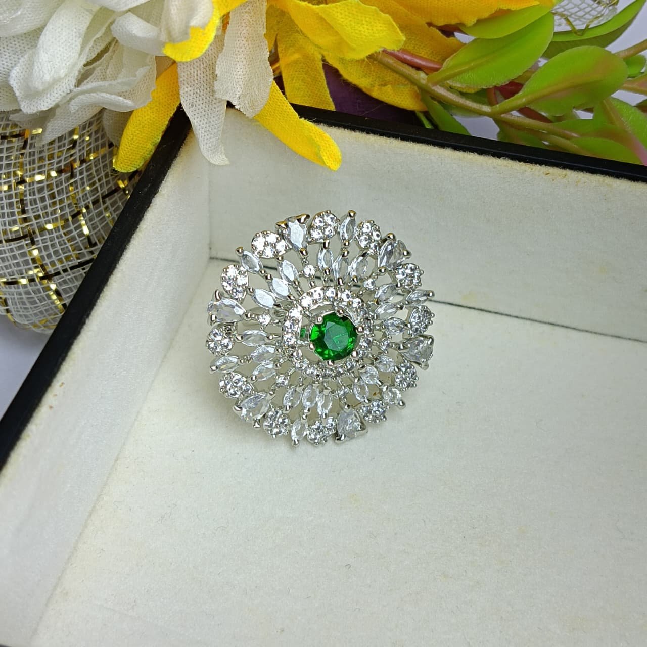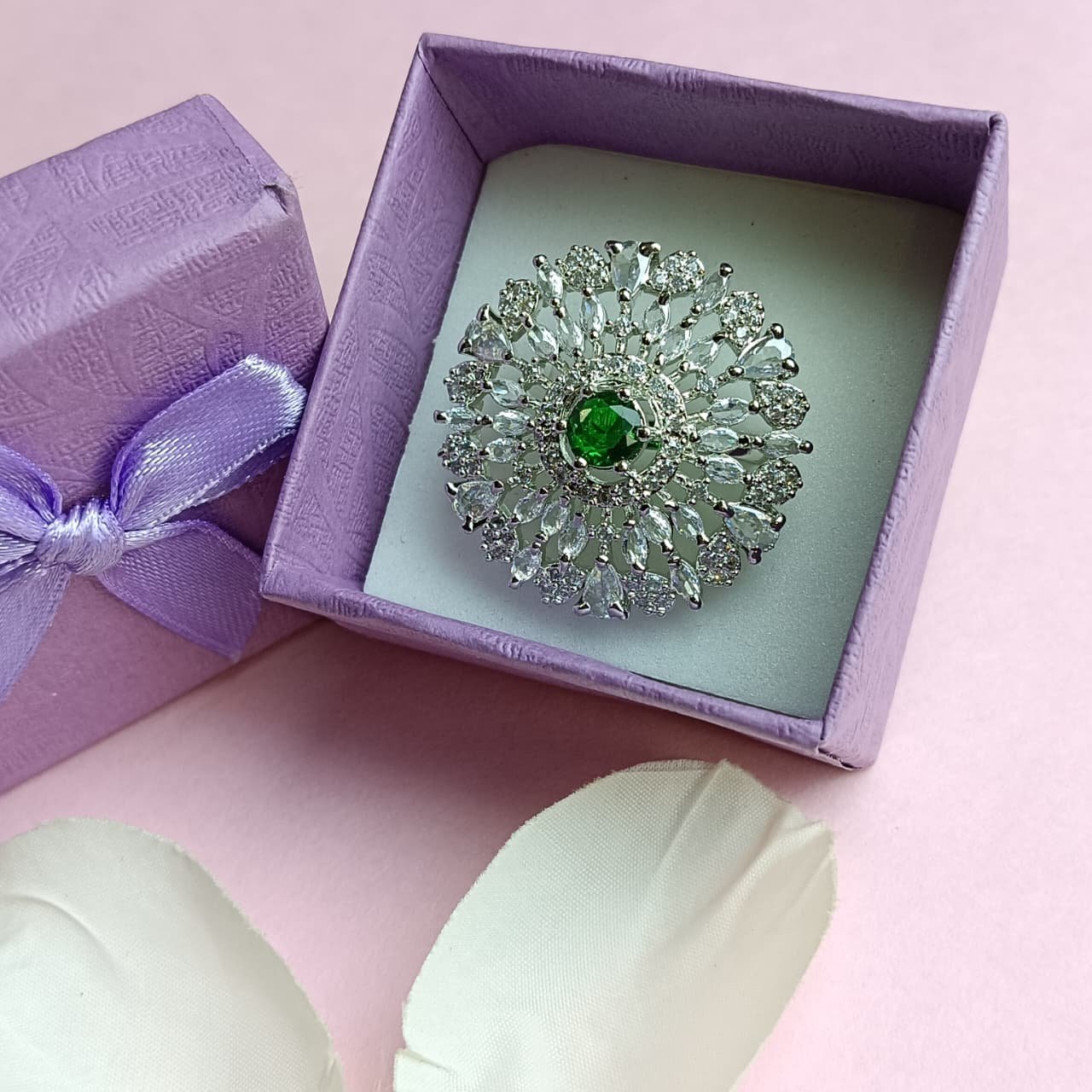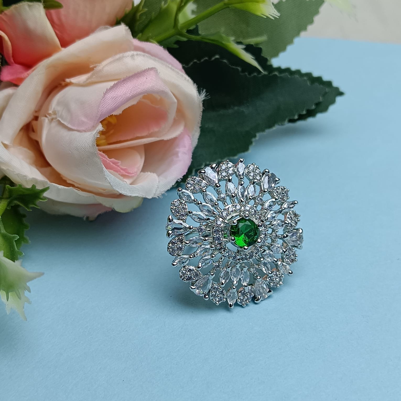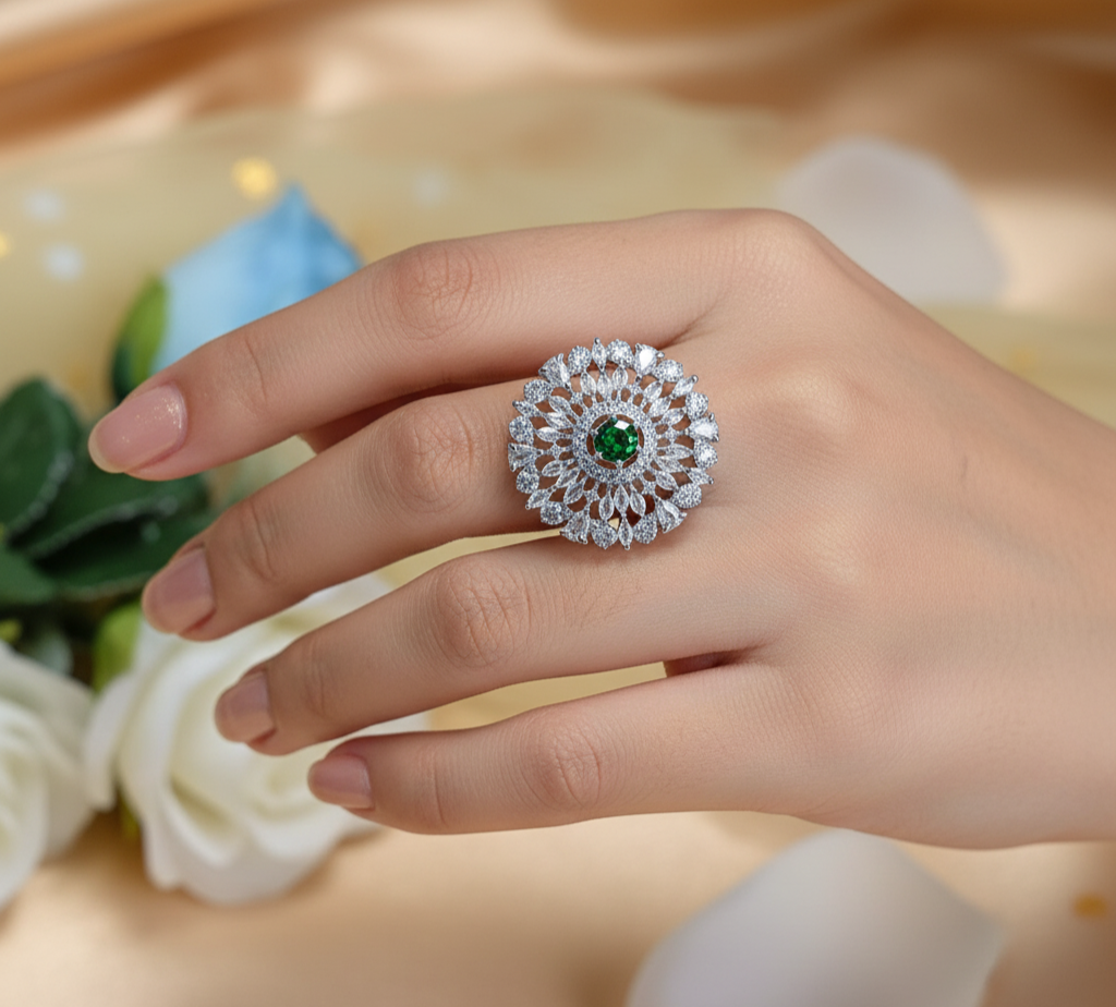- PRODUCT DETAILS: The ring rests softly in hand, its emerald-green CZ center glowing like a quiet whisper of light. As it slips onto a finger, the surrounding CZ petals come alive—sparkling with every gentle movement and turning an ordinary moment into one of calm, effortless elegance. With its radiant floral silhouette and rich green brilliance, this ring adds a touch of luxury to any look.