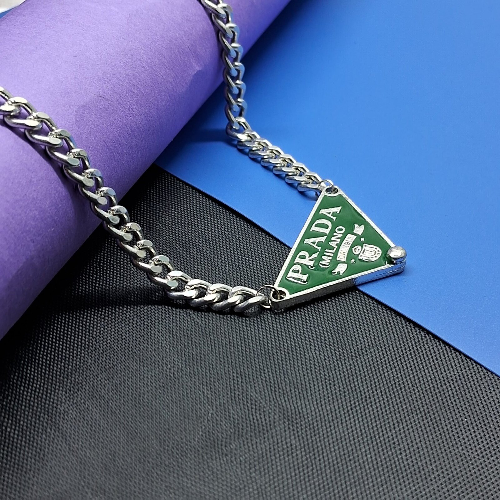 - PRODUCT DETAILS: Add a bold, stylish edge to your everyday look with this silver-tone chain necklace featuring a vibrant green triangle pendant. The rich green enamel and engraved designer-style details give it a unique and modern vibe—perfect for guys who like their accessories to say something without being too loud. The chain is crafted in a classic curb style that’s smooth, durable, and comfortable to wear all day. Whether you’re dressing up a casual outfit or layering it with other pieces, this necklace brings a cool, streetwear-inspired finish to any look. It’s easy to wear, easy to pair, and just the right amount of bold.