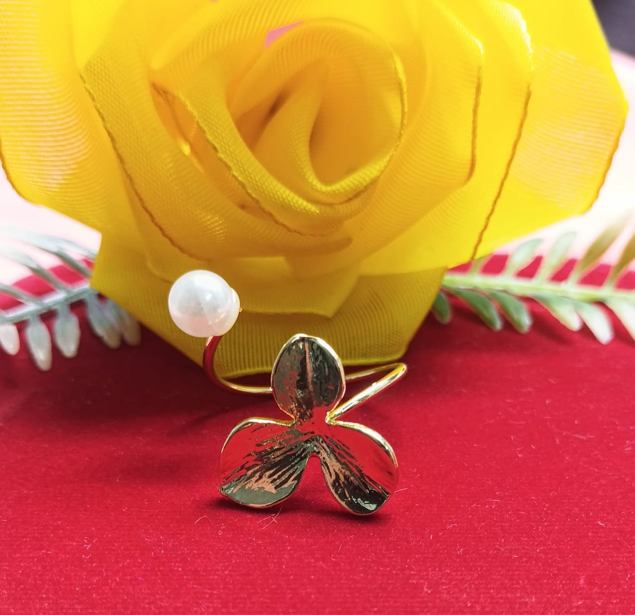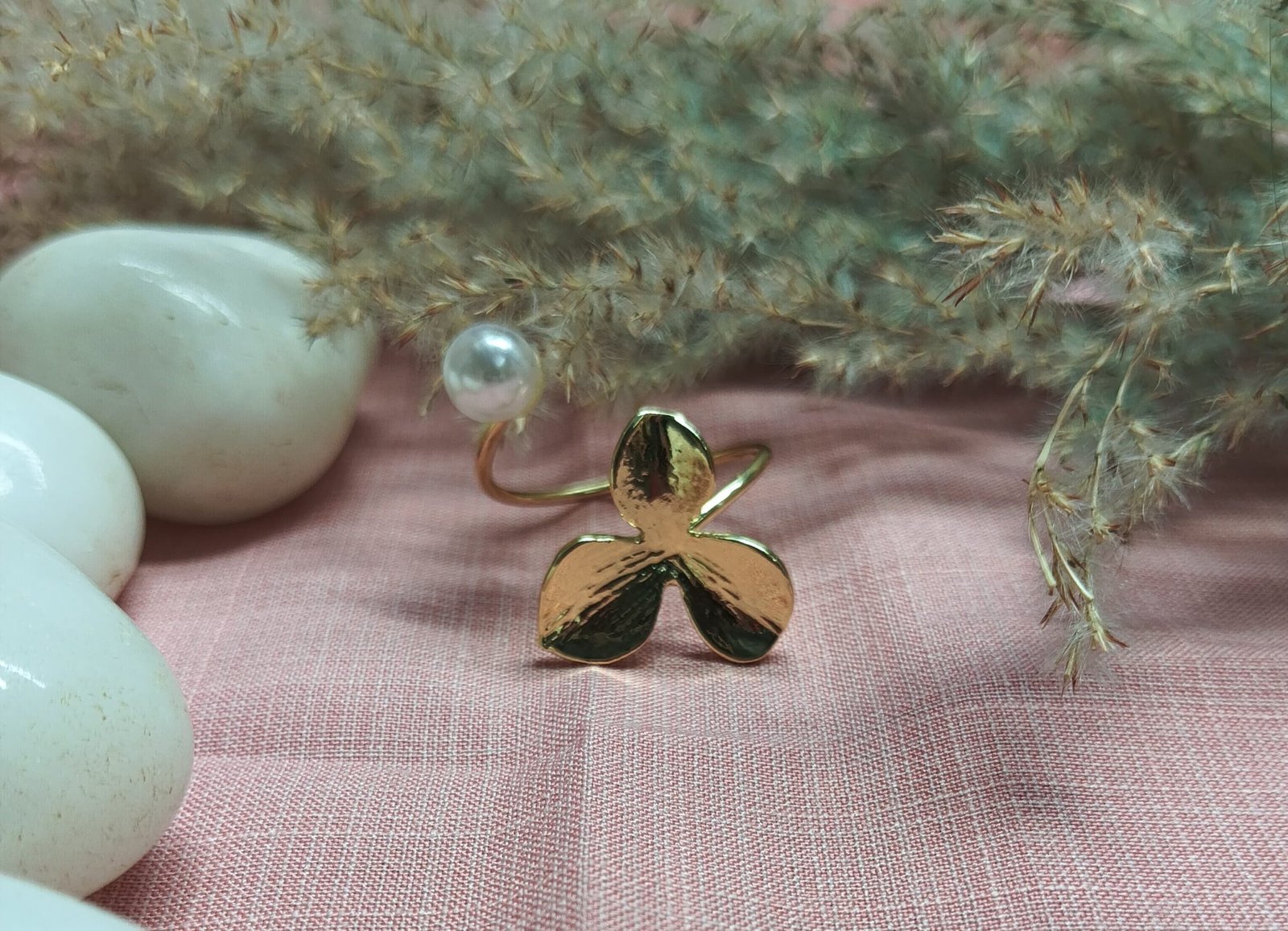 Minimal Gold-tone Flower Ring with Pearl For Women and Girls|Elegant Adjustable Statement Jewelry for Everyday and Special occasion