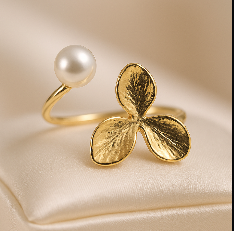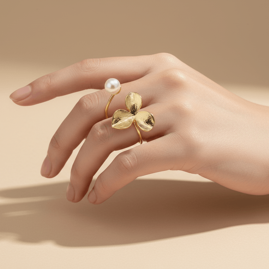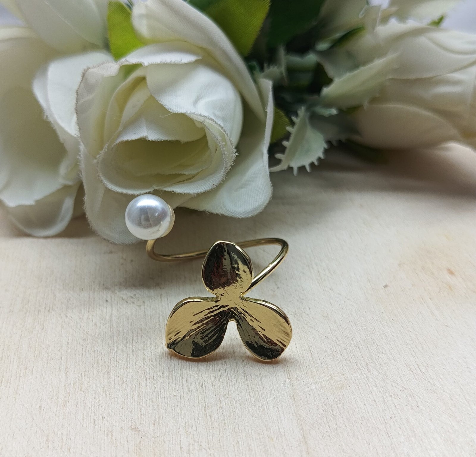 - PRODUCT DETAILS: Delicate and distinctive, this open-band ring features a graceful floral motif in a warm gold-tone finish. Designed with three sculpted petals, the flower adds a soft, romantic touch, while a pearl-like accent on the opposite end of the band brings in a hint of classic elegance. The open design not only enhances its contemporary charm but also allows for easy adjustability, making it a comfortable and stylish accessory for any occasion.