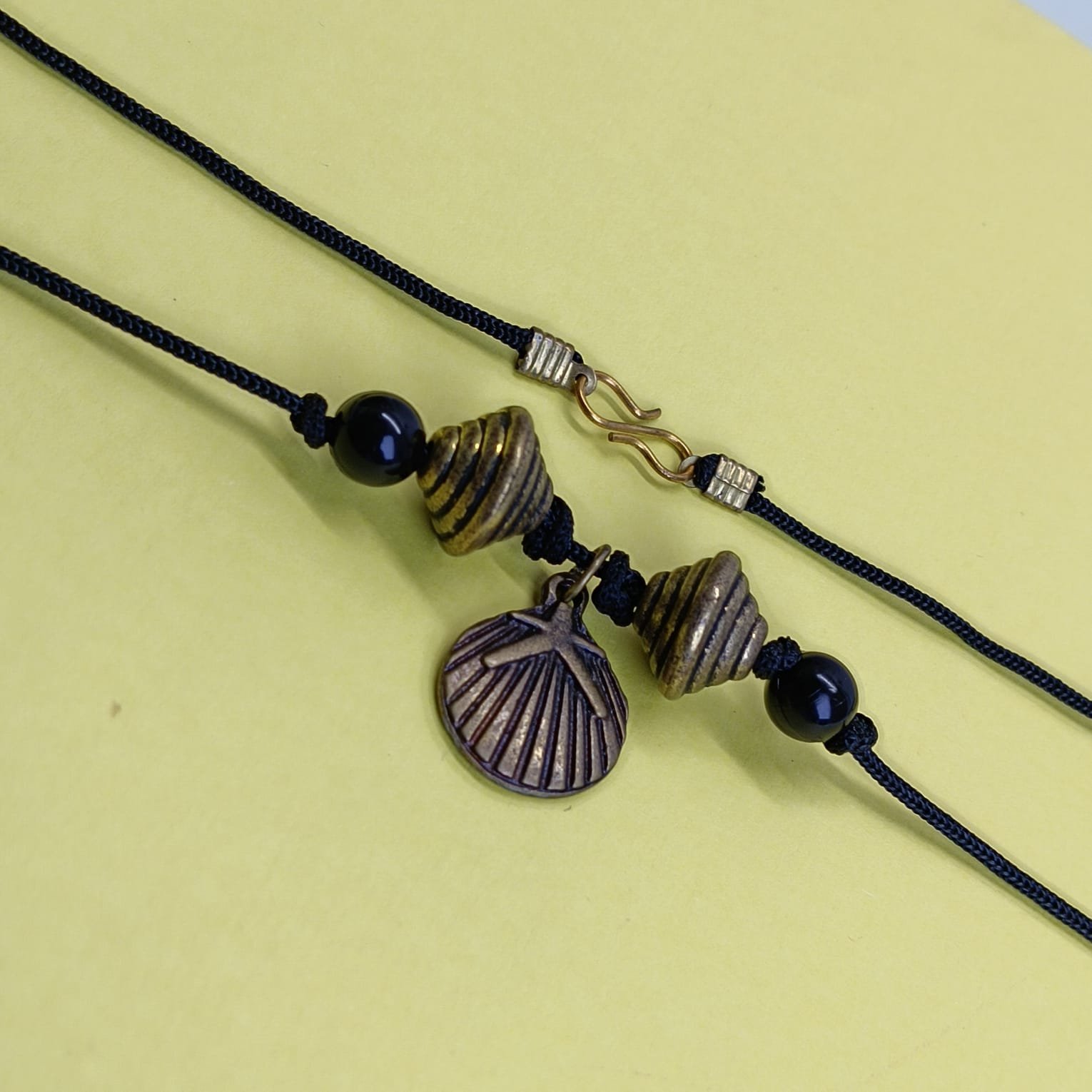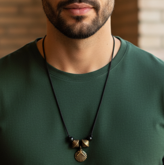 - PRODUCT DETAILS: This men’s pendant blends traditional symbolism with a contemporary design. It features a durable black cord accented with gold-colored beads and a distinctive shell-shaped pendant. The gold elements symbolize prosperity and good fortune, while the black cord is traditionally associated with protection and warding off negativity. Designed for everyday , this piece also makes a meaningful gift.