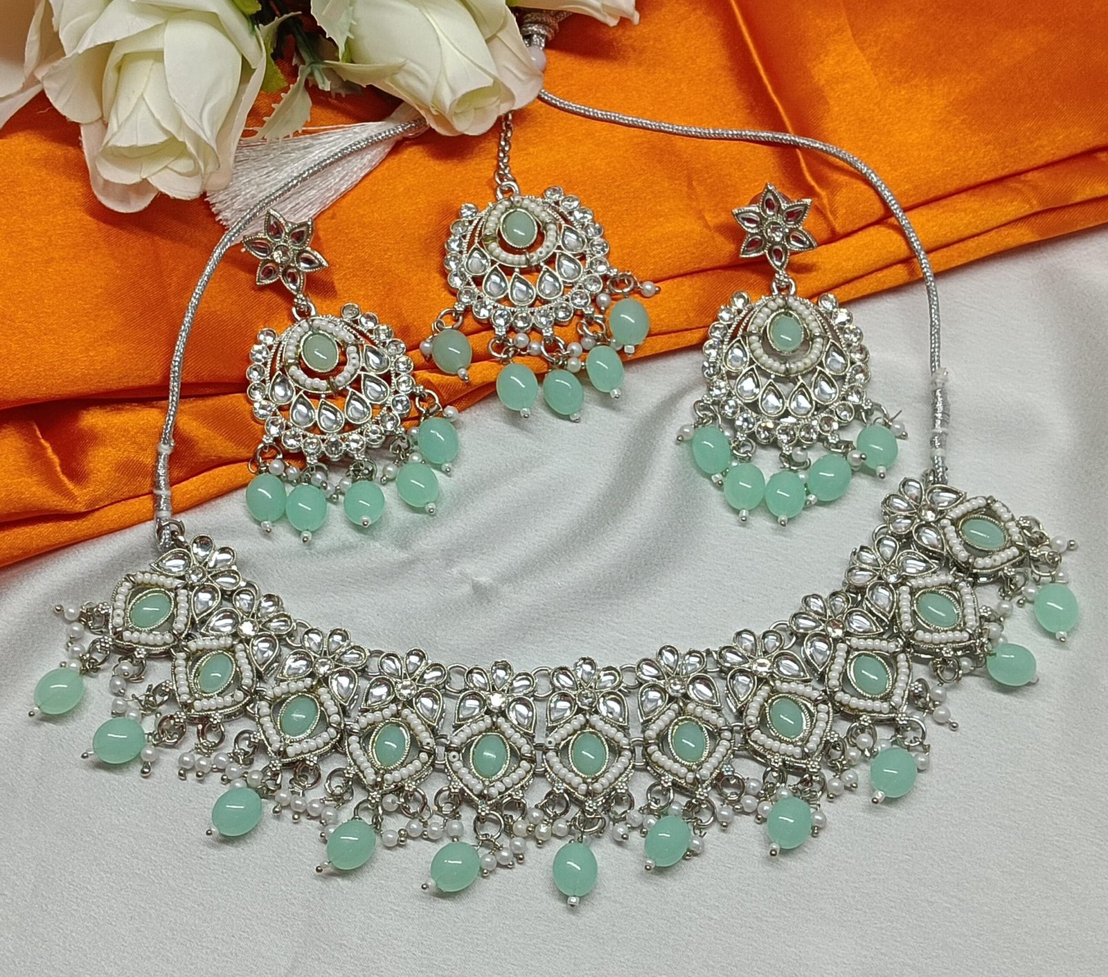 Elegant Mint Green Choker Set with Silver-tone Detailing |Traditional Necklace & Earrings for Wedding, Festival & Special Events