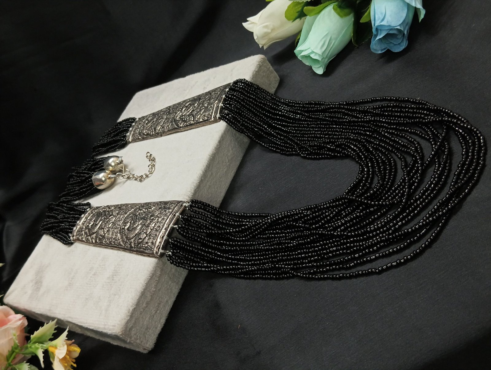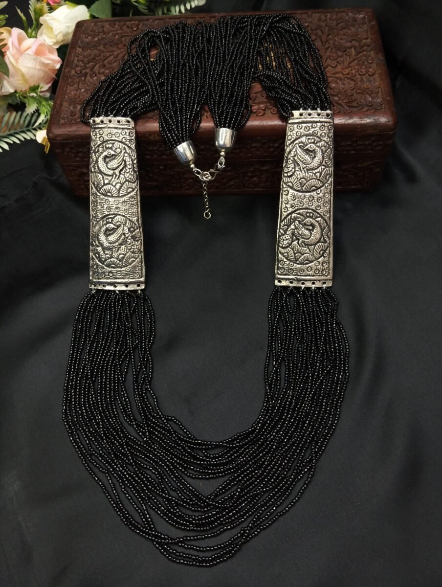 - PRODUCT DETAILS: NIPSTec Designer Elegant Multi-Layered Black beads Oxidised Necklace is Inspired by timeless craftsmanship, this heritage-style necklace features multiple layers of elegant black beads, beautifully adorned with intricately detailed oxidized German silver peacock motifs. The blend of traditional artistry and regal charm makes this piece a true statement of elegance. Designed to capture the essence of vintage grandeur, it adds a touch of sophistication and cultural richness to any jewelry collection.