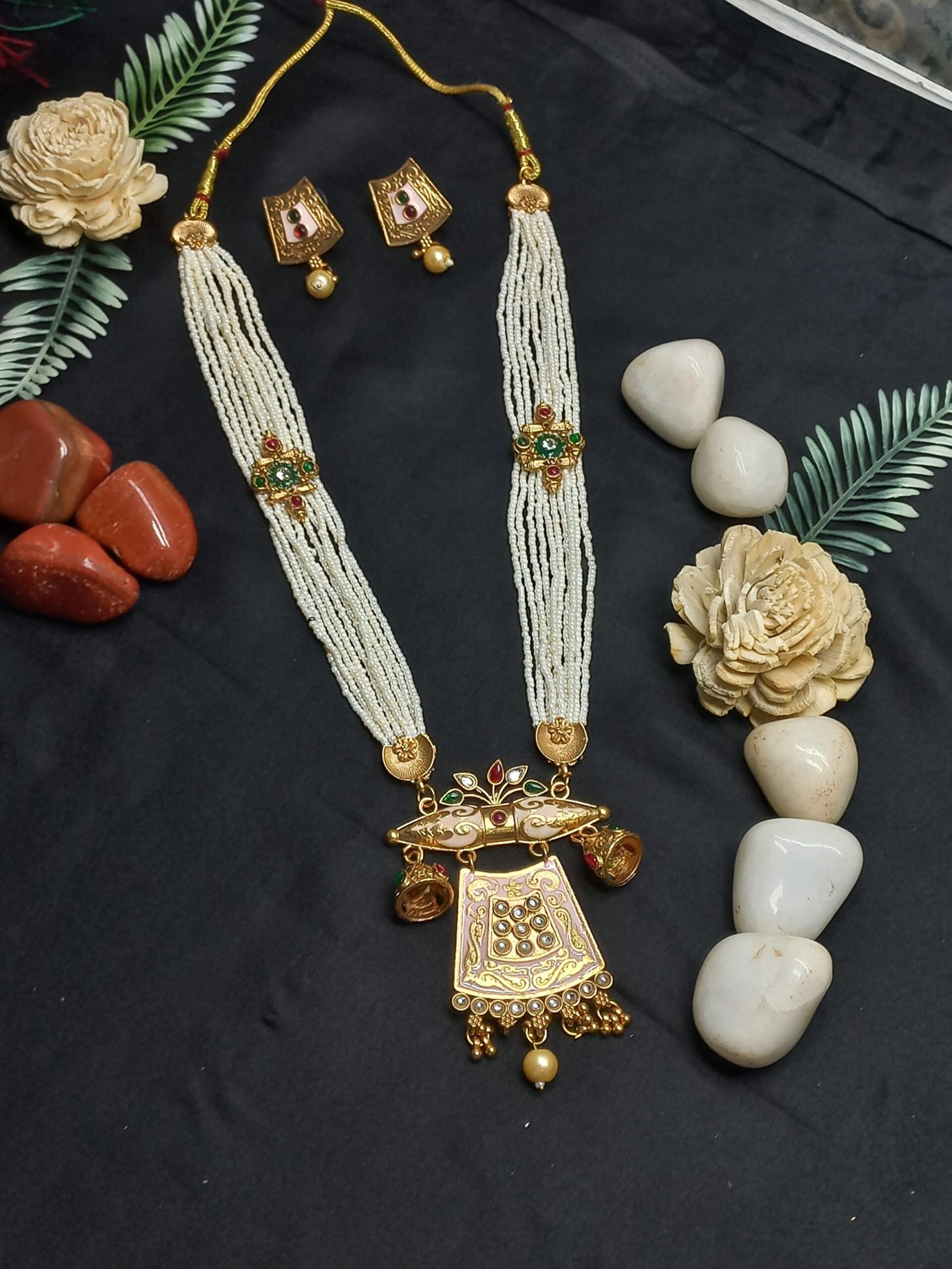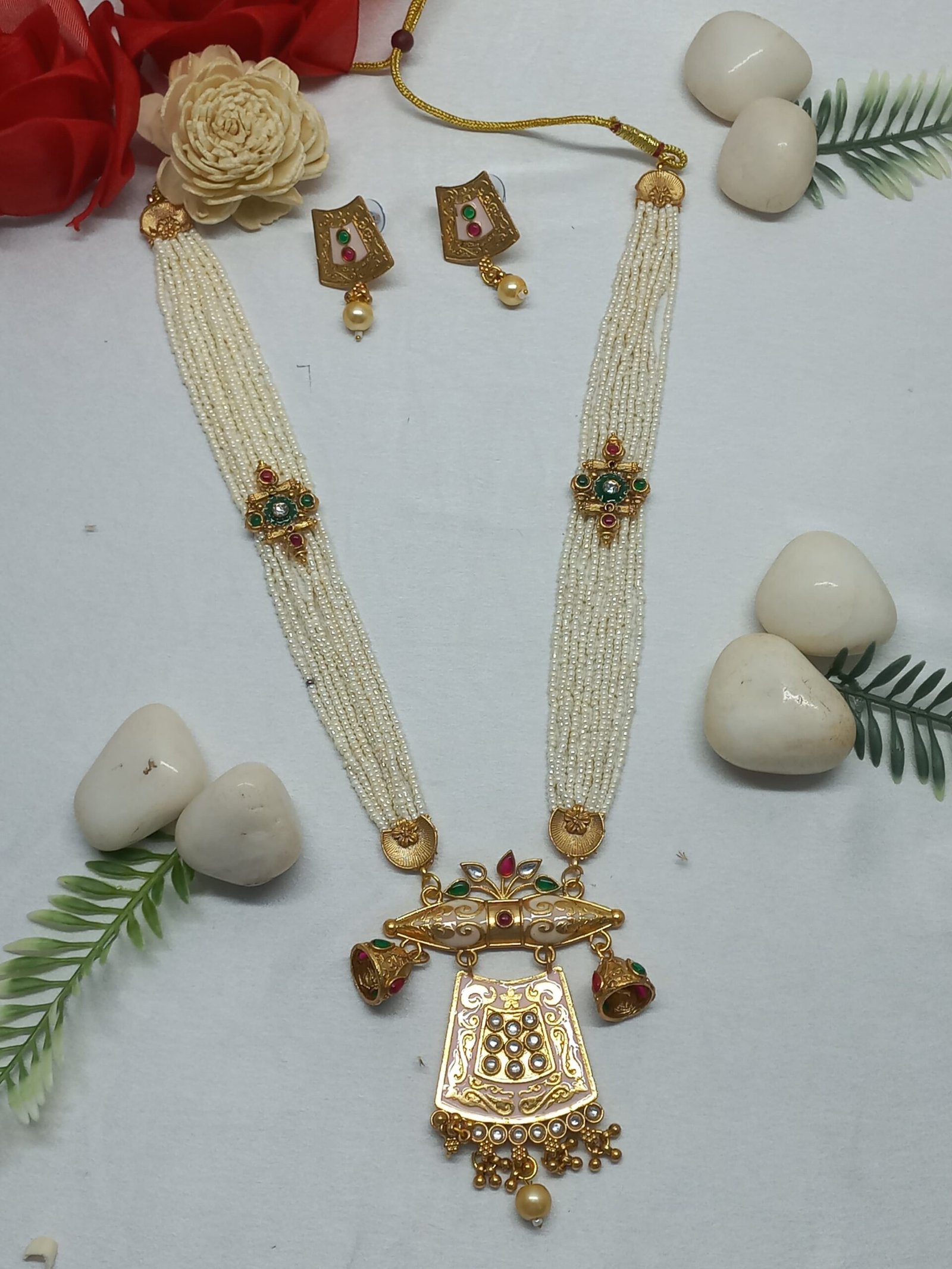 - PRODUCT DETAILS: Celebrate the rich heritage of Rajasthan with this stunning gold-tone jewelry set, inspired by traditional Rajputana artistry. The set features a long, multi-strand beaded necklace adorned with lustrous pearls and a unique pendant that beautifully captures the essence of regal elegance. Complemented by matching earrings, this ensemble embodies the timeless charm of classic Indian craftsmanship. The Jadau technique, renowned for embedding precious stones into metal, is expertly imitated here to offer the look and feel of authentic royal jewelry, making it an ideal choice for weddings, festivals, and other grand occasions. With its intricate design and luxurious finish, this jewelry set adds a sophisticated touch of tradition and elegance to any outfit.