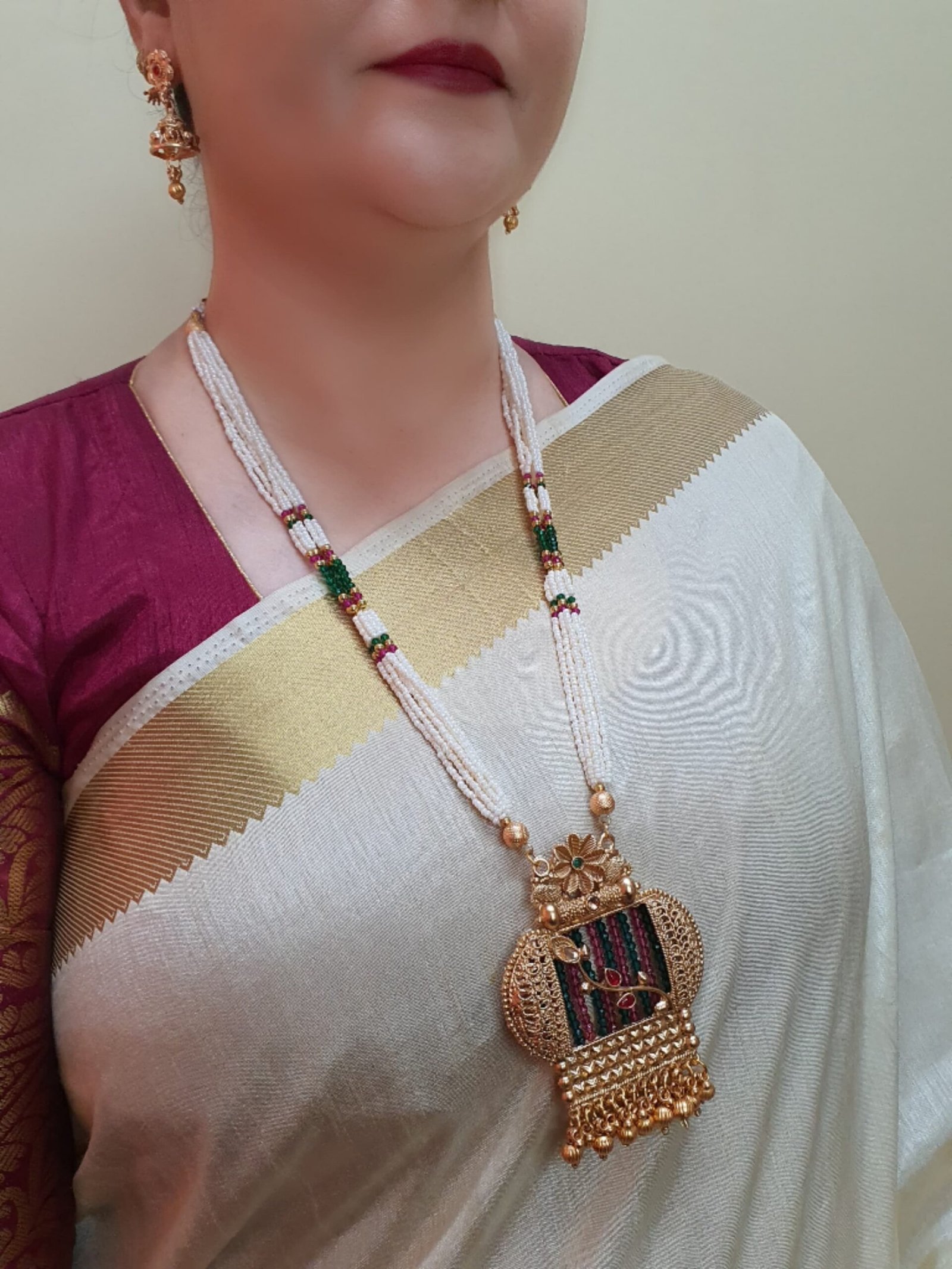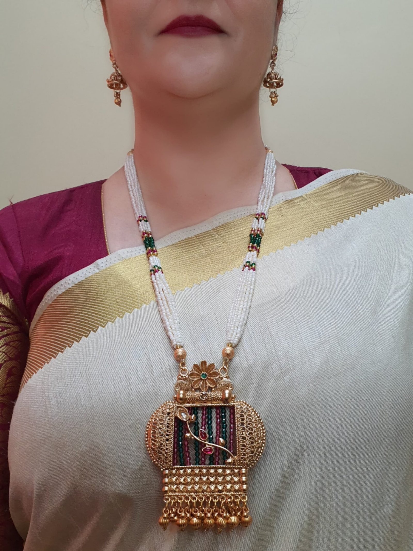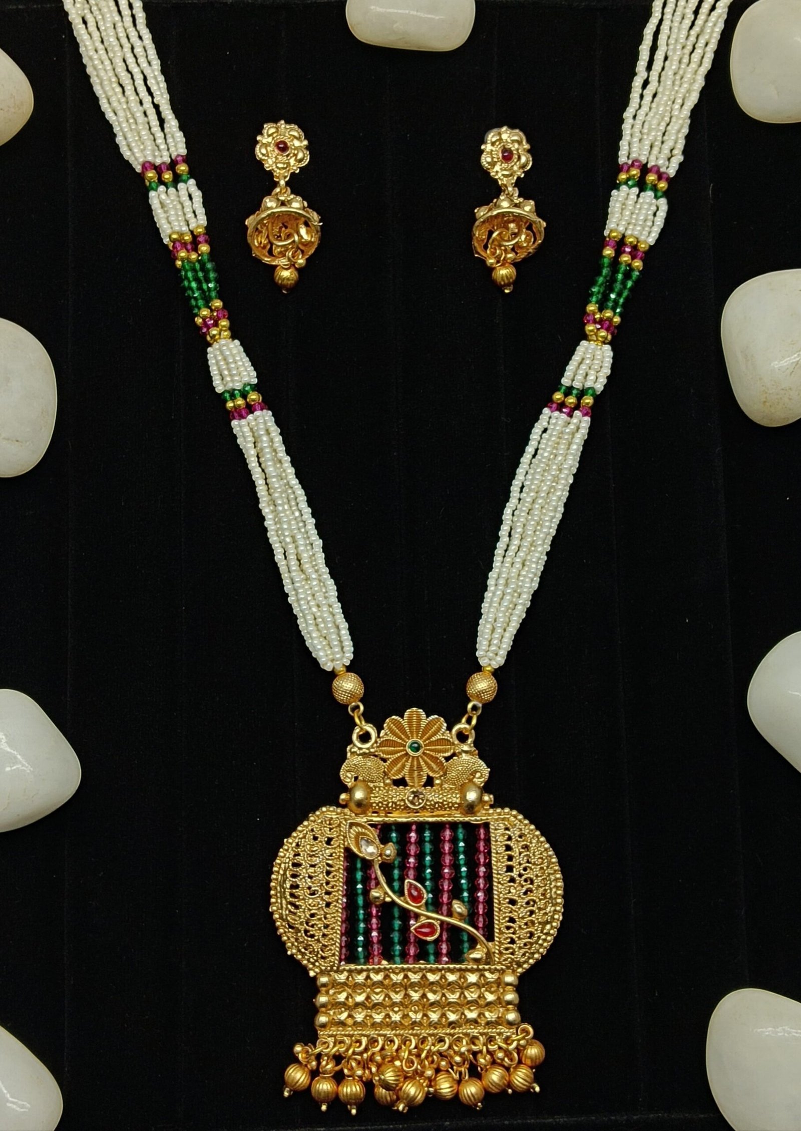 Gold-Plated Multi-Strand Pearl Beaded Necklace with Ornate Pendant & Matching Earrings | Ethnic Jewelry for Weddings & Festive Occasions