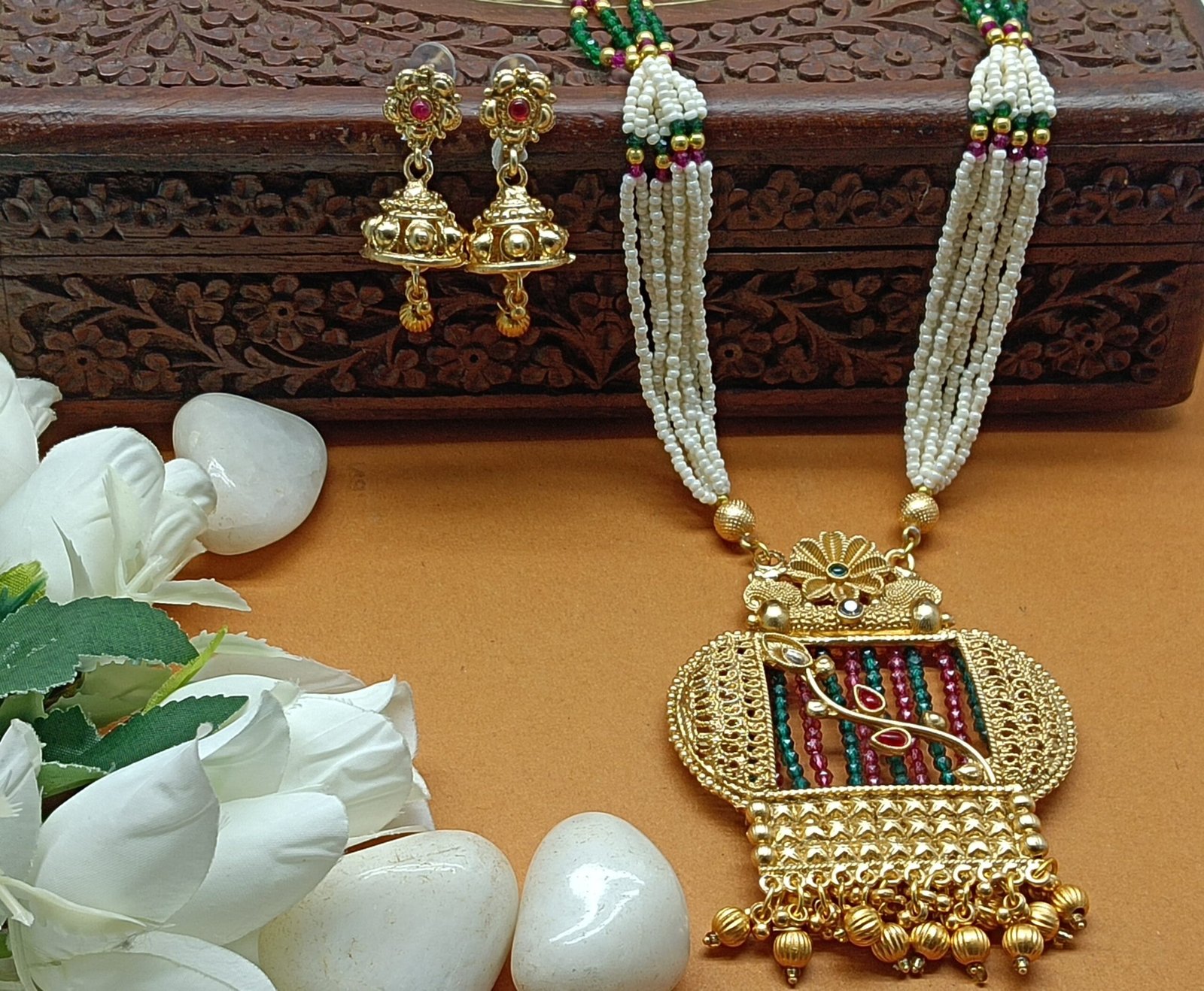- PRODUCT DETAILS: Elevate your traditional look with this exquisite Indian necklace set, a classic ensemble that includes a long necklace and matching earrings, designed to make a statement at any special occasion. The necklace features a large, intricately detailed pendant—highlighting traditional craftsmanship with filigree or embossed-style design—paired with multiple strands of lustrous pearls that drape gracefully. The coordinating earrings mirror the necklace’s design, offering a harmonious and complete look. Crafted from gold-plated metal and adorned with elegant pearls, this set is perfect for weddings, festivals, and cultural celebrations where traditional elegance takes center stage.