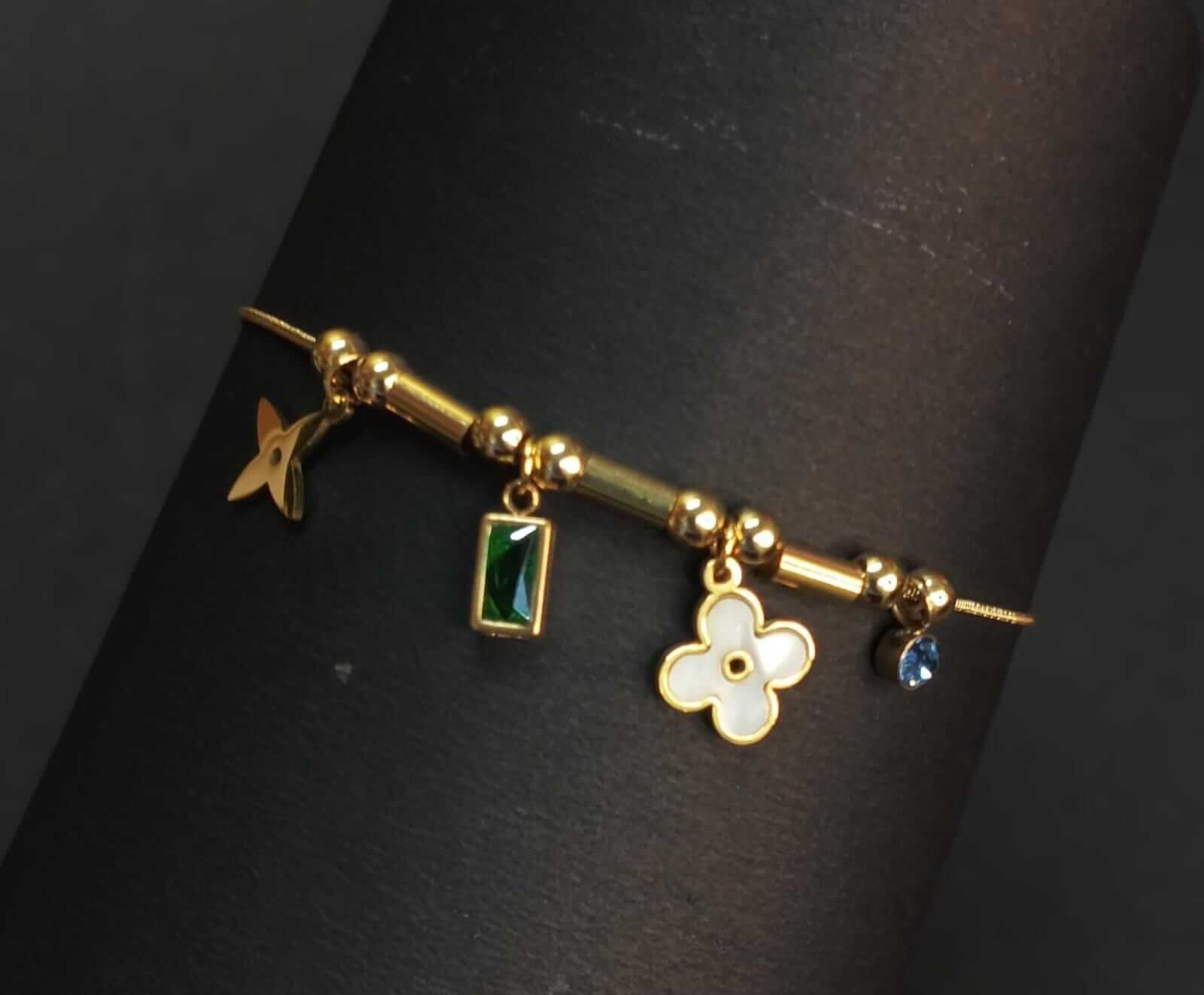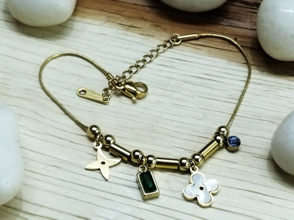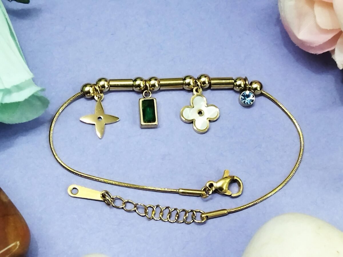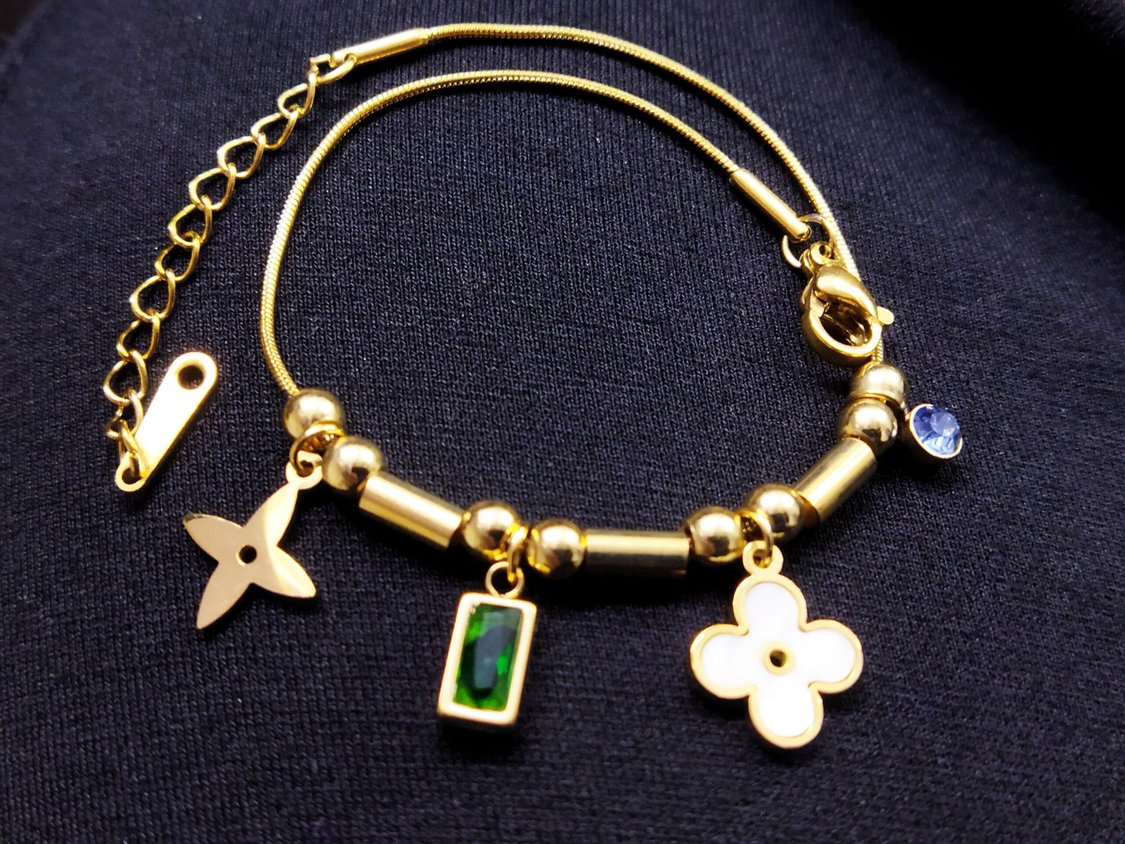 - PRODUCT DETAILS: A stylish charm bracelet featuring a mix of elegant charms—a star, a flower, a green rectangle, and a blue artificial stone. A perfect blend of color and charm, this piece adds a touch of sophistication and playfulness to any look.