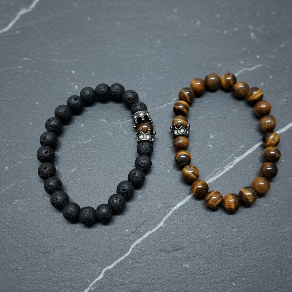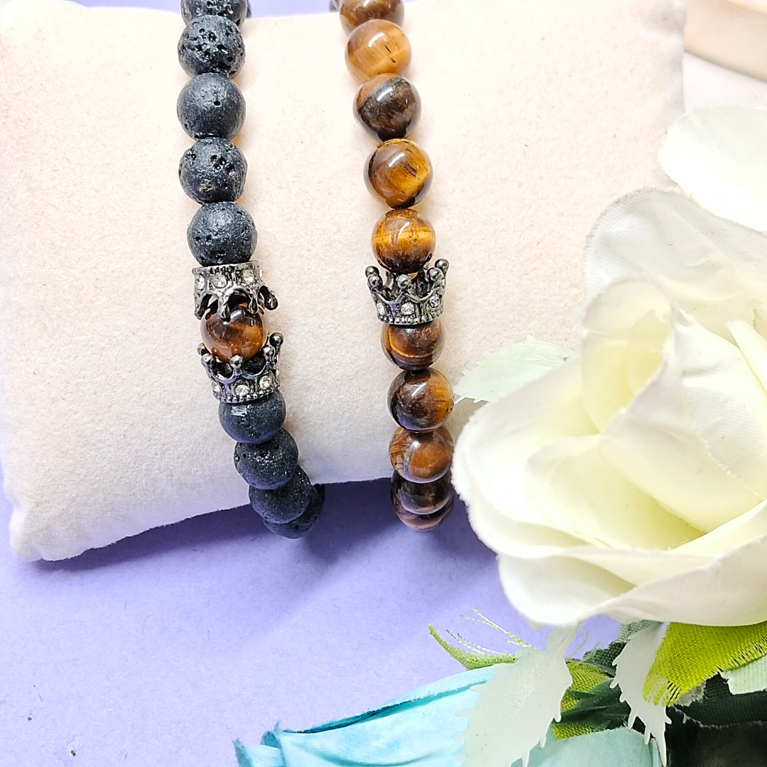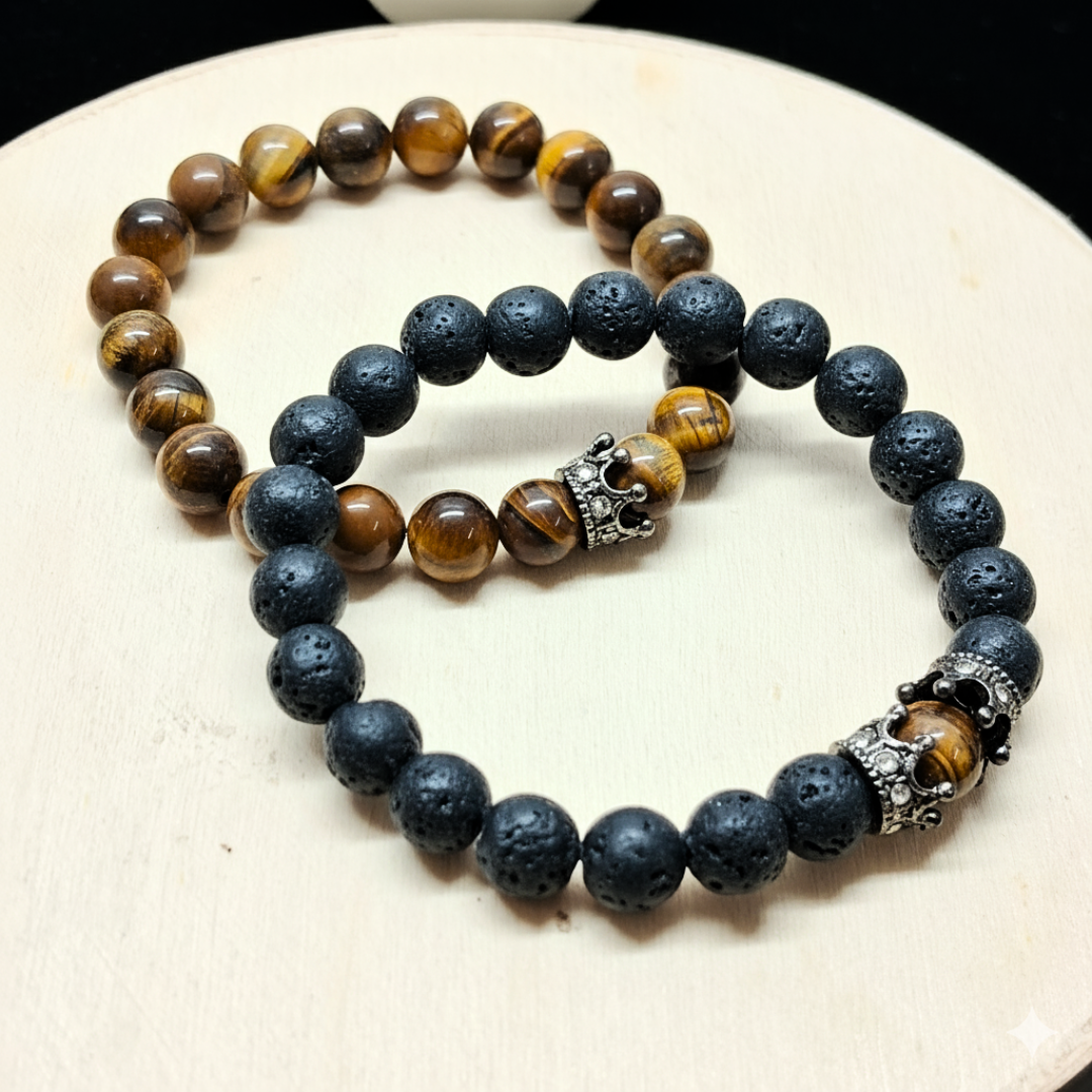 - PRODUCT DETAILS: This bracelet set includes two distinct beaded bracelets crafted from natural stone materials. One bracelet features matte black beads, while the other is made with polished tiger eye-like beads in shades of brown and black. Each bracelet includes a decorative accent bead. The bracelets are highlighted with a detailed crown charm, adding a symbolic touch often associated with strength, instinct, and royalty. Both bracelets are designed with stretchable elastic cords for easy and comfortable use. The combination of natural stones and meaningful design elements makes this set suitable for daily use or as a thoughtful gift.