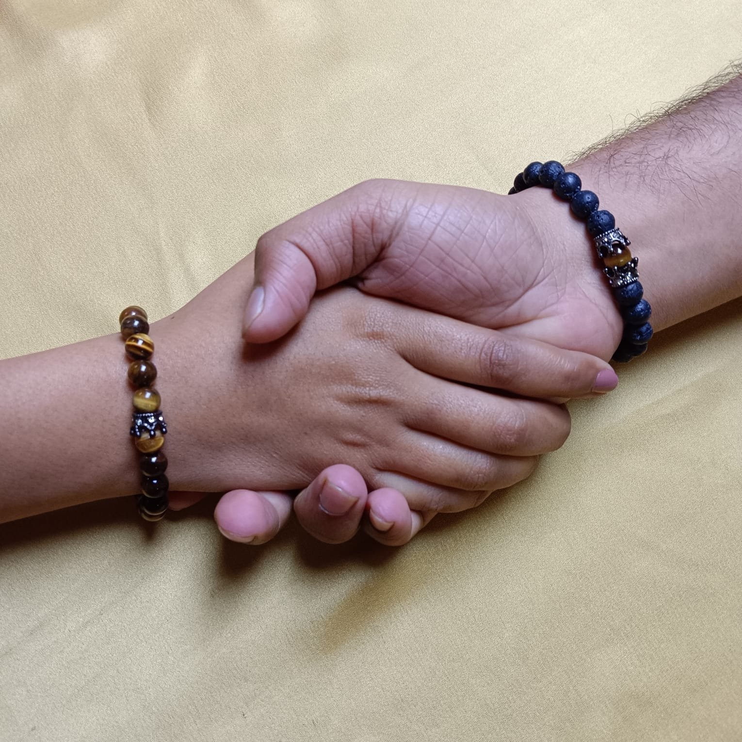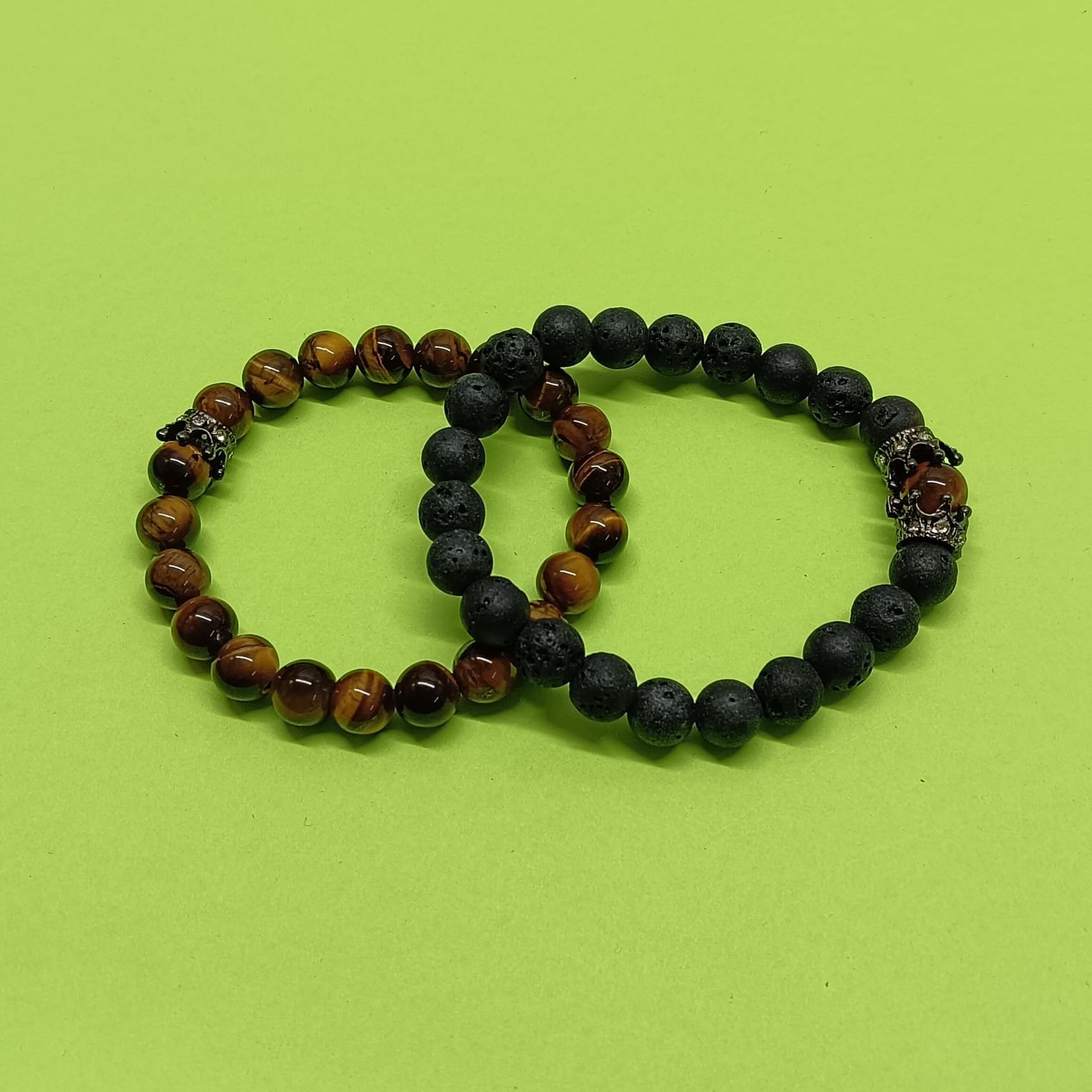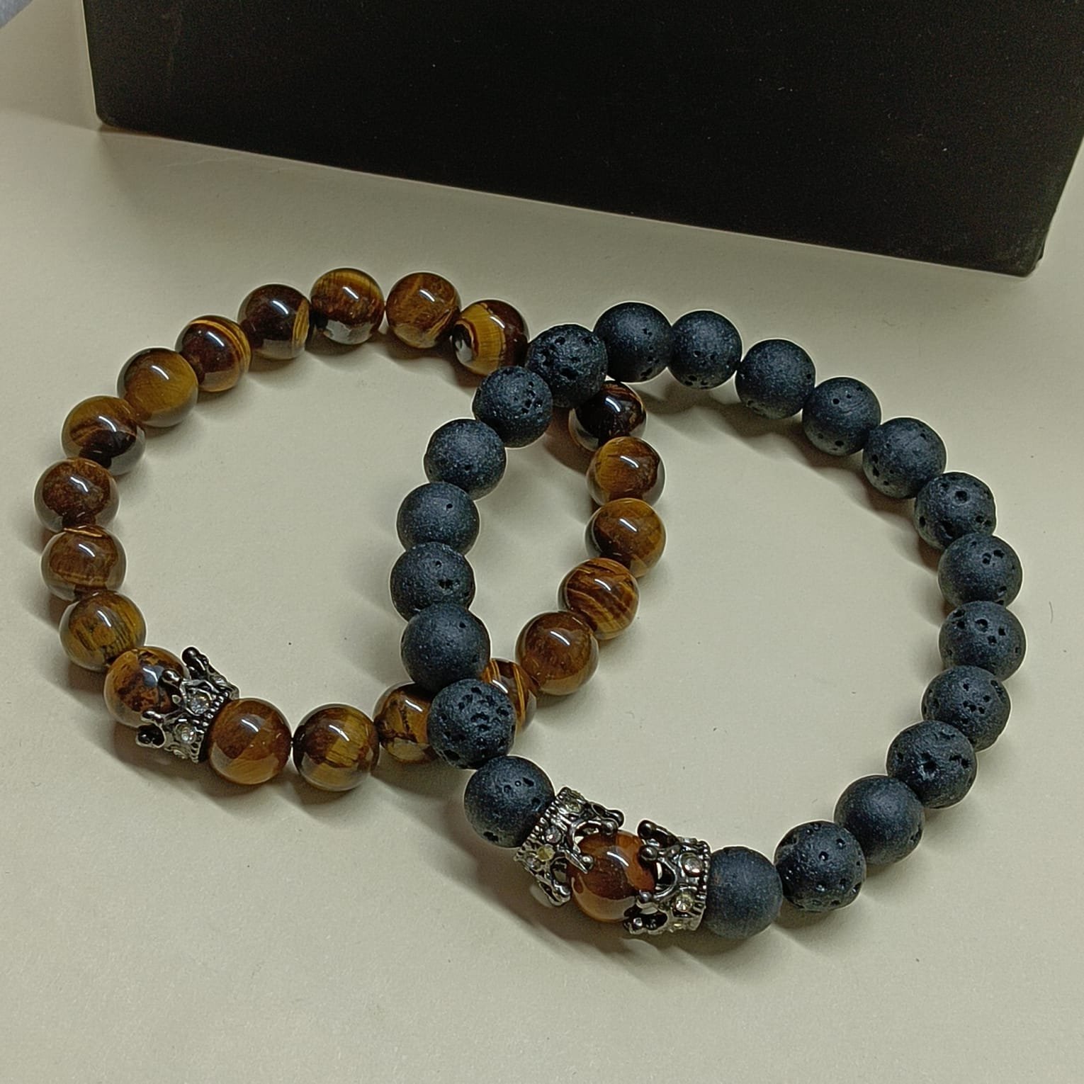 - PRODUCT DETAILS: This bracelet set includes two distinct beaded bracelets crafted from natural stone materials. One bracelet features matte black beads, while the other is made with polished tiger eye-like beads in shades of brown and black. Each bracelet includes a decorative accent bead. The bracelets are highlighted with a detailed crown charm, adding a symbolic touch often associated with strength, instinct, and royalty. Both bracelets are designed with stretchable elastic cords for easy and comfortable use. The combination of natural stones and meaningful design elements makes this set suitable for daily use or as a thoughtful gift.