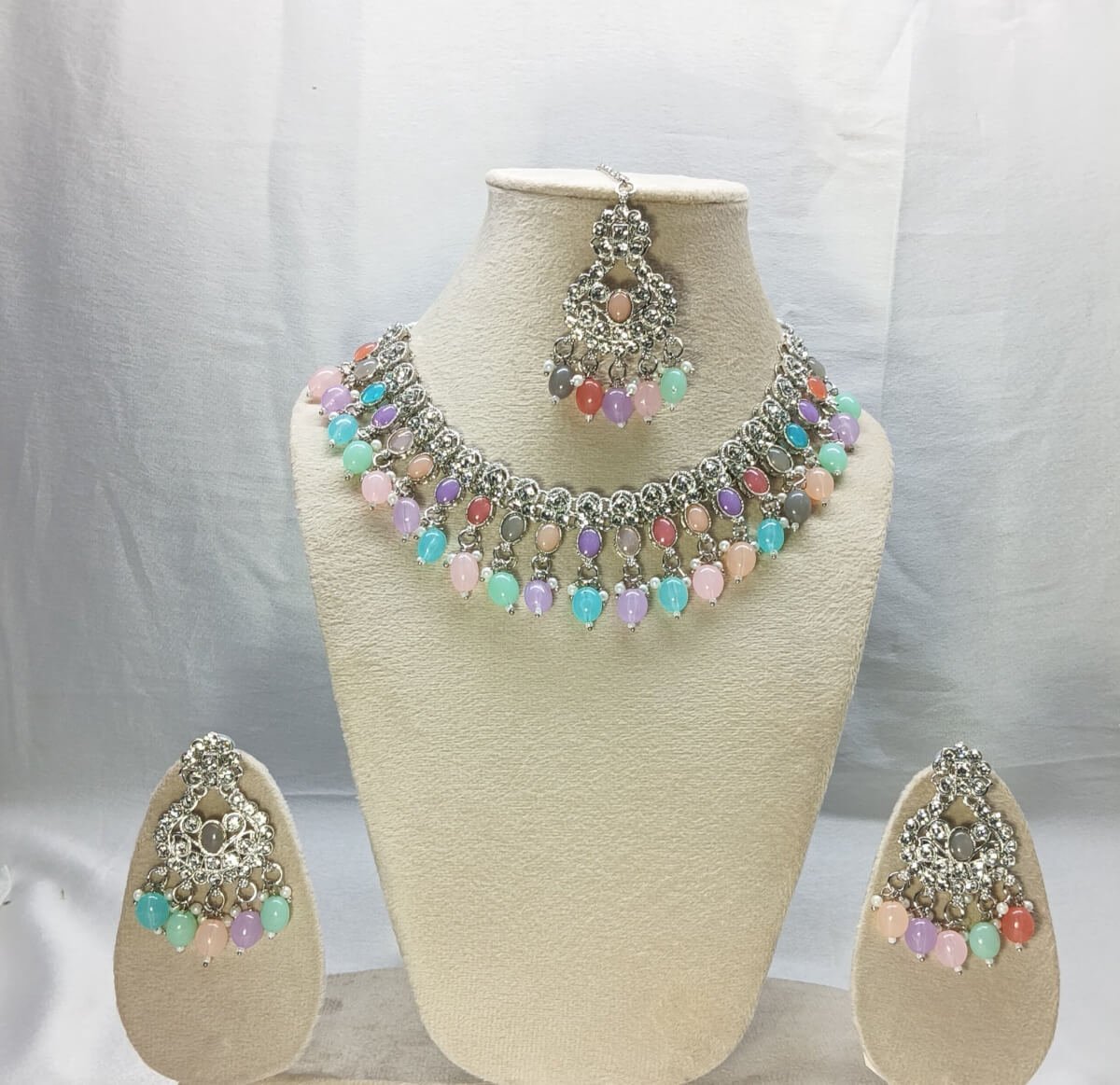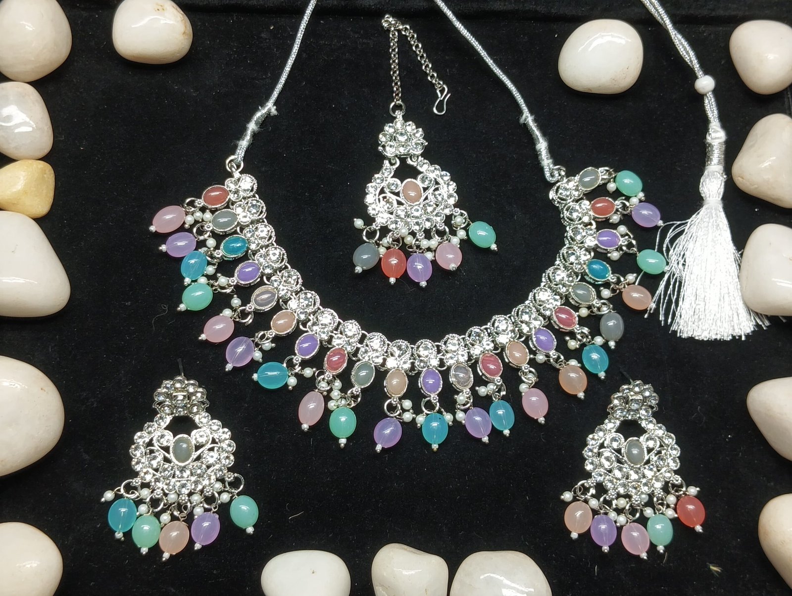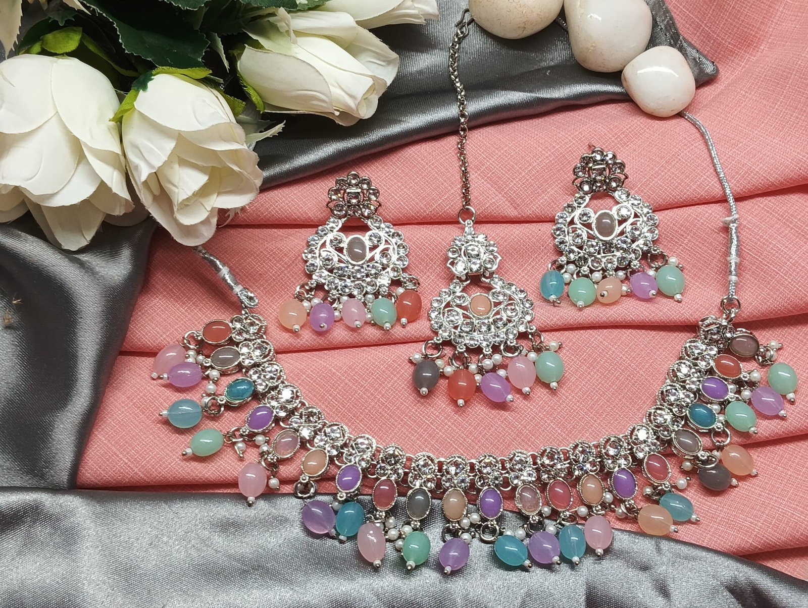 - PRODUCT DETAILS: Add a touch of soft elegance to your jewelry collection with this intricately crafted silver-toned necklace set, adorned with delicate pastel accents. The necklace features a graceful semicircular design with detailed metalwork, highlighted by shimmering clear stones and oval-shaped pastel beads in shades of pink, blue, green, and lavender.The coordinated earrings reflect the same refined design, incorporating a harmonious mix of clear stones and pastel beads arranged in a circular pattern. Completing the trio is a matching maang tikka that mirrors the necklace and earrings in both craftsmanship and color palette. This lightweight set blends contemporary charm with traditional elements, making it a versatile accessory for festive gatherings, casual celebrations, or formal occasions.