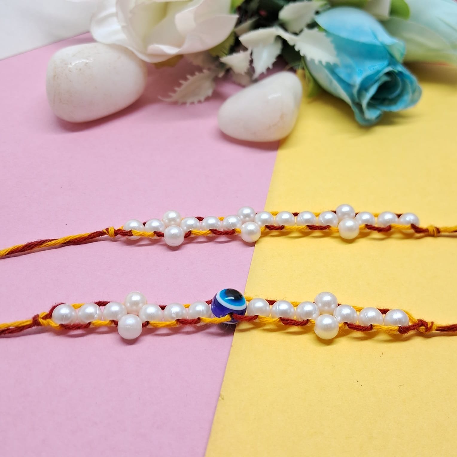 - PRODUCT DETAILS: Celebrate the special bond between siblings with this exquisite set of 2 handmade pearl rakhis. Featuring vibrant red and yellow threads intertwined with elegant pearls and a protective evil eye bead, these rakhis perfectly blend tradition with modern charm. Crafted with care using skin-friendly materials, they promise durability and comfortable wear. This thoughtfully designed set also includes roli and chawal, providing everything you need for a meaningful Raksha Bandhan celebration. Whether your brother prefers classic elegance or symbolic accessories, these rakhis make a heartfelt gift that conveys your love and blessings in the most beautiful way. Make this Raksha Bandhan memorable by gifting a thread of love that stands for protection, care, and lifelong bonding.