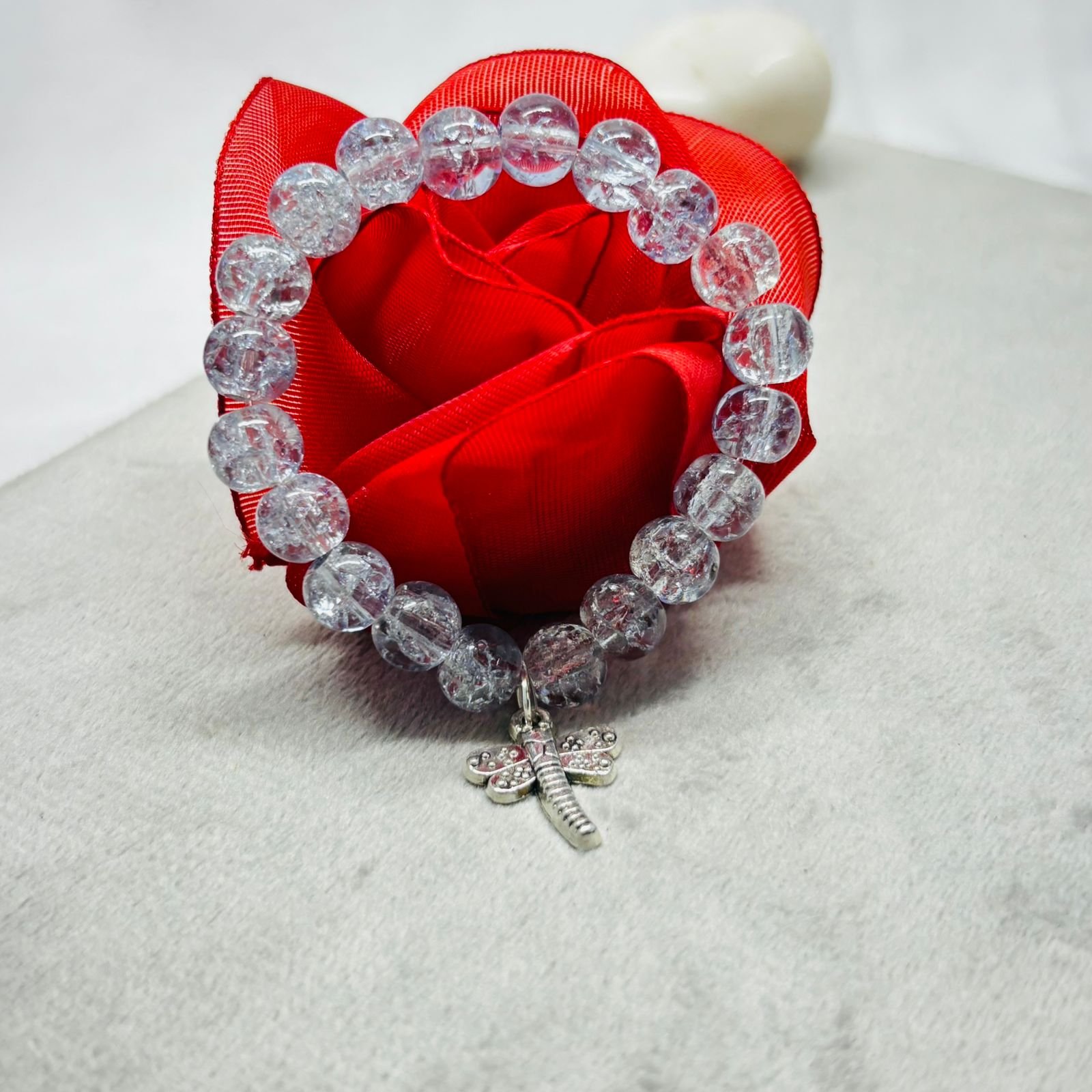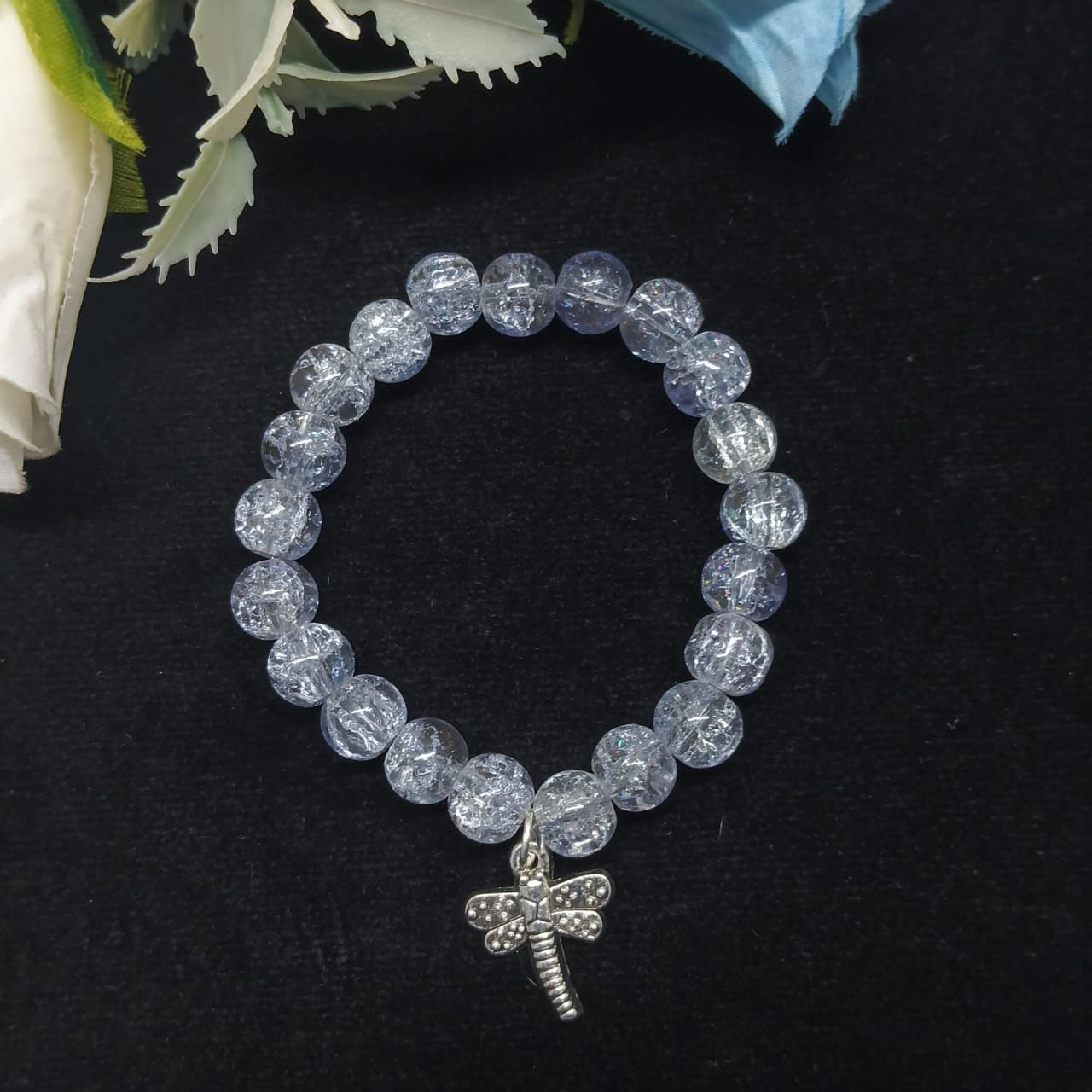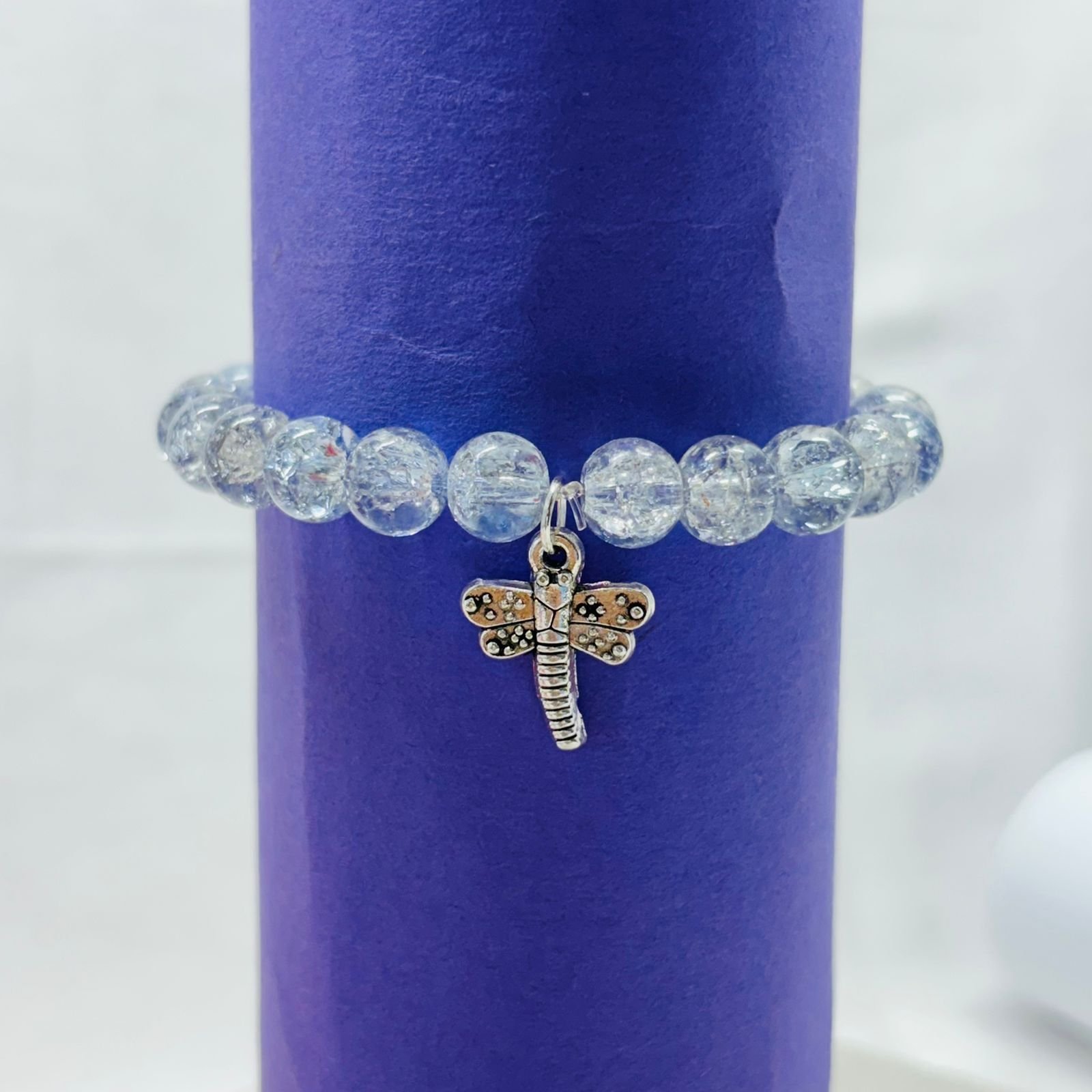 - PRODUCT DETAILS: Infuse your look with sparkling elegance with this stretch bracelet features translucent crackle glass beads that shimmer as they catch the light. The crackle effect is crafted by heating then rapidly cooling the glass, creating unique internal fractures that reflect beautifully. The result is a one-of-a-kind visual texture . At its heart rests a delicate dragonfly charm, symbolizing transformation, adaptability, and new beginnings—a graceful charm that adds both meaning and charm to your wrist.