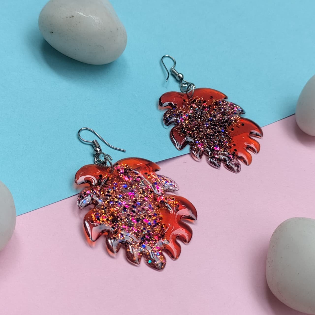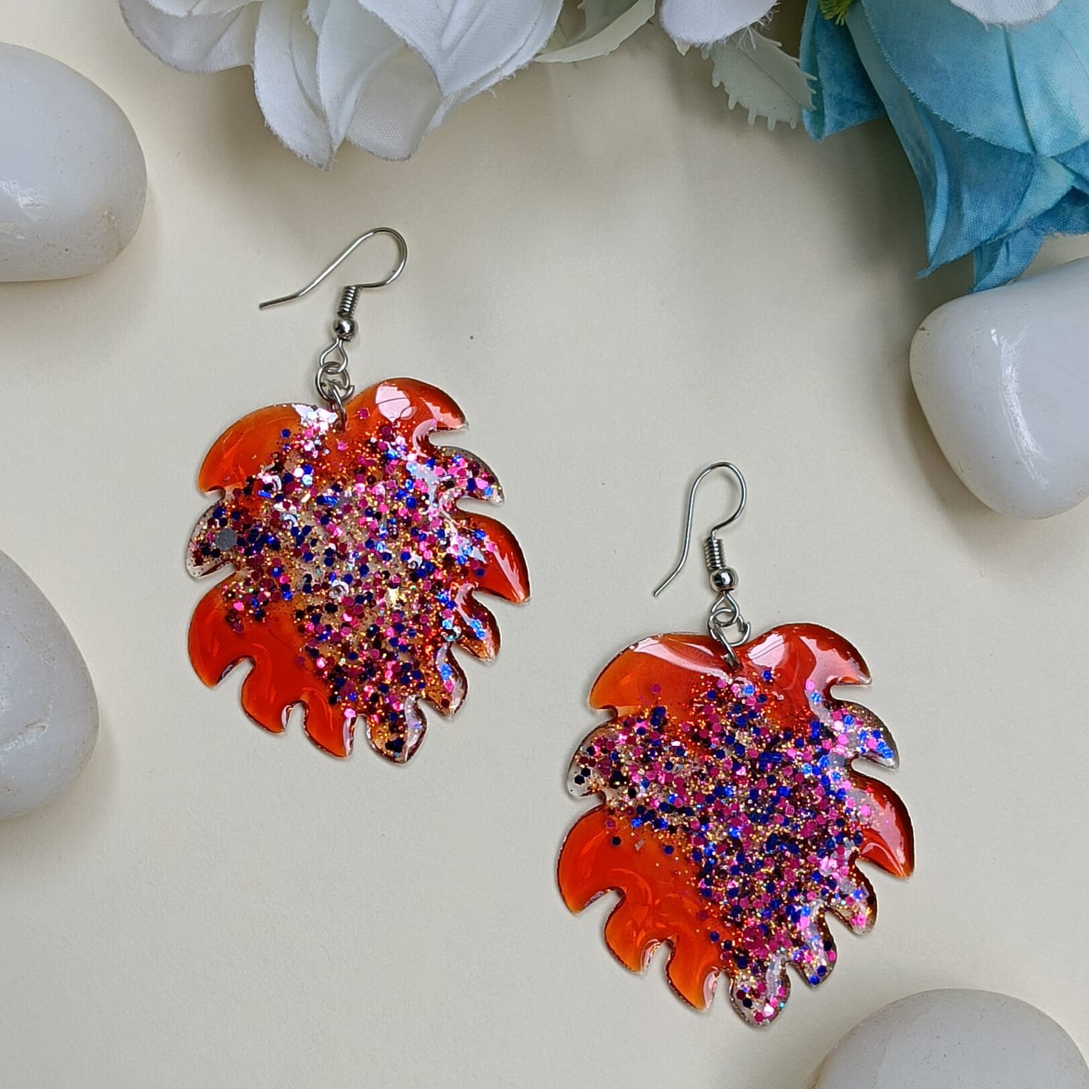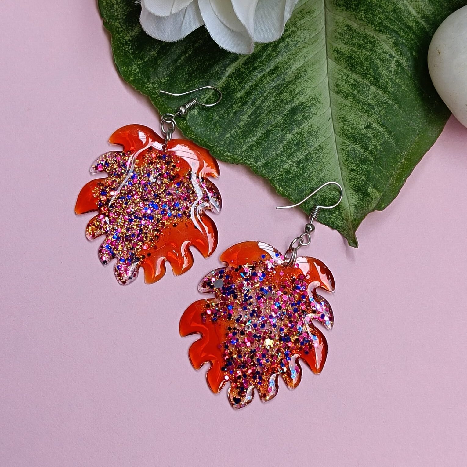 - PRODUCT DETAILS: Bring a bold and tropical flair to your style with these sparkling red Monstera leaf earrings. Handcrafted from lightweight resin, each piece features the iconic leaf silhouette filled with radiant red glitter that shines beautifully in the light. Designed for comfort with hypoallergenic hooks, these dangle earrings are perfect for sensitive ears and easy all-day wear. Whether styled with casual outfits, beach vacation looks, or festive ensembles, they add a playful yet glamorous touch. A versatile accessory and thoughtful gift for anyone who loves statement or nature-inspired jewelry.