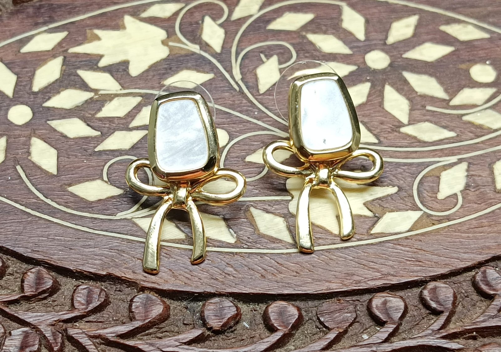 - PRODUCT DETAILS: Elevate your accessory collection with these uniquely elegant earrings that blend structure and grace. A rectangular, opaque pearlescent stone forms the centerpiece, nestled within a sleek gold-toned metal frame. Extending from the base, the frame unfurls into a graceful bow-like motif with flowing curves, tapering into two elongated, ribbon-inspired tails. This interplay of geometric form and fluid lines creates a sophisticated silhouette that feels both modern and timeless. Lightweight and delicately detailed, these earrings are versatile enough to complement both everyday looks and special occasion ensembles.