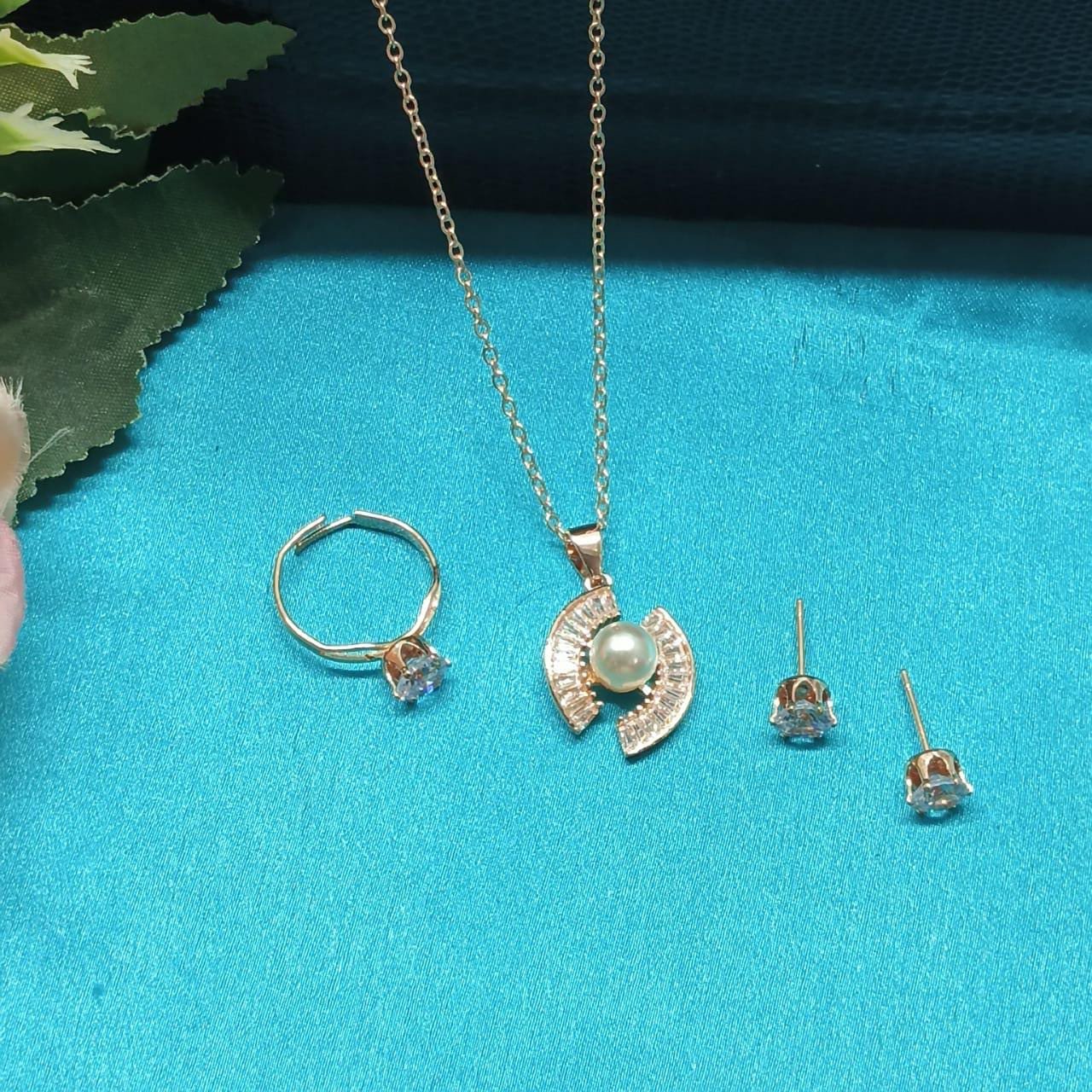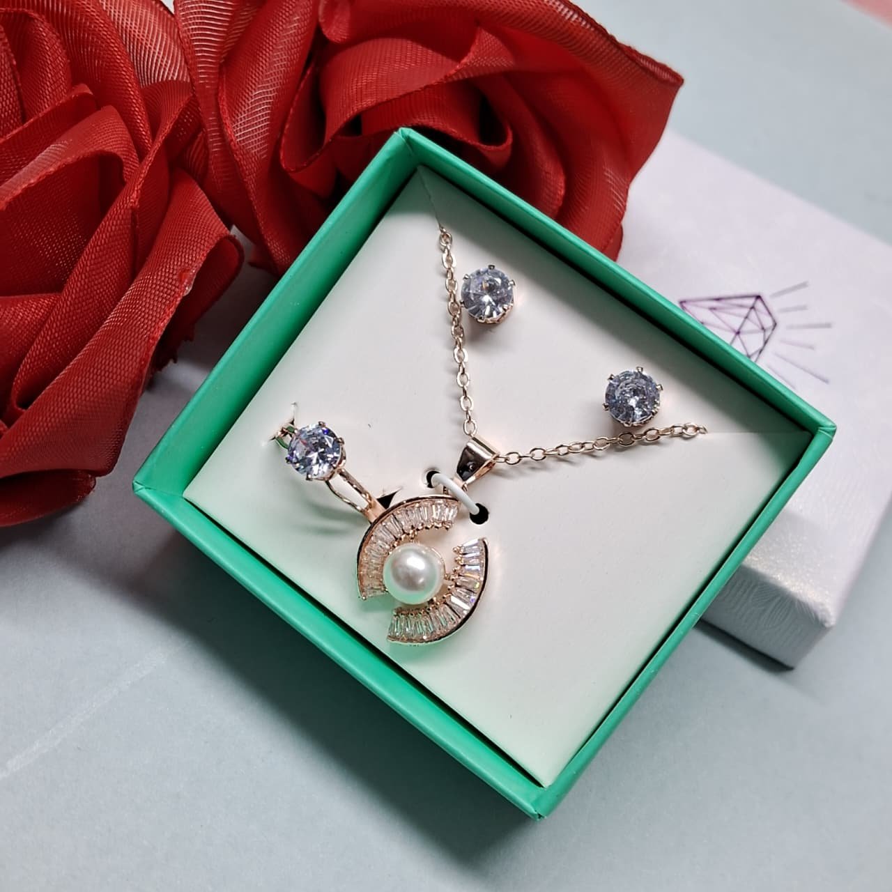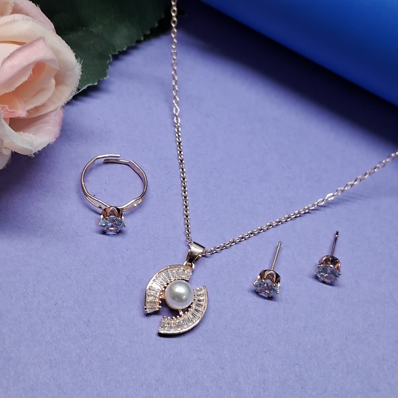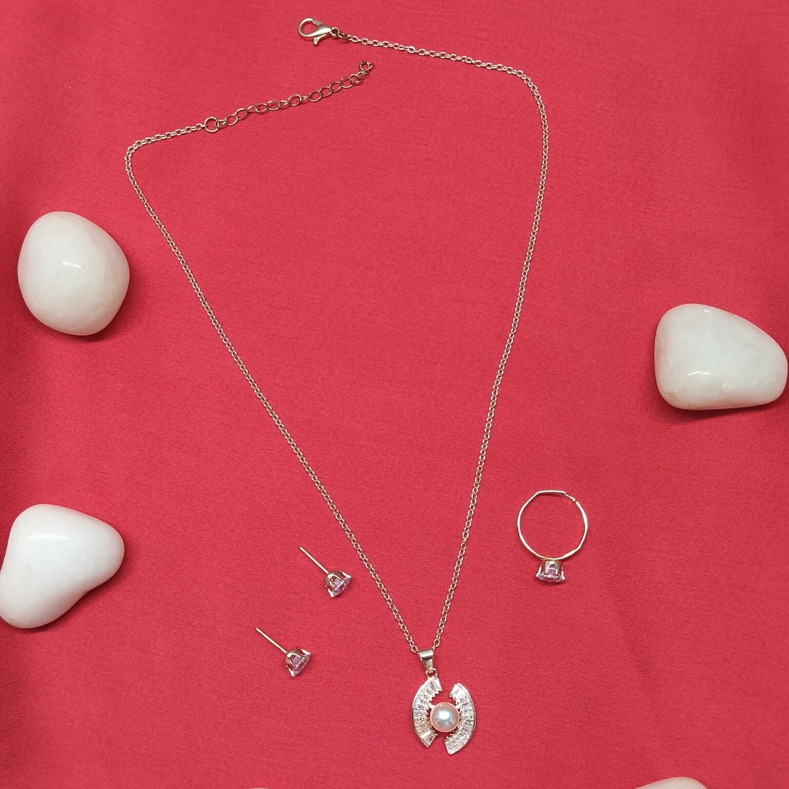 Rose Gold Jewelry Set | Pearl Pendant Necklace with Crystal Earrings & Matching Ring | Delicate Accessories for Gifting & Celebrations
