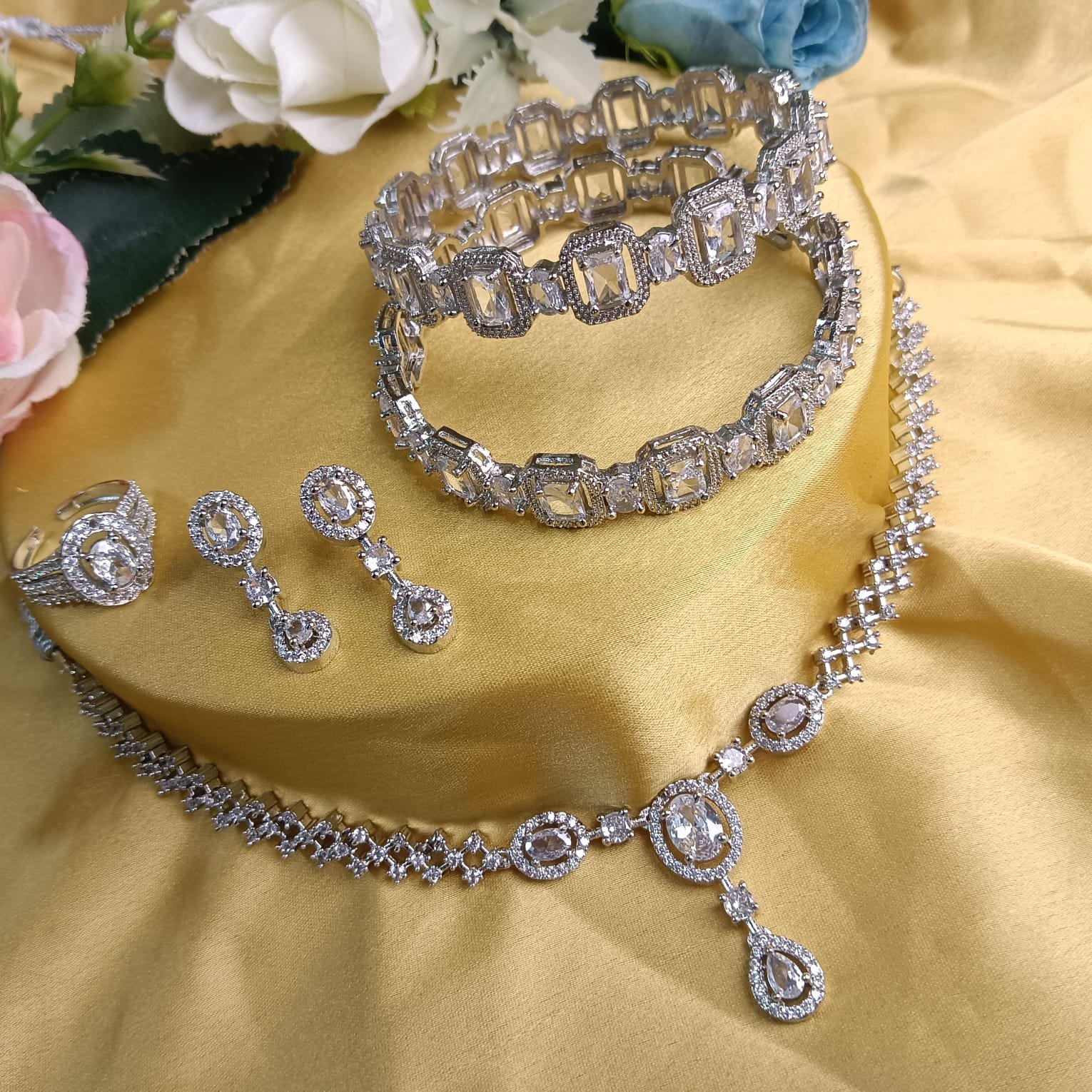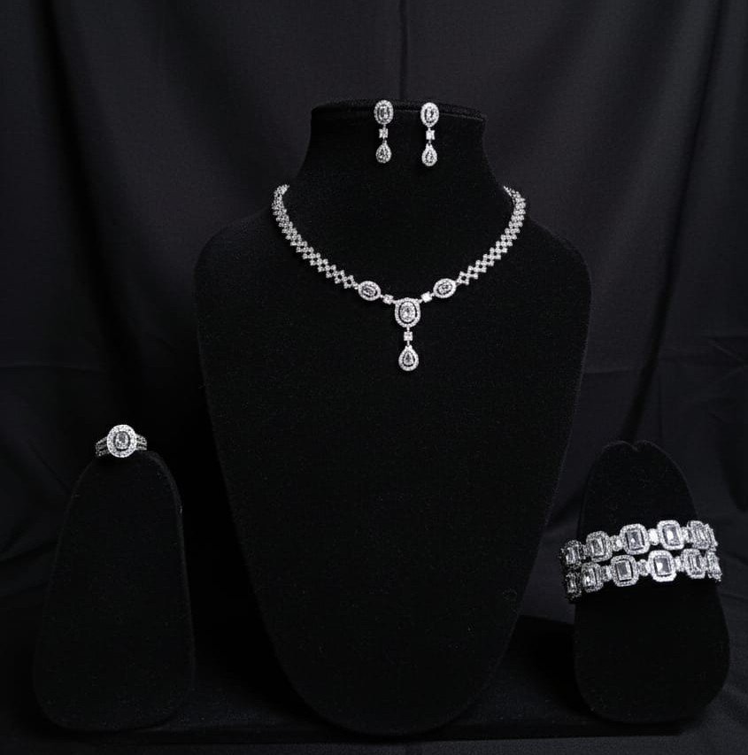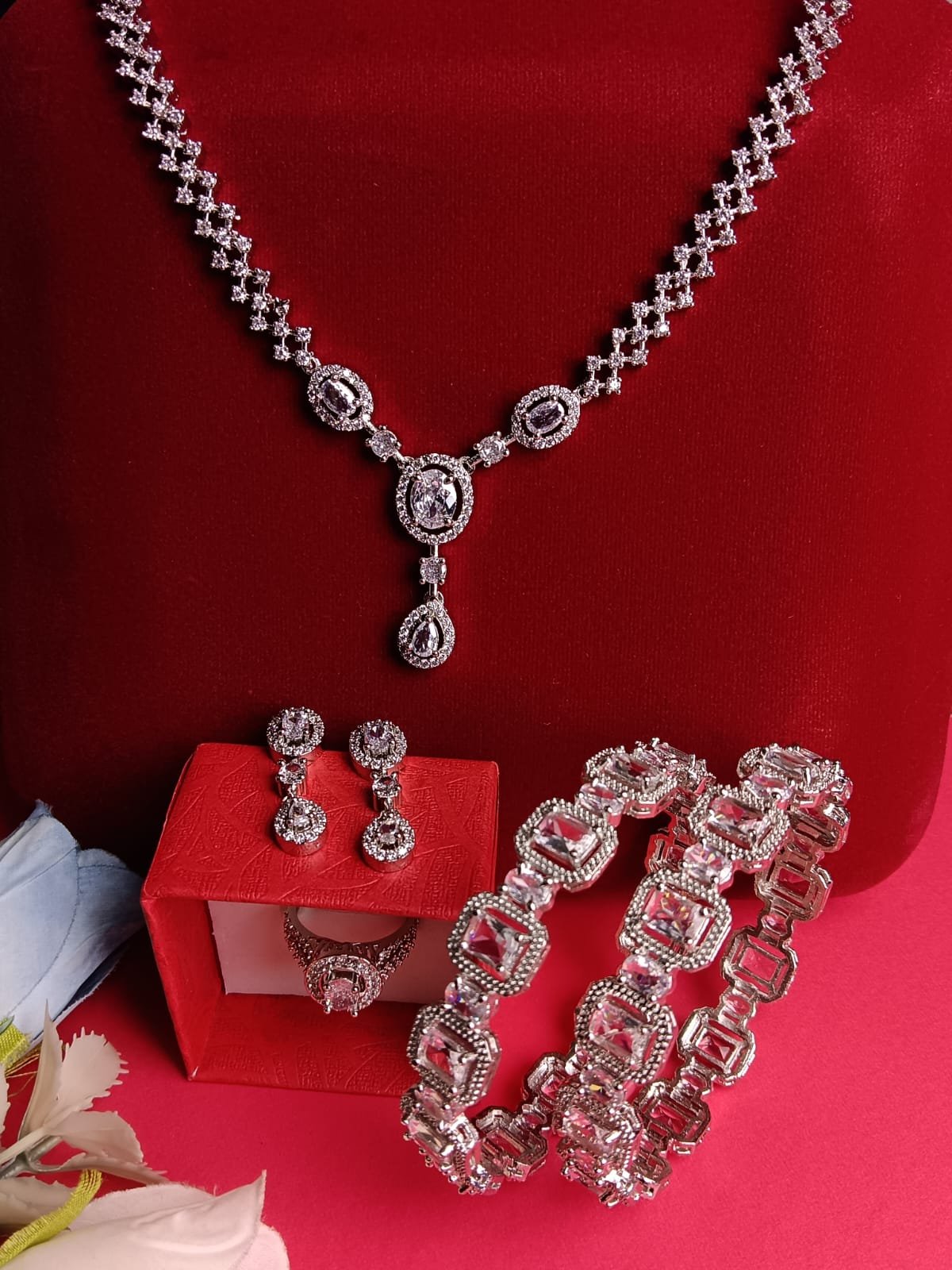 - PRODUCT DETAILS: Indulge in timeless sophistication with this premium silver-tone CZ jewelry combo set, masterfully crafted to elevate every special moment. Designed with a harmonious blend of oval and teardrop stones, this ensemble radiates a refined brilliance that feels luxurious yet effortlessly elegant. The necklace features a graceful silhouette with precisely set cubic zirconia stones, creating a soft, luminous sparkle that complements both modern and traditional outfits. Matching drop earrings, a statement bracelet, and a beautifully detailed ring complete the look—making this set the perfect companion for weddings, receptions, engagements, festive celebrations, or upscale soirées. Every piece in this combo set reflects meticulous craftsmanship and a high-polish finish, giving it a premium, diamond-like presence. Whether worn together for a striking statement or individually for subtle sophistication, this jewelry set promises to enhance your style with charm, grace, and undeniable luxury.