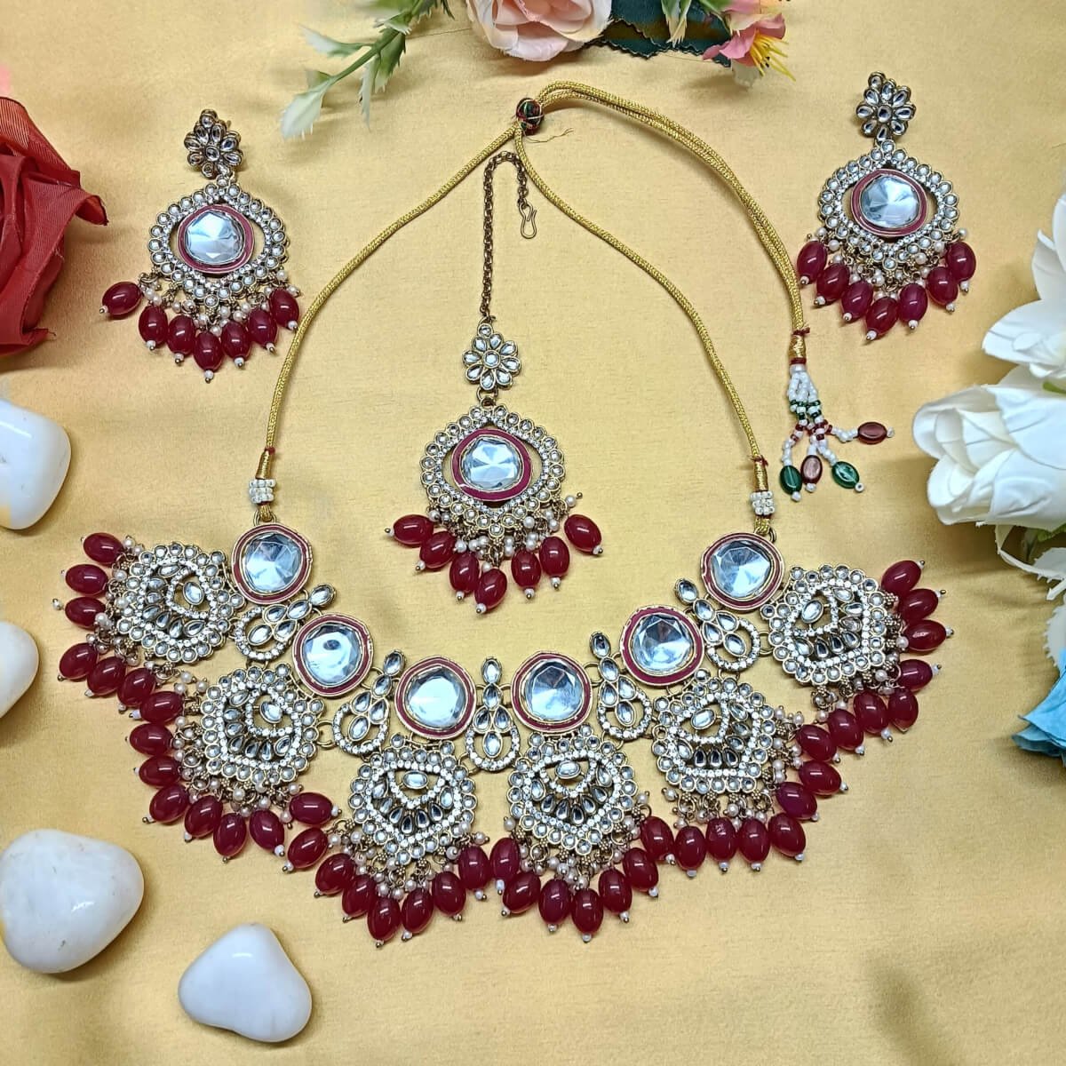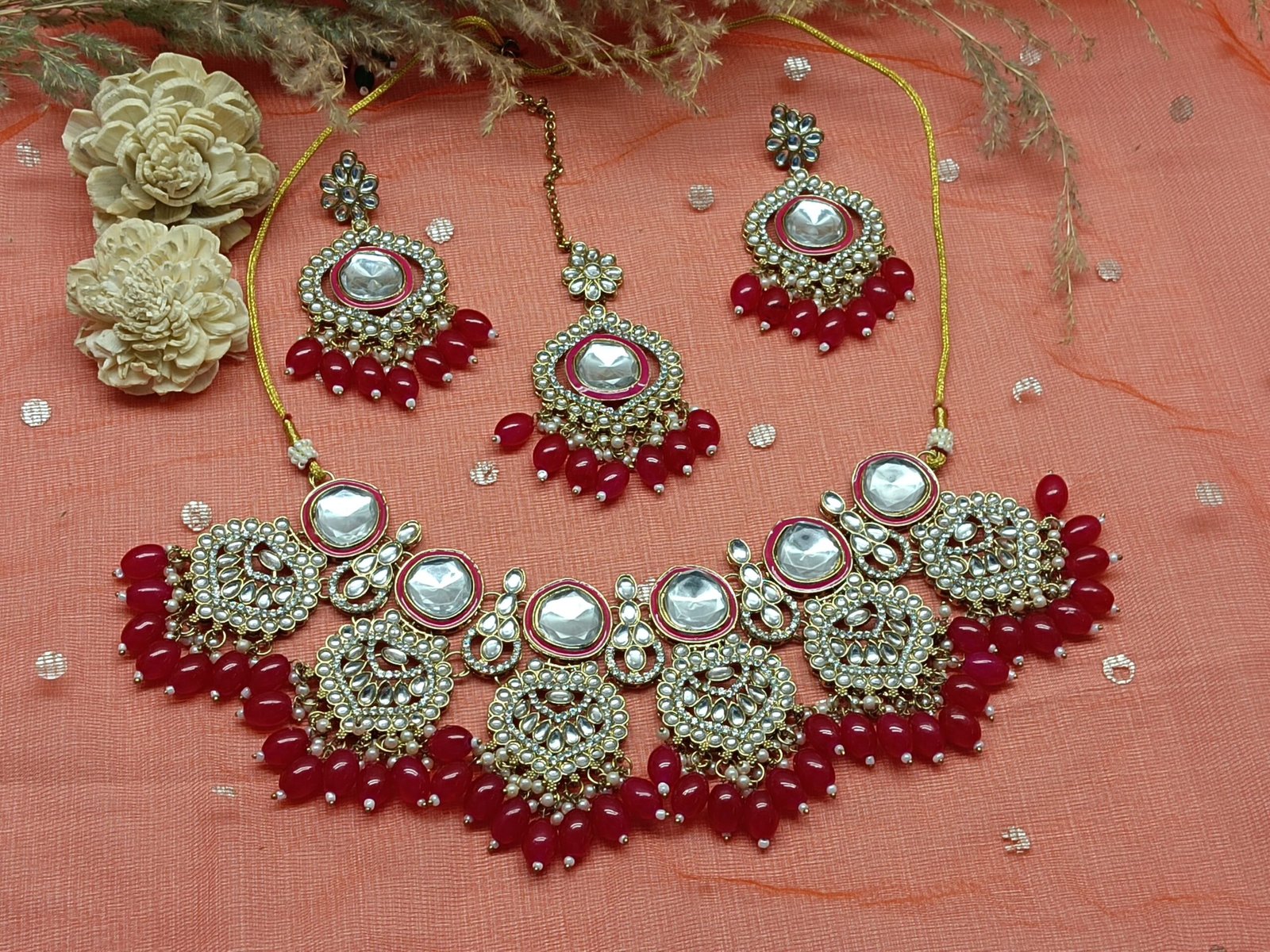 - PRODUCT DETAILS: Make a statement at any special event with this elegant gold-toned Kundan jewelry set, featuring a beautifully detailed necklace, matching earrings, and maang tikka. The intricate Kundan-inspired stones are complemented by shimmering artificial pearls and vibrant red beads, adding a graceful pop of color and sophistication. The necklace showcases a harmonious blend of floral and paisley motifs, while the earrings and tikka echo the same refined artistry. Perfect for weddings, festivals, and traditional ceremonies, this set enhances any ethnic outfit with timeless charm and vibrant elegance.