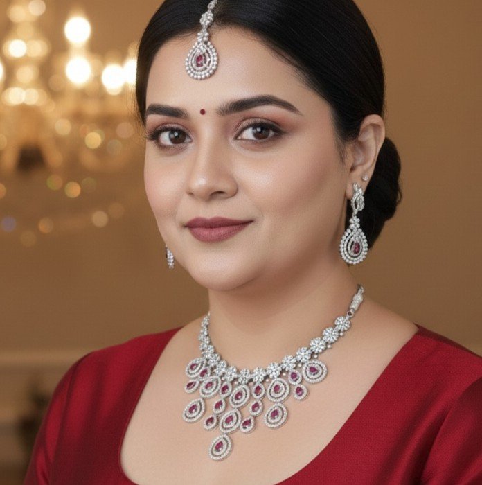 - PRODUCT DETAILS: Bring a regal touch to your special day with this Ruby Teardrop AD Bridal Necklace Set, crafted to add breathtaking sparkle and richness to your wedding or festive ensemble. The necklace features cascading ruby red teardrop accents, outlined beautifully with shimmering American Diamonds for a bold, luxurious look. The row is adorned with delicate floral diamond motifs, creating a harmonious balance between elegance and grandeur. Paired with matching earrings and a Maang tikka, this set completes your bridal look with effortless sophistication.