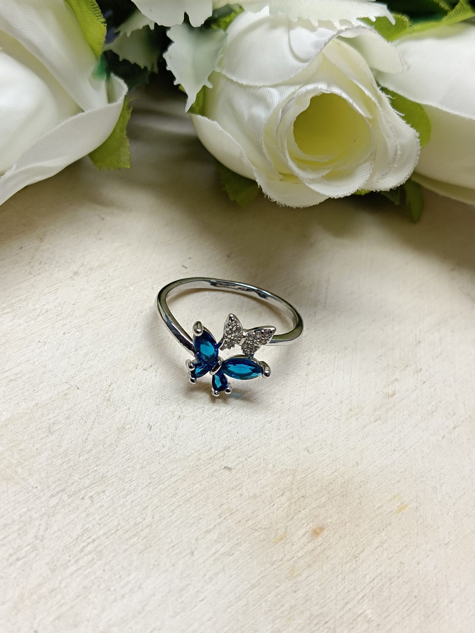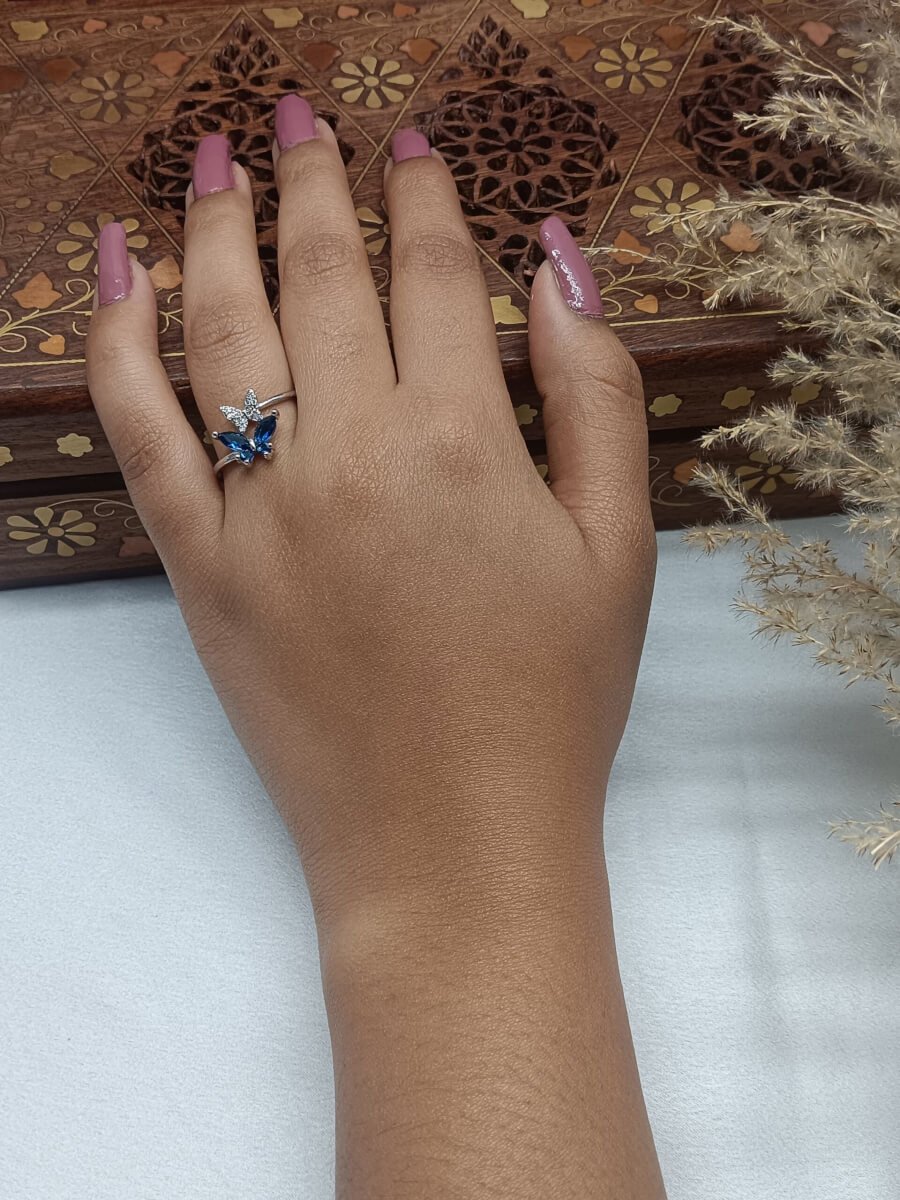 - PRODUCT DETAILS: Celebrate the beauty of change with this graceful butterfly ring, crafted from silver-plated alloy. One wing sparkles with clear glass stones, while the other features rich blue gemstone-like accents—symbolizing serenity, clarity, and personal growth. Delicate yet meaningful, this ring serves as a reminder of the strength found in transformation. Its slender band ensures comfort, making it perfect for both everyday elegance and special occasions.