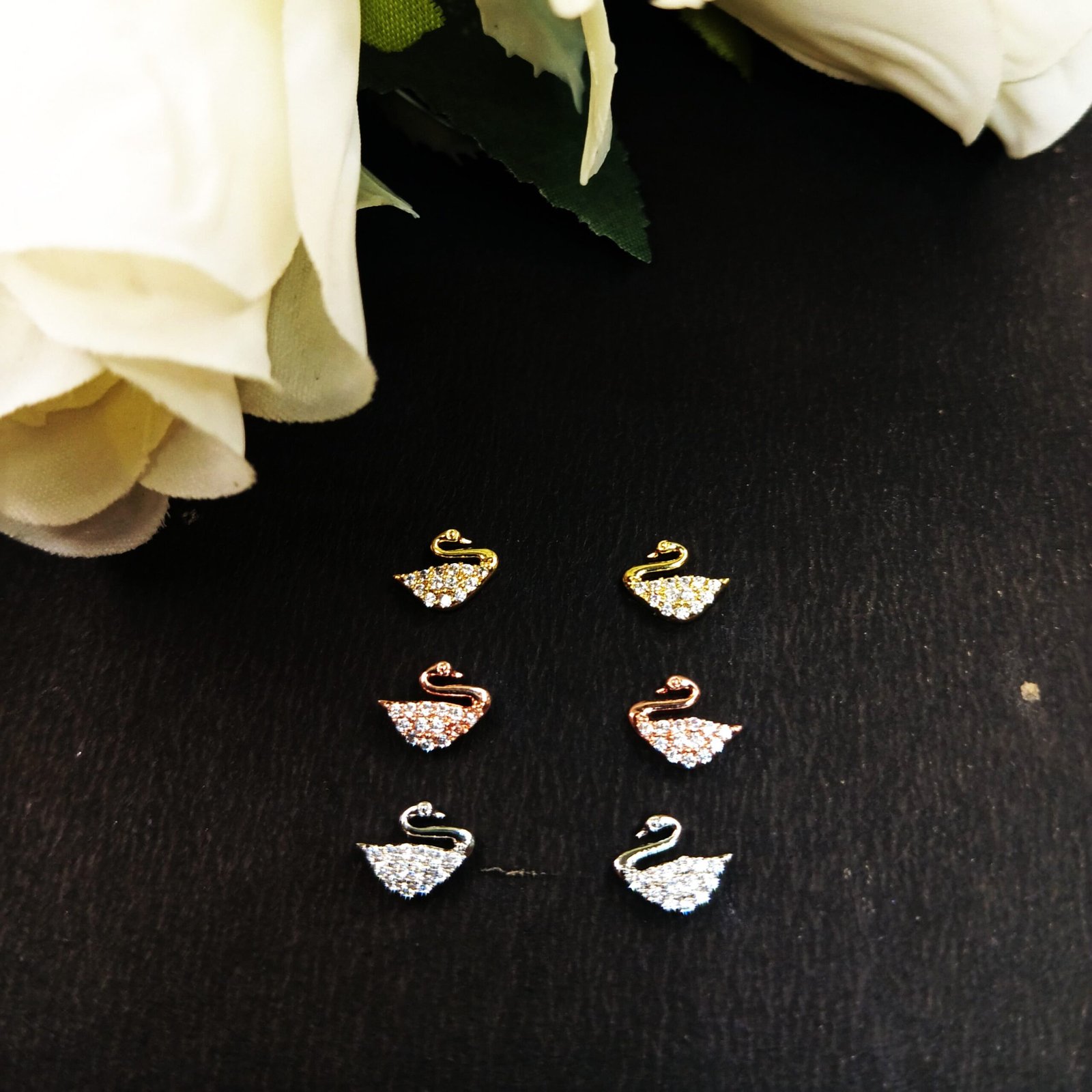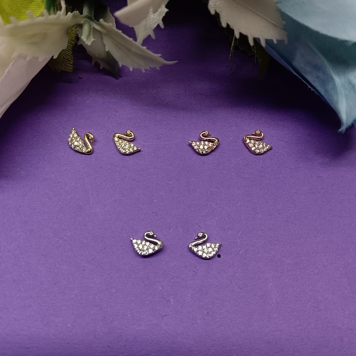 - PRODUCT DETAILS: Add a graceful finishing touch to your look with this beautifully designed set of swan motif stud earrings. The combo includes three elegant pairs—each crafted in a different metal tone: classic silver, warm rose gold, and rich yellow gold. Inspired by the timeless beauty of the swan, these earrings are delicately encrusted with clear crystal accents that shimmer softly in the light. Whether you’re dressing up for a dinner, heading to work, or just elevating your everyday style, these earrings offer versatile charm. You can wear them solo or mix and match depending on your outfit and mood. Thoughtfully designed, they’re lightweight and comfortable, making them a lovely choice for gifting—or for treating yourself.