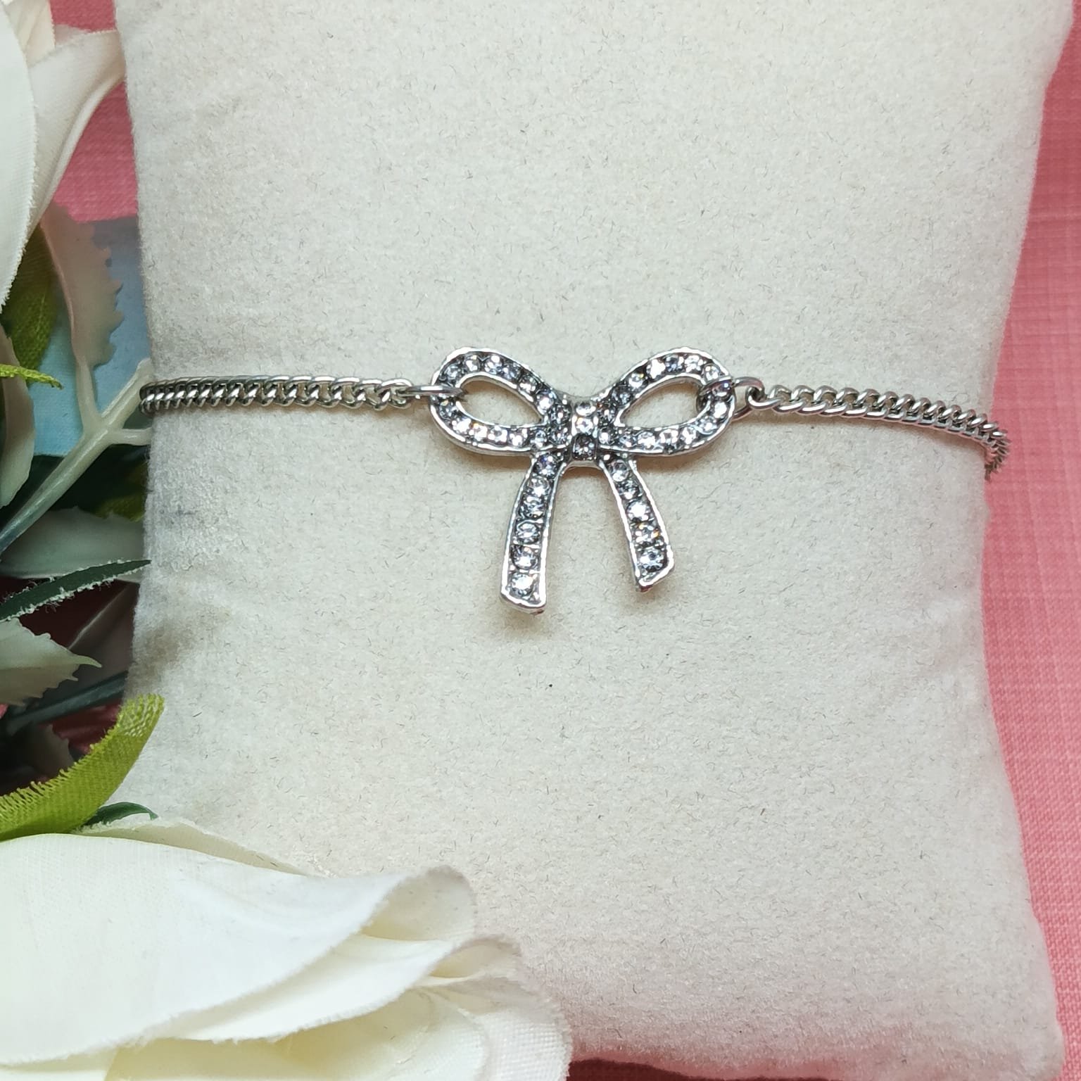 - PRODUCT DETAILS: Chic and charming, this silver-tone bracelet showcases a beautifully crafted bow charm at its center — a timeless symbol of grace and femininity. Accented with sparkling clear stones, the bow adds a subtle touch of glamour to this minimalist piece, making it perfect for both casual styling and elegant looks. The bracelet is made from high-quality silver-toned alloy and finished with a secure lobster clasp, ensuring durability and ease of wear. Lightweight and comfortable, it layers effortlessly with other pieces or shines on its own as a refined accessory. Whether you’re treating yourself or surprising someone special, this bracelet is a meaningful addition to any jewelry collection.