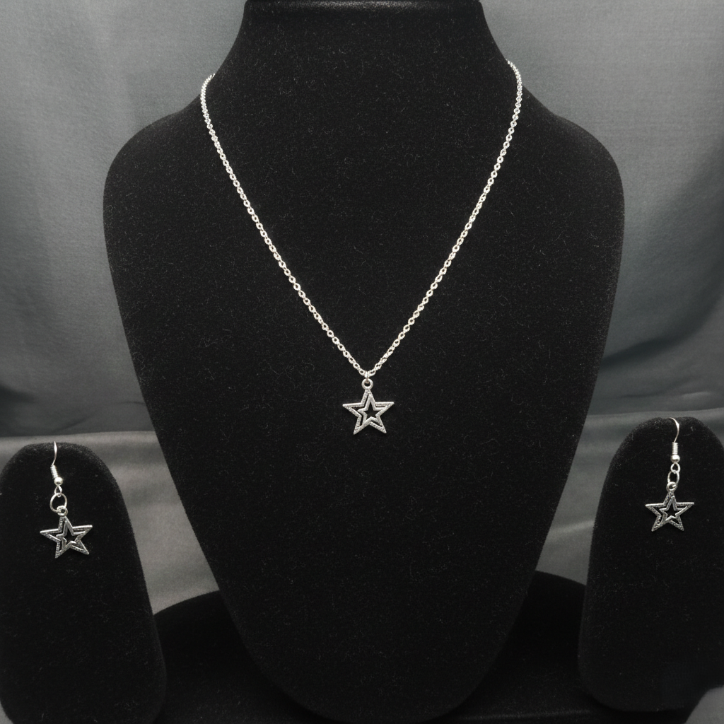 - PRODUCT DETAILS: Shine bright with this celestial-inspired jewelry set featuring a matching star pendant necklace and earrings. Crafted in a sleek silver tone, the five-pointed star design adds a touch of whimsy and modern charm to any outfit. The lightweight chain and delicate hook earrings make this set comfortable for all-day wear while offering a playful yet polished look. Perfect for daily styling, parties, and festive occasions, this set makes a beautiful gift for teens, young women, or anyone who loves minimalist and dreamy accessorie
