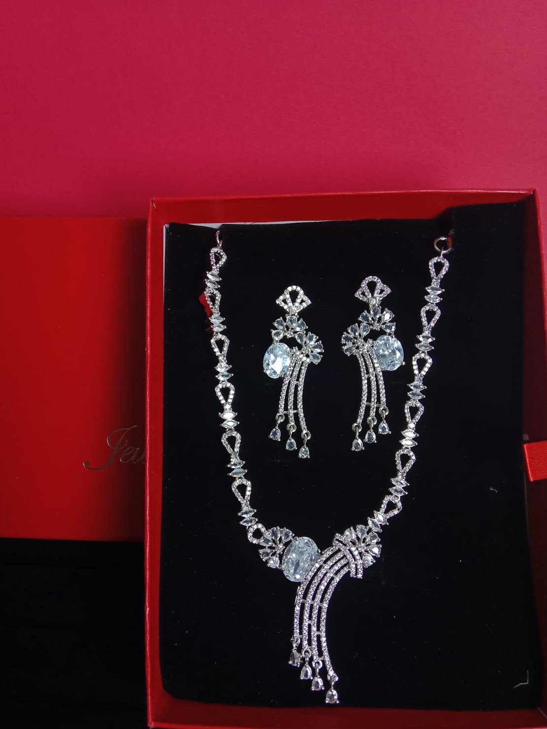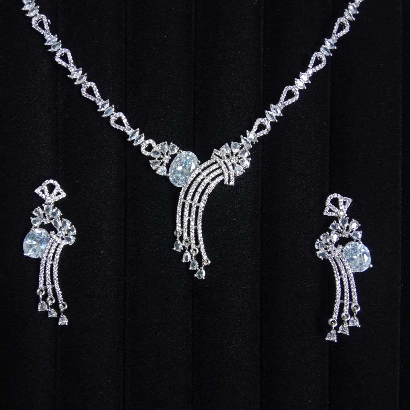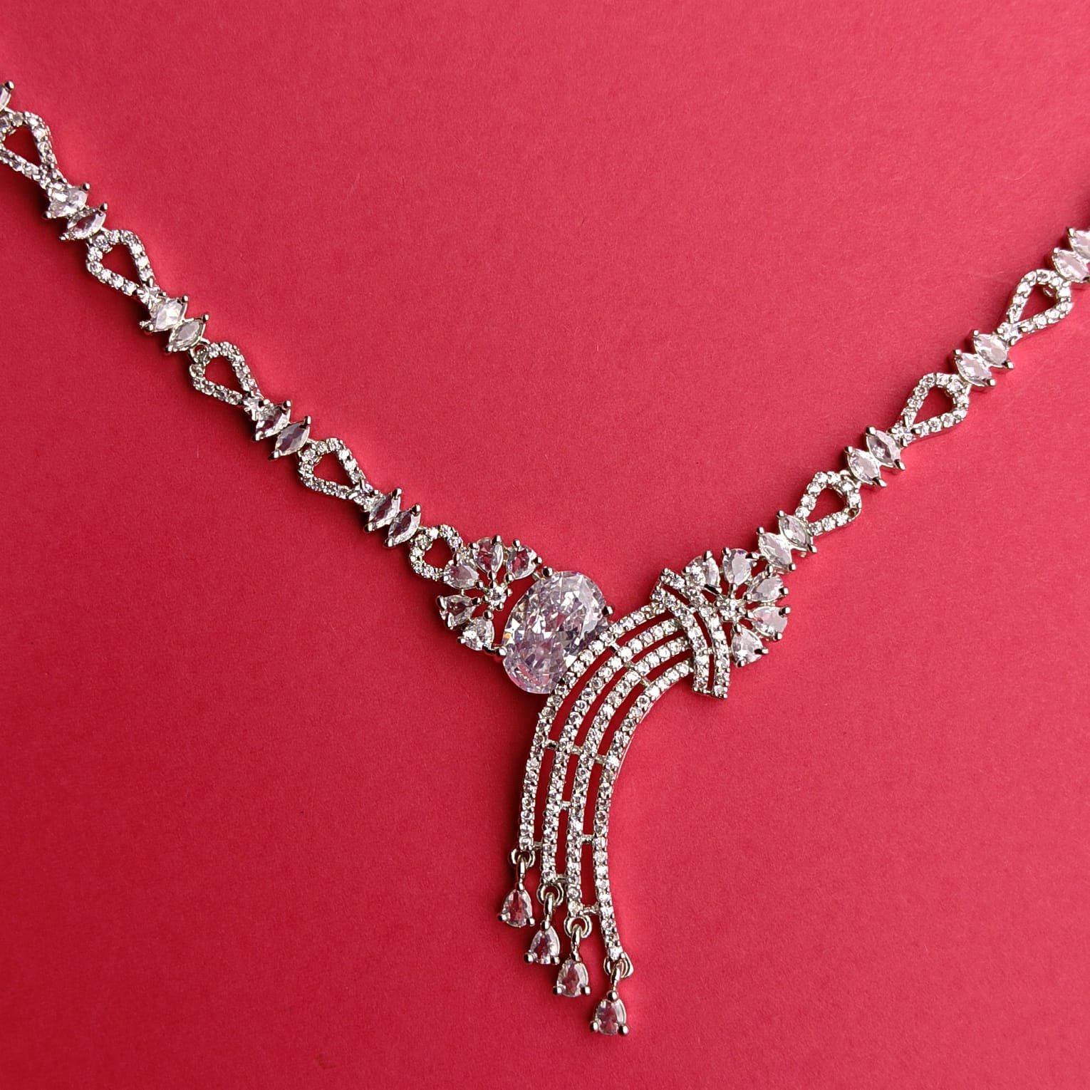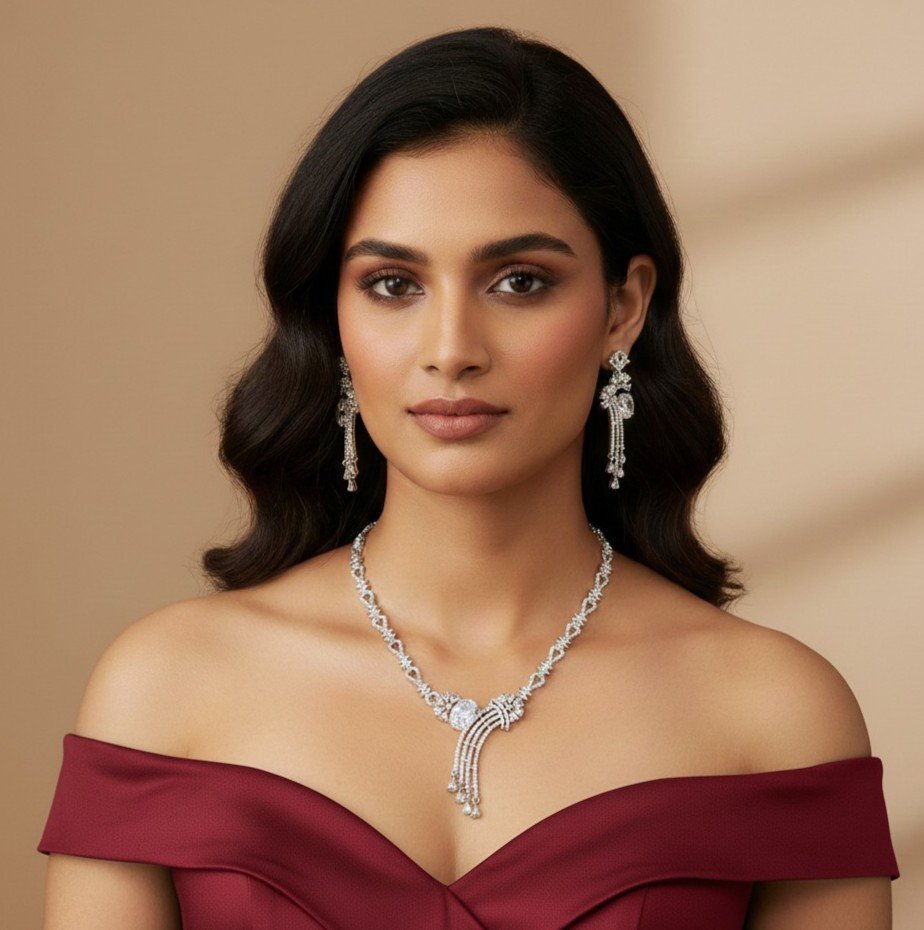 - PRODUCT DETAILS: Designed to turn heads with effortless sophistication, this CZ necklace set embodies modern elegance with a distinctive artistic twist. The centerpiece features a stunning cluster of sparkling stones, beautifully arranged to create a flowing, ribbon-like cascade that drapes gracefully along the neckline. This rare design makes the piece stand out—not just as jewelry, but as wearable art. The matching earrings echo the same sculpted detailing, with multi-strand drops that add movement, shimmer, and a glamorous finish. Every stone is placed to catch the light from every angle, giving the set a radiant brilliance perfect for evening events and celebrations. Whether paired with a sleek gown, a reception outfit, or elevated festive wear, this necklace set delivers a refined, statement-making look. Bold, graceful, and undeniably unique—it is crafted for those who appreciate jewelry that tells a story of style and individuality.