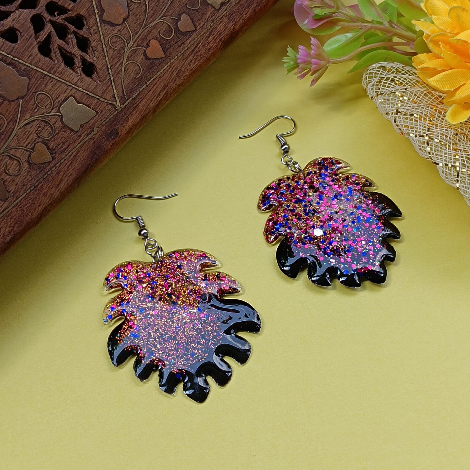 Sparkling Resin Leaf Dangle Earrings for Women | Glitter Lightweight Statement Jewelry | Ideal for Party & Festive