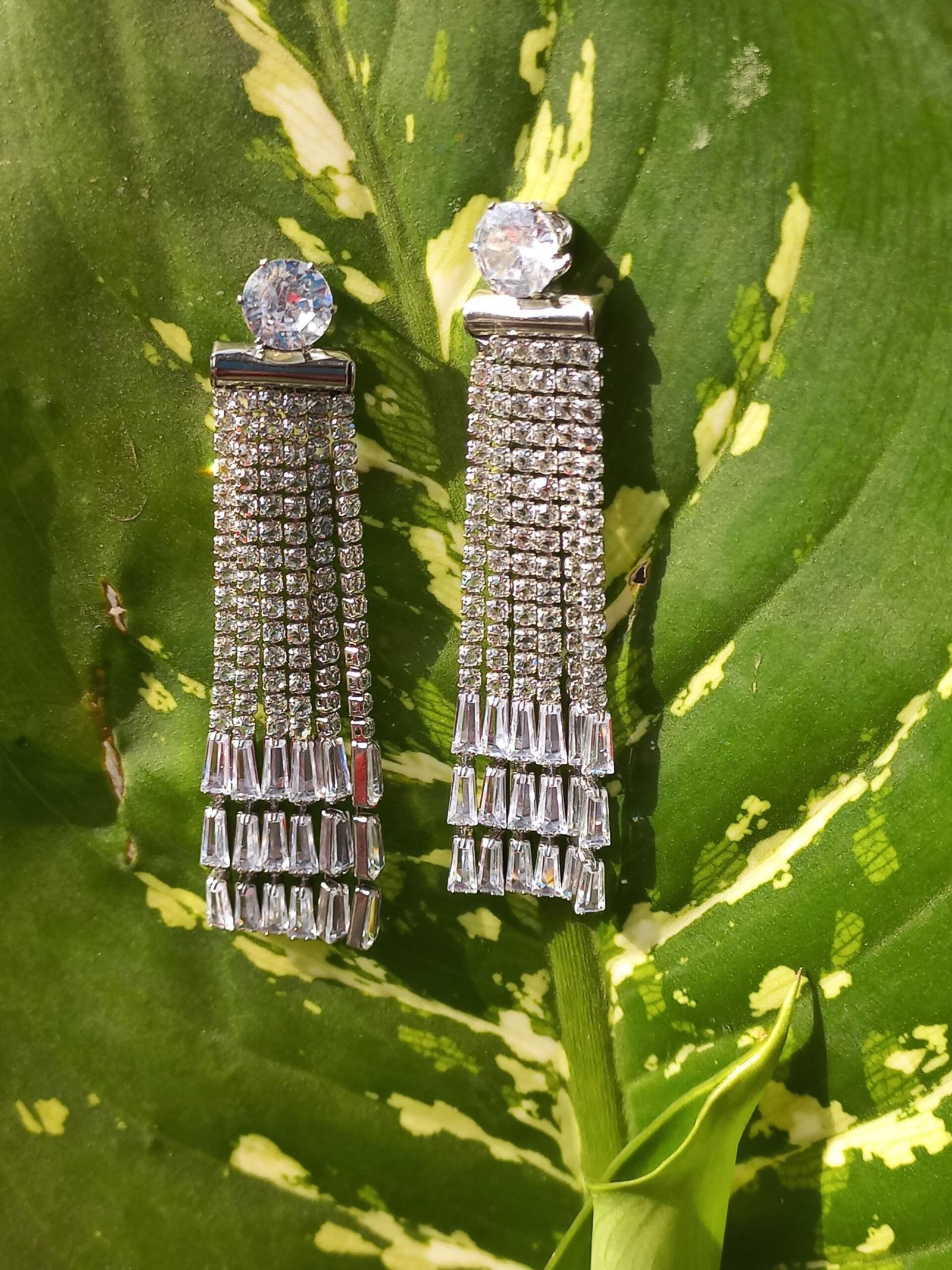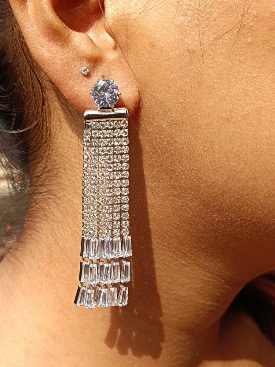 - PRODUCT DETAILS: Looking for earrings that effortlessly blend everyday glam with occasion-worthy sparkle? These silver rhinestone dangle earrings are the perfect pick. At the top sits a classic round rhinestone stud—simple, timeless, and radiant. But the real magic happens below: multiple rows of slender, rectangular rhinestones cascade down in a fringe-like pattern, creating a dazzling tassel effect that moves with you. Every subtle shift catches the light, making these earrings shimmer beautifully whether you’re in sunlight or under city lights. With a polished silver finish and lightweight feel, they’re easy to wear all day—or all night. Whether you’re dressing up your daily look or adding a finishing touch to a party outfit, these earrings strike that perfect balance between chic and statement-making.