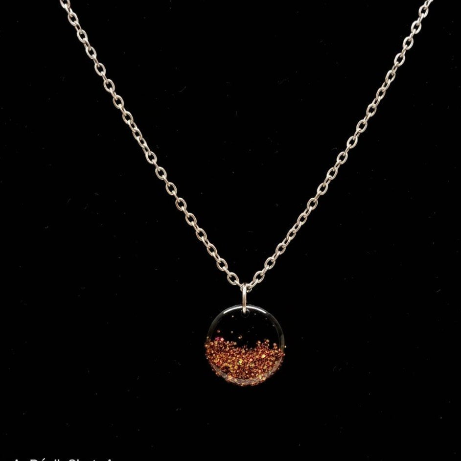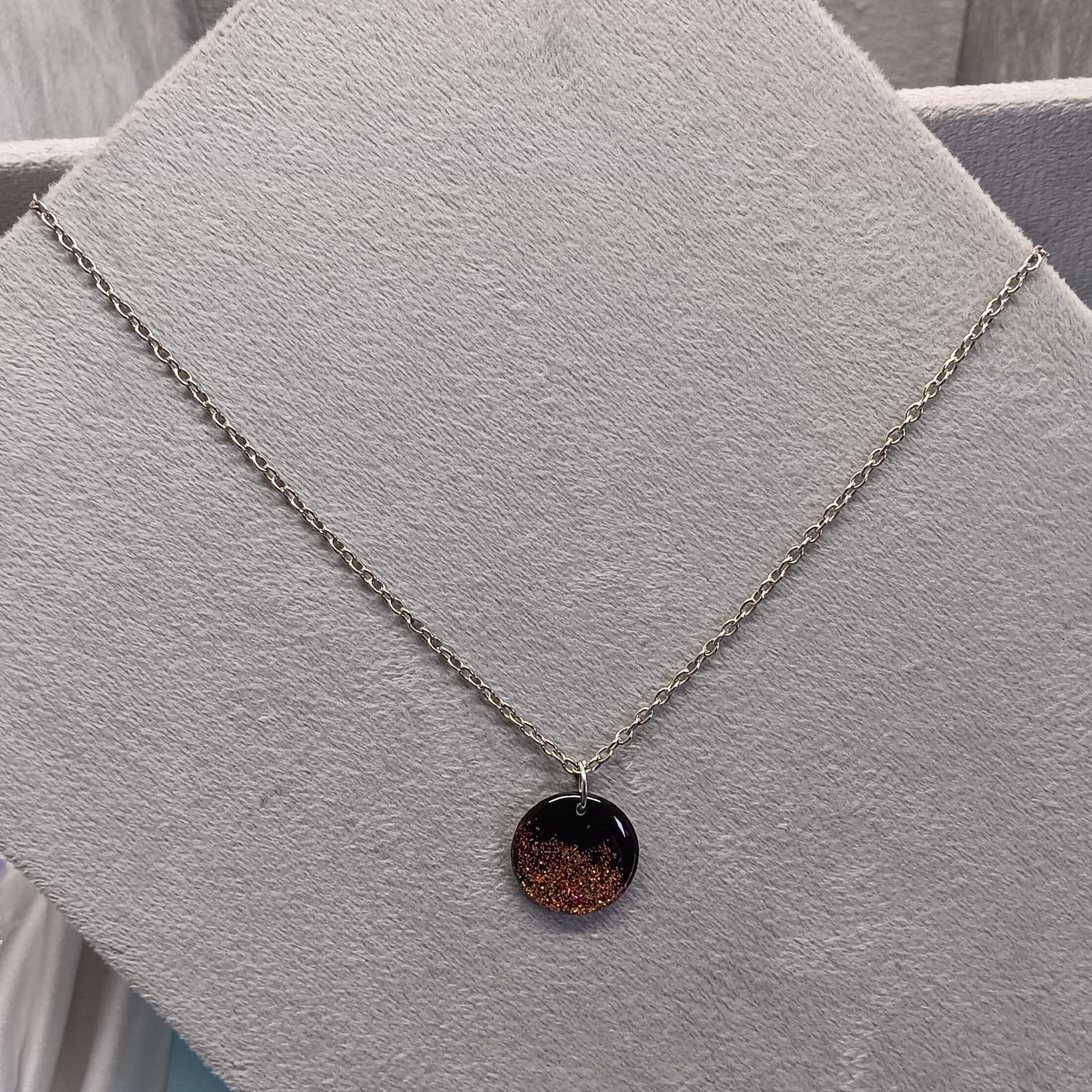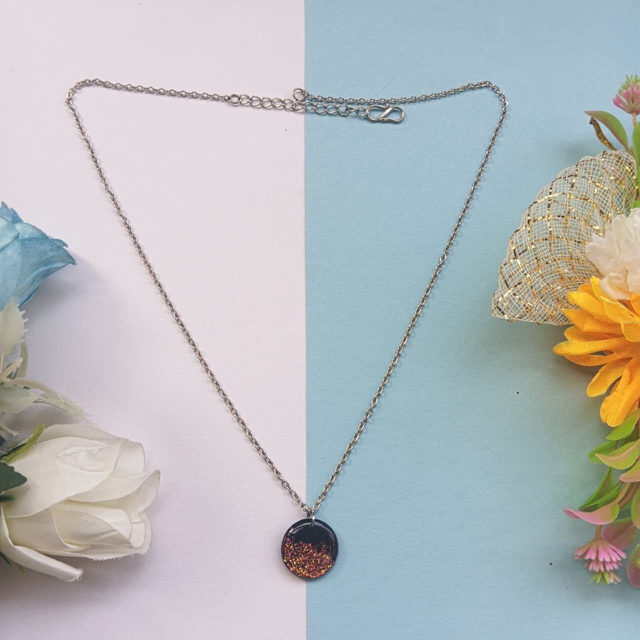 - PRODUCT DETAILS: Add celestial charm to your jewelry collection with this striking black resin pendant. Designed in a sleek round shape, it features embedded gold glitter and delicate flakes that shimmer like scattered stardust against a midnight sky. The radiant detailing creates a luxurious yet versatile look, perfect for elevating both casual ensembles and evening outfits.