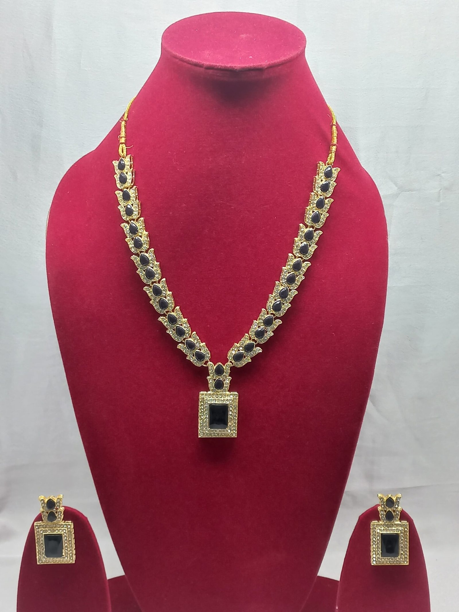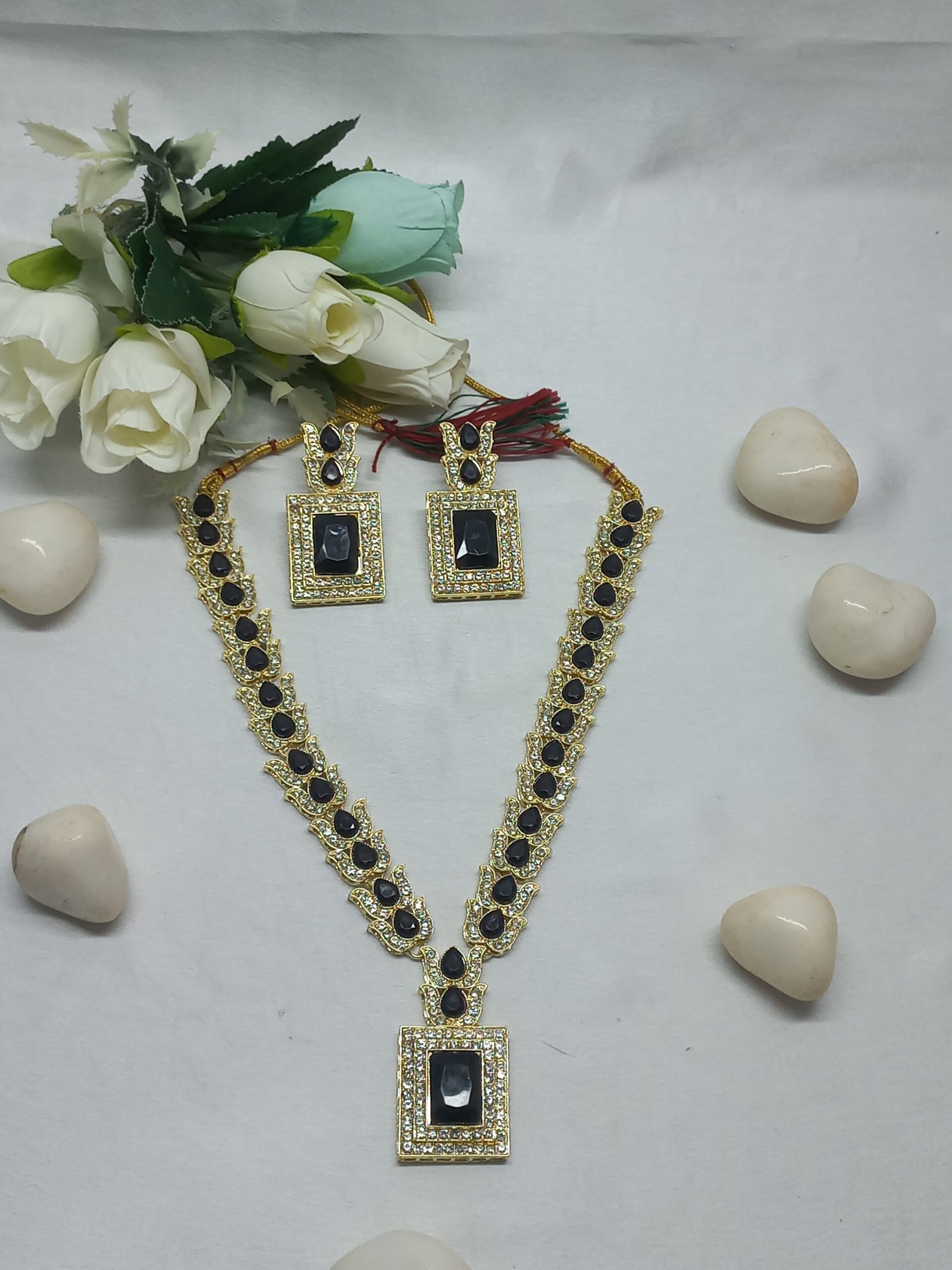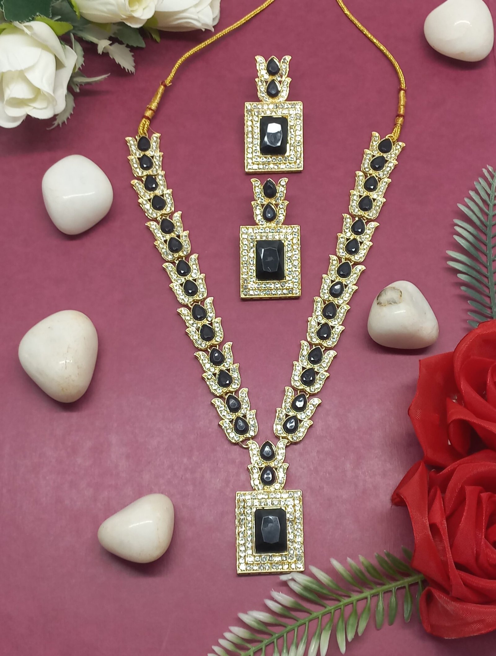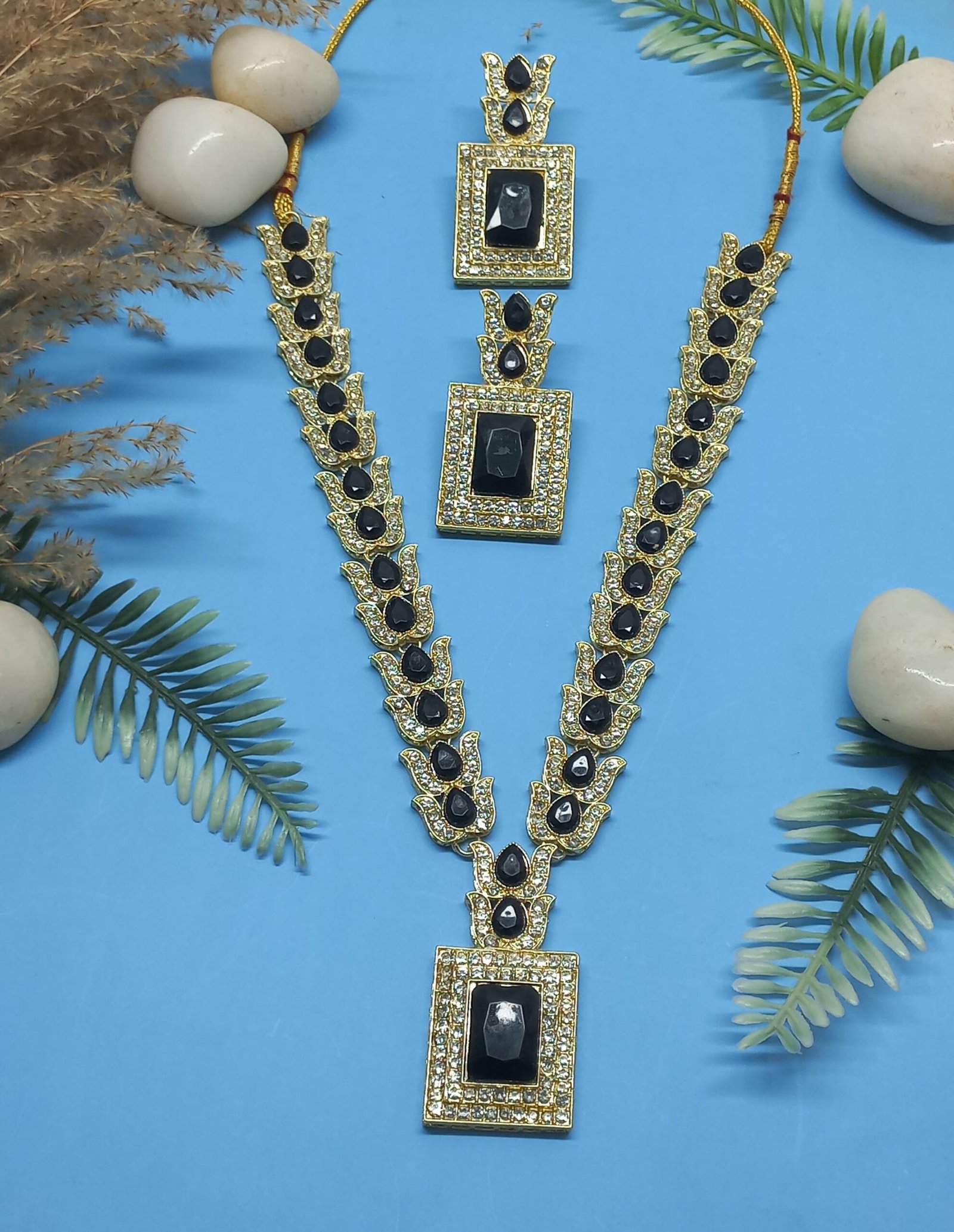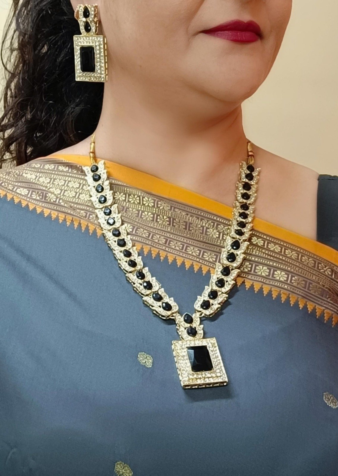 - PRODUCT DETAILS: This stunning necklace set features a long, elegant strand necklace paired with coordinating earrings, crafted from premium materials and finished with a gleaming gold or silver plating. Adorned with sparkling American diamond-style stones and bold black CZ accents, the necklace highlights a striking central black stone surrounded by a radiant halo, complemented by alternating black CZ and diamond-like stones along the chain. The earrings showcase a graceful lotus-inspired design with rectangular black CZ stones framed by a diamond halo. Ideal for weddings, festivals, religious ceremonies, and parties, this versatile set enhances both traditional ethnic outfits and modern Western looks.